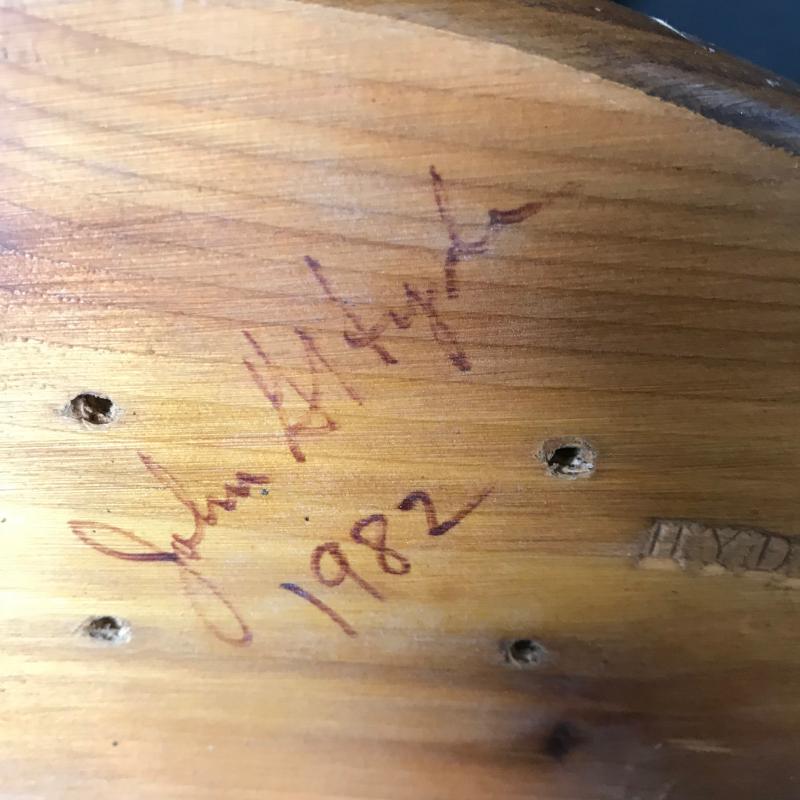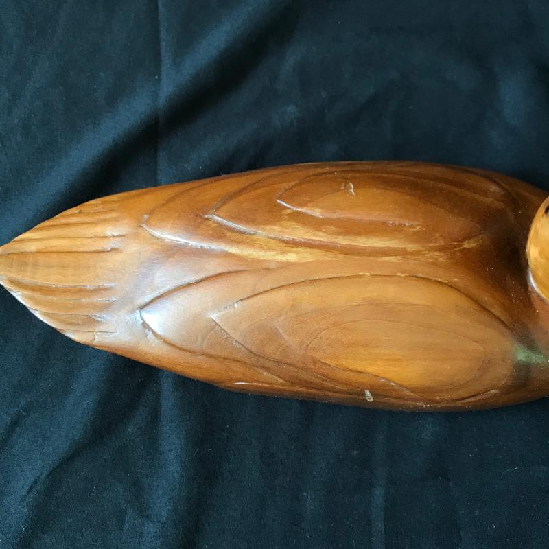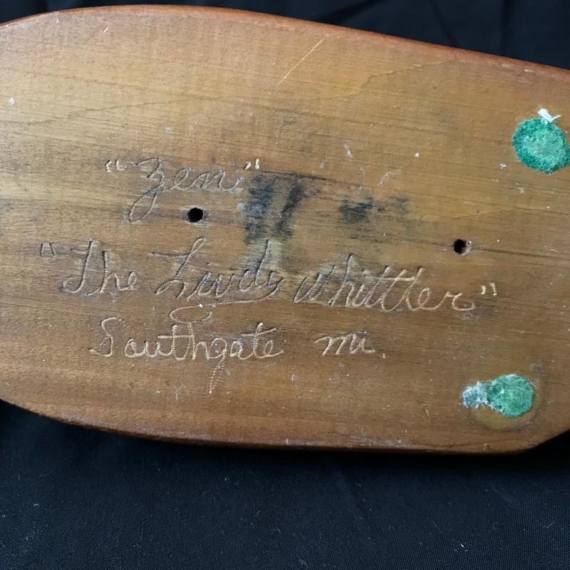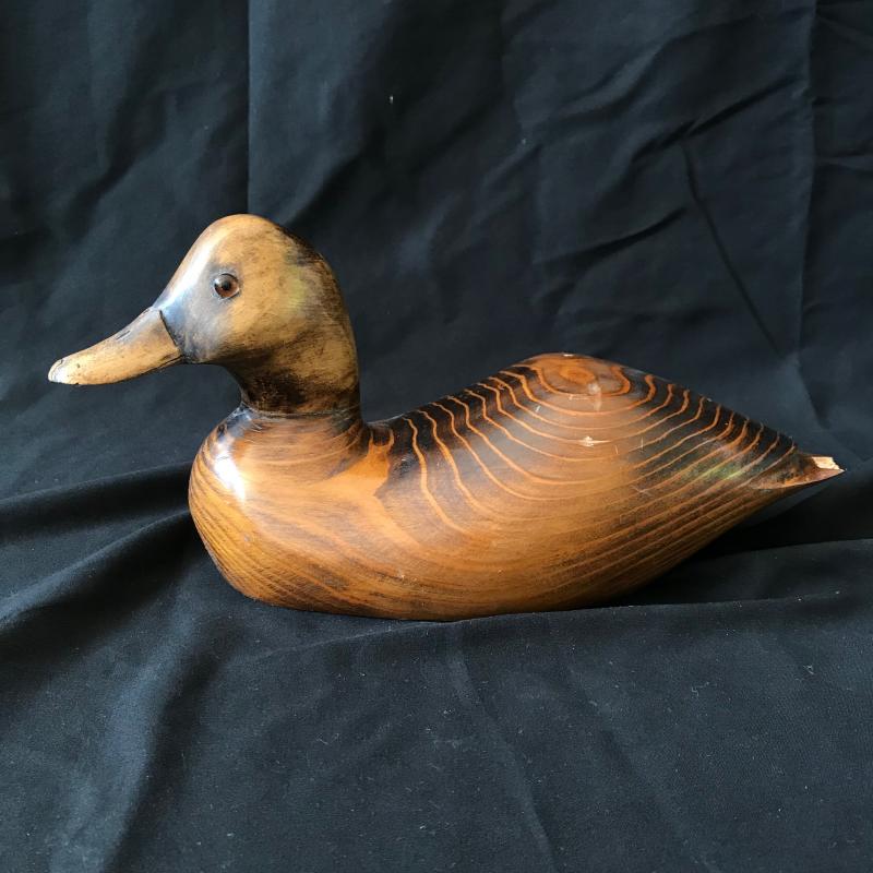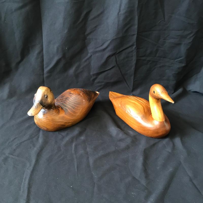 Two wooden duck decoys are signed and have glass eyes. One is signed by John Hyde in 1982 and has small chip on tail. Larger one is signed by Zen Lively and is approx. 13” long x 4” wide. See photos. Shipping available or local pickup in Hendersonville, NC.