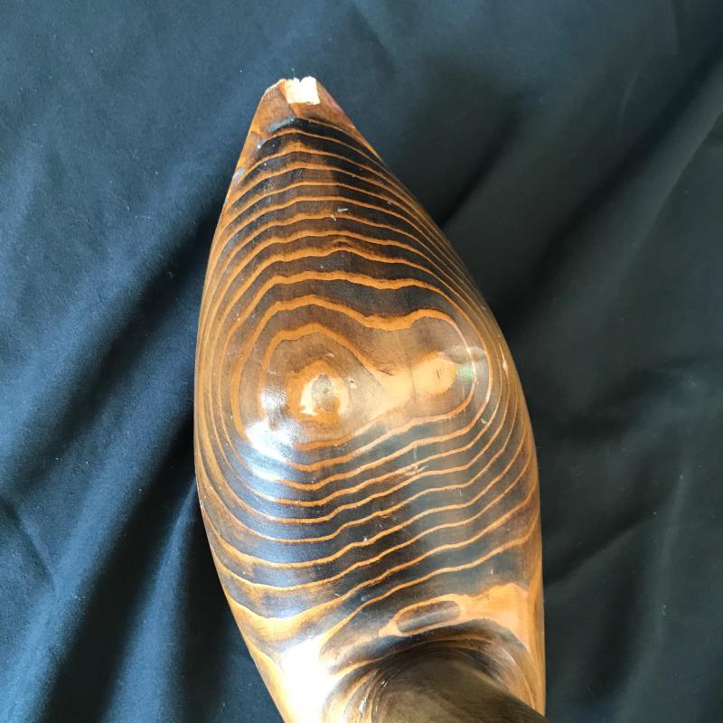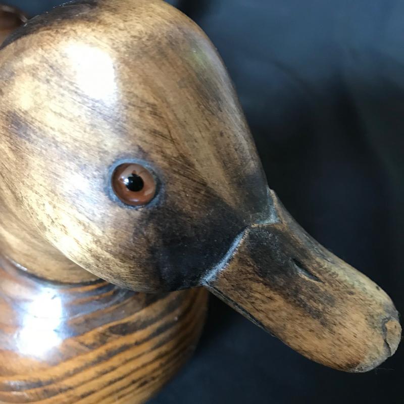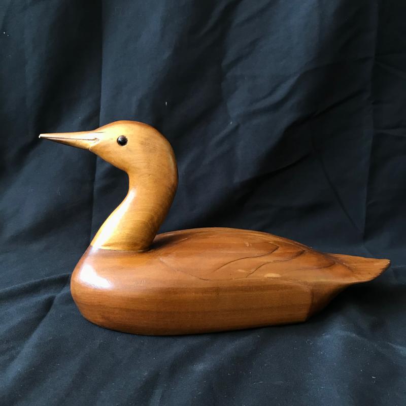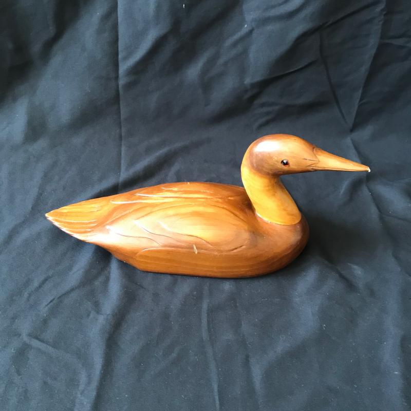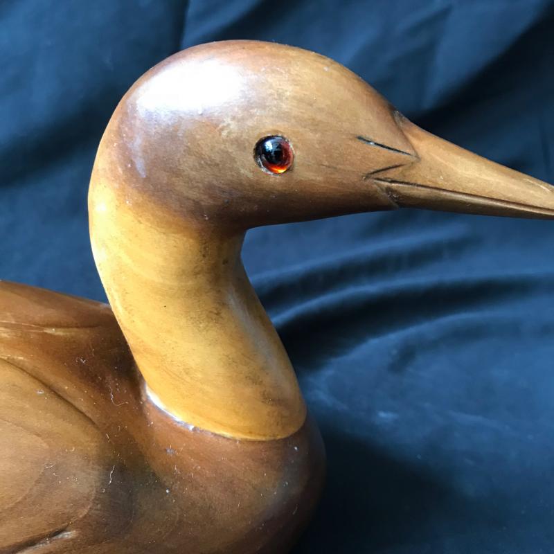 Two wooden duck decoys are signed and have glass eyes. One is signed by John Hyde in 1982 and has small chip on tail. Larger one is signed by Zen Lively and is approx. 13” long x 4” wide. See photos. Shipping available or local pickup in Hendersonville, NC.