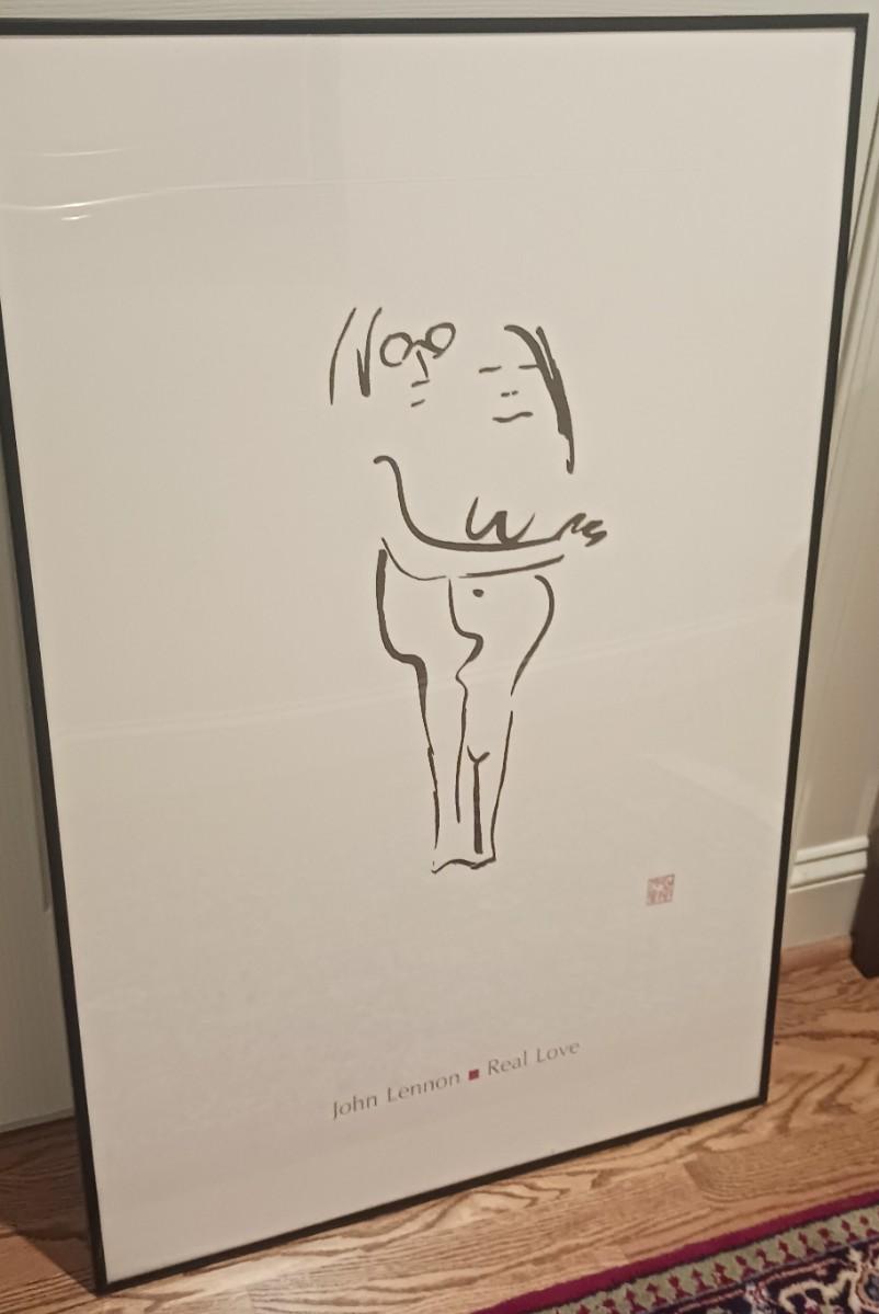 John Lennon Real Love poster professionally framed dry mounted in black metal frame. 24" wide 36" hgth