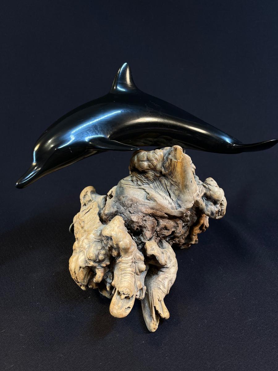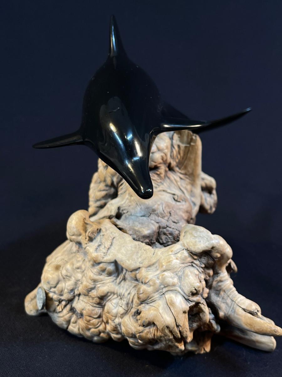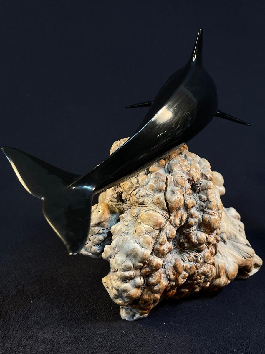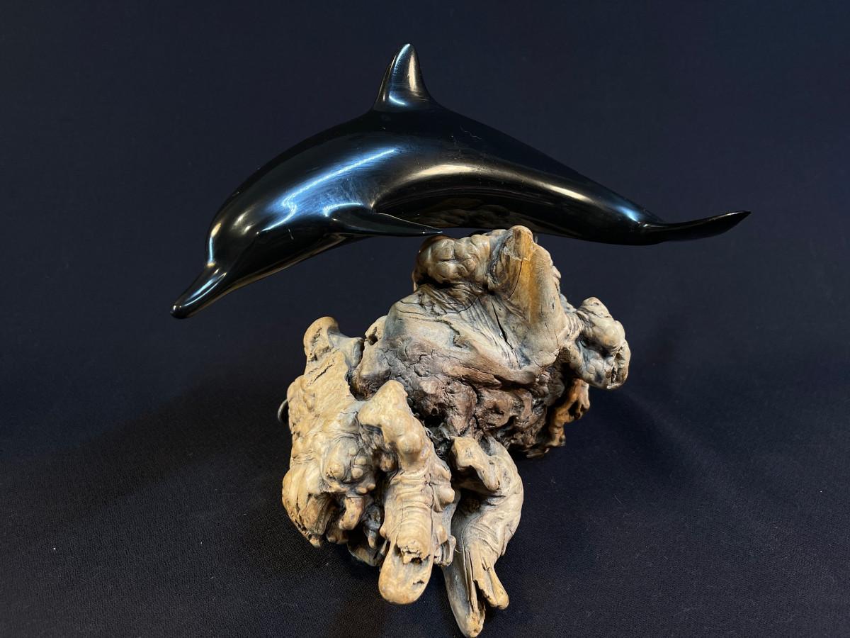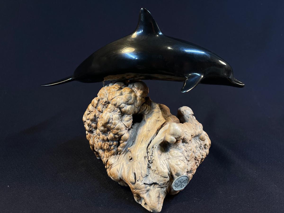 The subject item is an impressive leaping dolphin posed on a natural, burl wood base. The artist, John Perry, has wisely chosen to create an interesting pairing of rugged and sleek surfaces that highlight and animate the streamlined body of the gentle, playful, goddess of the sea. Retains the John Perry medallion.