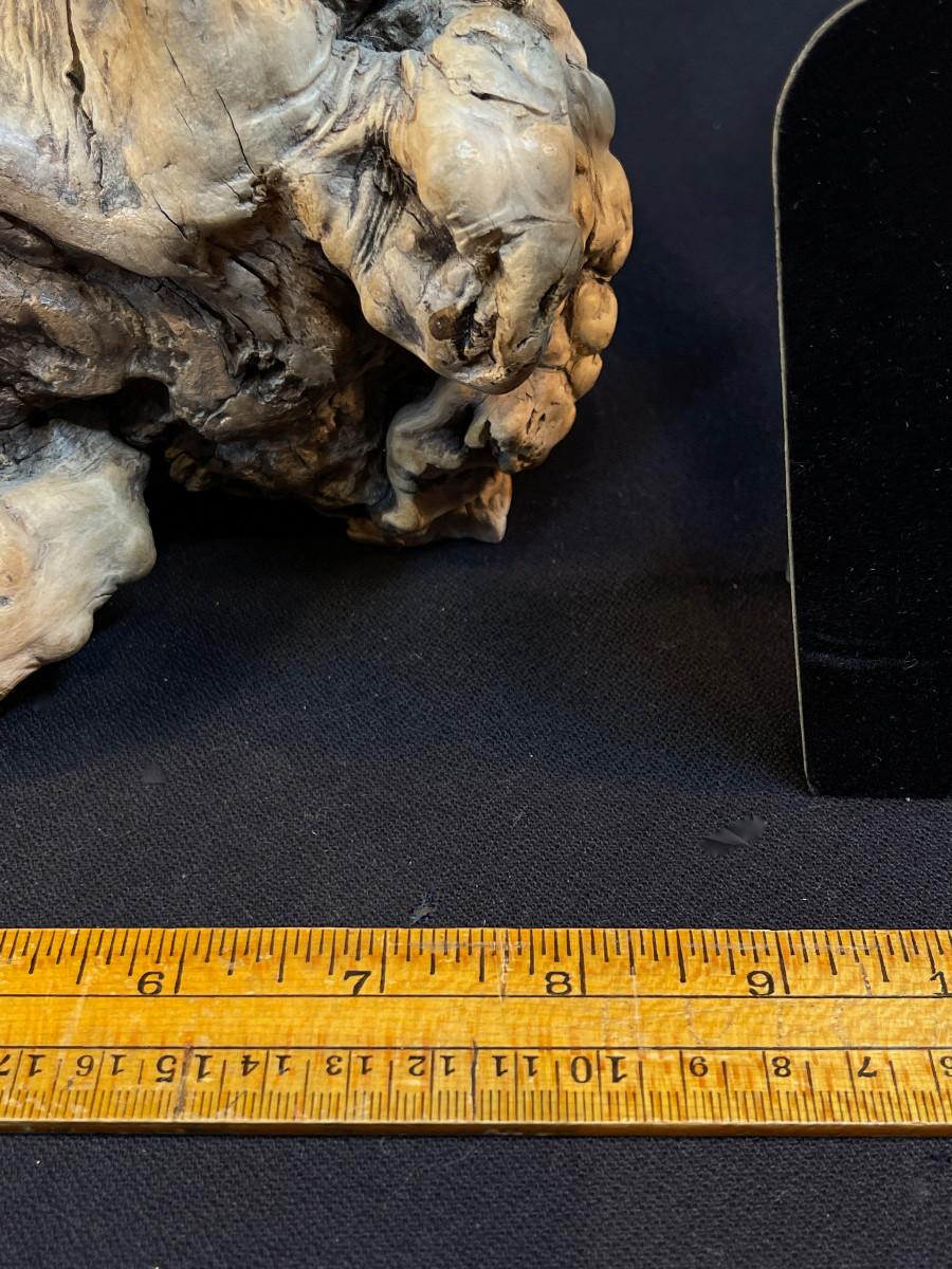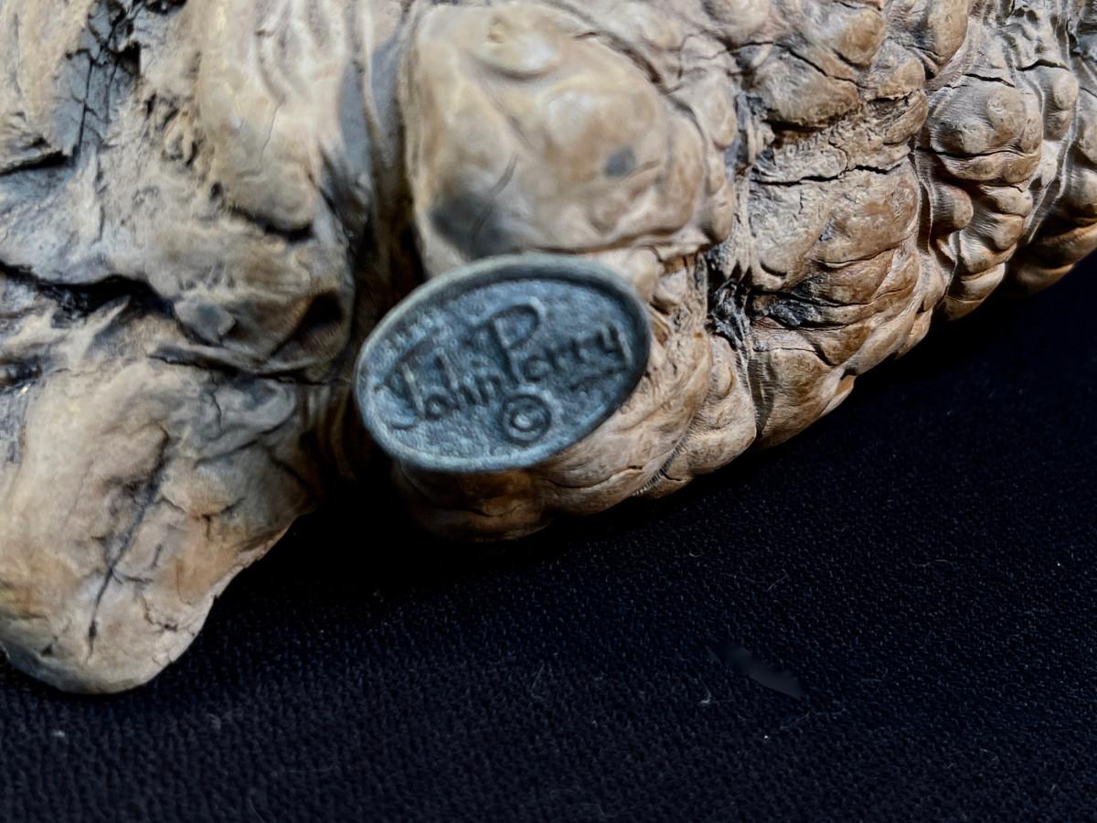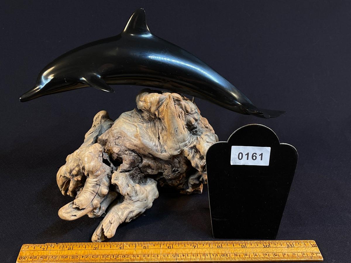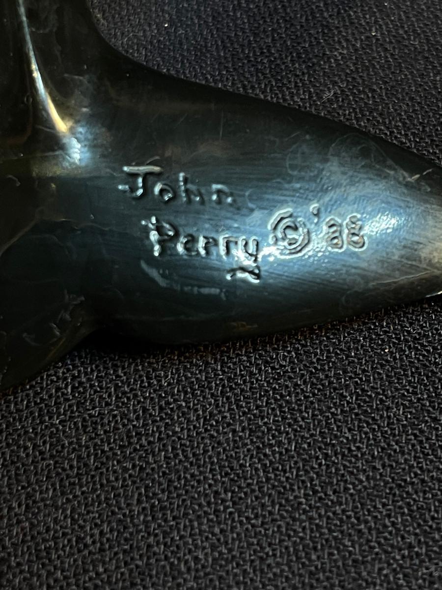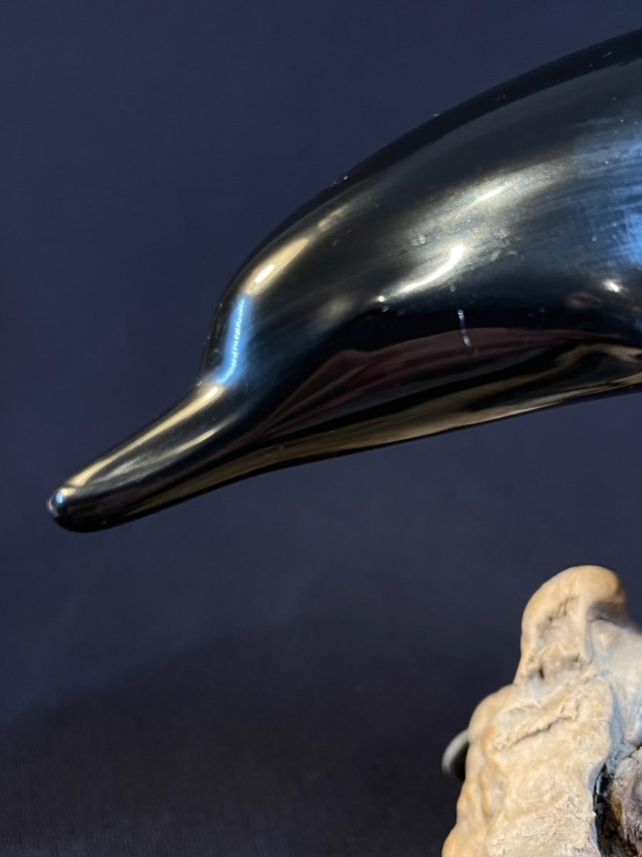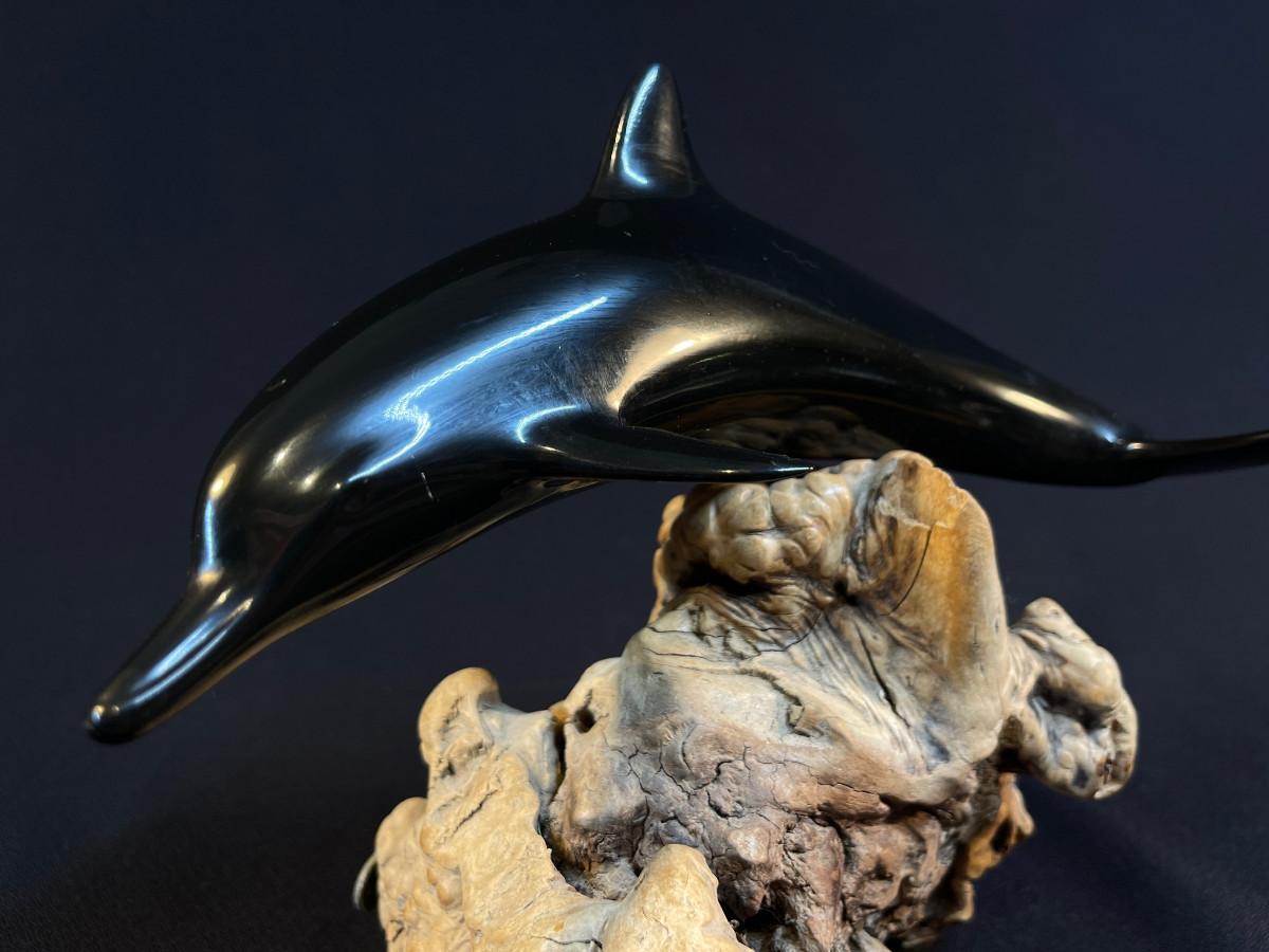 The subject item is an impressive leaping dolphin posed on a natural, burl wood base. The artist, John Perry, has wisely chosen to create an interesting pairing of rugged and sleek surfaces that highlight and animate the streamlined body of the gentle, playful, goddess of the sea. Retains the John Perry medallion.