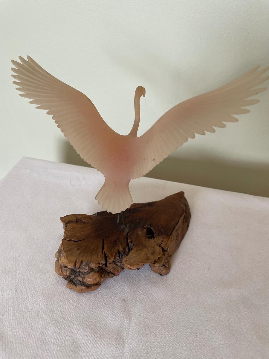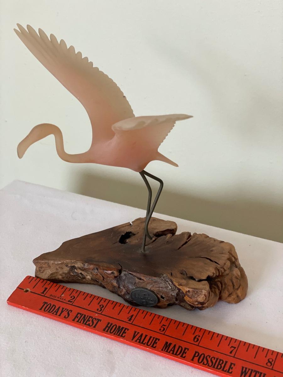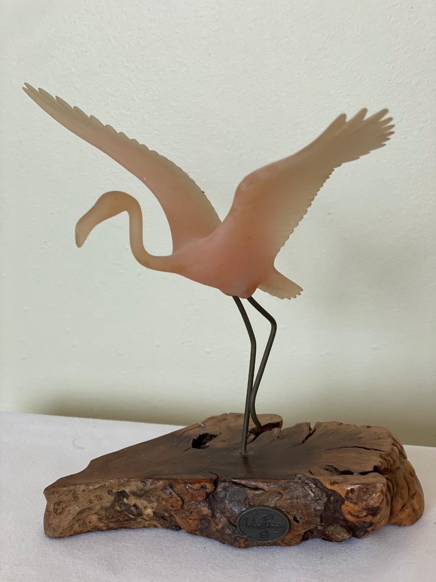 John Perry signed pink Flamingo in flight in burl wood