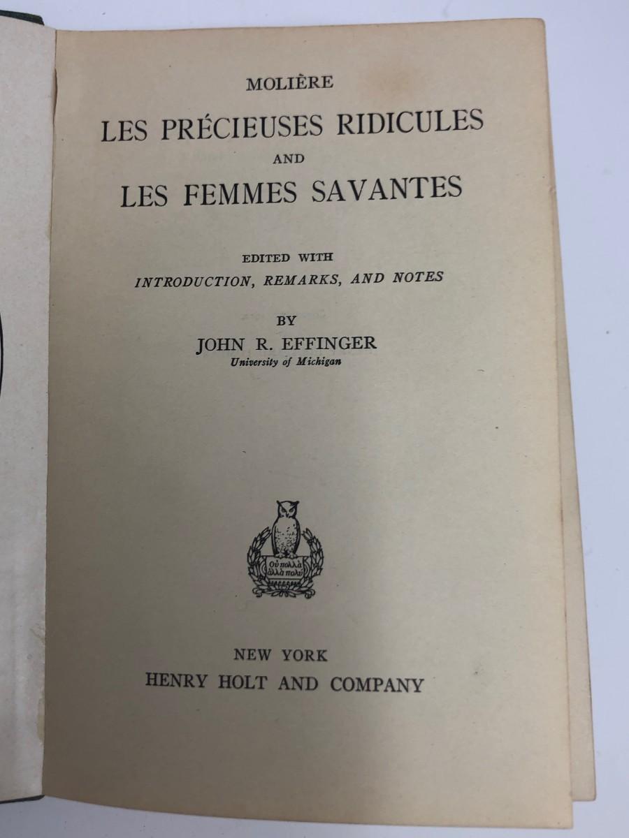 Description: Moliere Les Precieuses Ridicules and Les Femmes Savantes. New York: Henry Holt and Company 1912Measurement Approximately: 7” H.Material: Paper. Book cover has some wear and marking thru out book. Note: Hard Cover., 225 PP., Frontispiece of Moliere