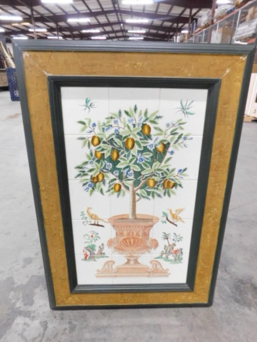 John Richard Framed Ceramic Tile Wall Art Fruit Tree in Urn with Flanked by Grasshoppers Choice A Expect some wear or scratches to the finish. Shipping option available via freight or local mover at Buyer's expense. Buyer must have all shipping scheduled within the stated dates and times of pickup. Recommended local mover is Beaty Bros. Moving 828-201-2982