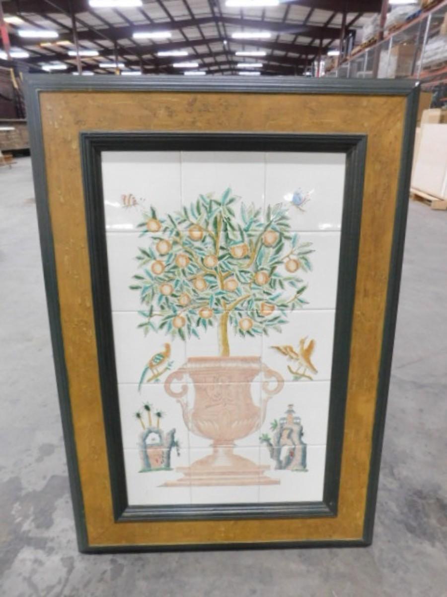 John Richard Framed Ceramic Tile Wall Art Fruit Tree in Urn with Flanked by Butterflies Expect some wear or scratches to the finish. Shipping option available via freight or local mover at Buyer's expense. Buyer must have all shipping scheduled within the stated dates and times of pickup. Recommended local mover is Beaty Bros. Moving 828-201-2982