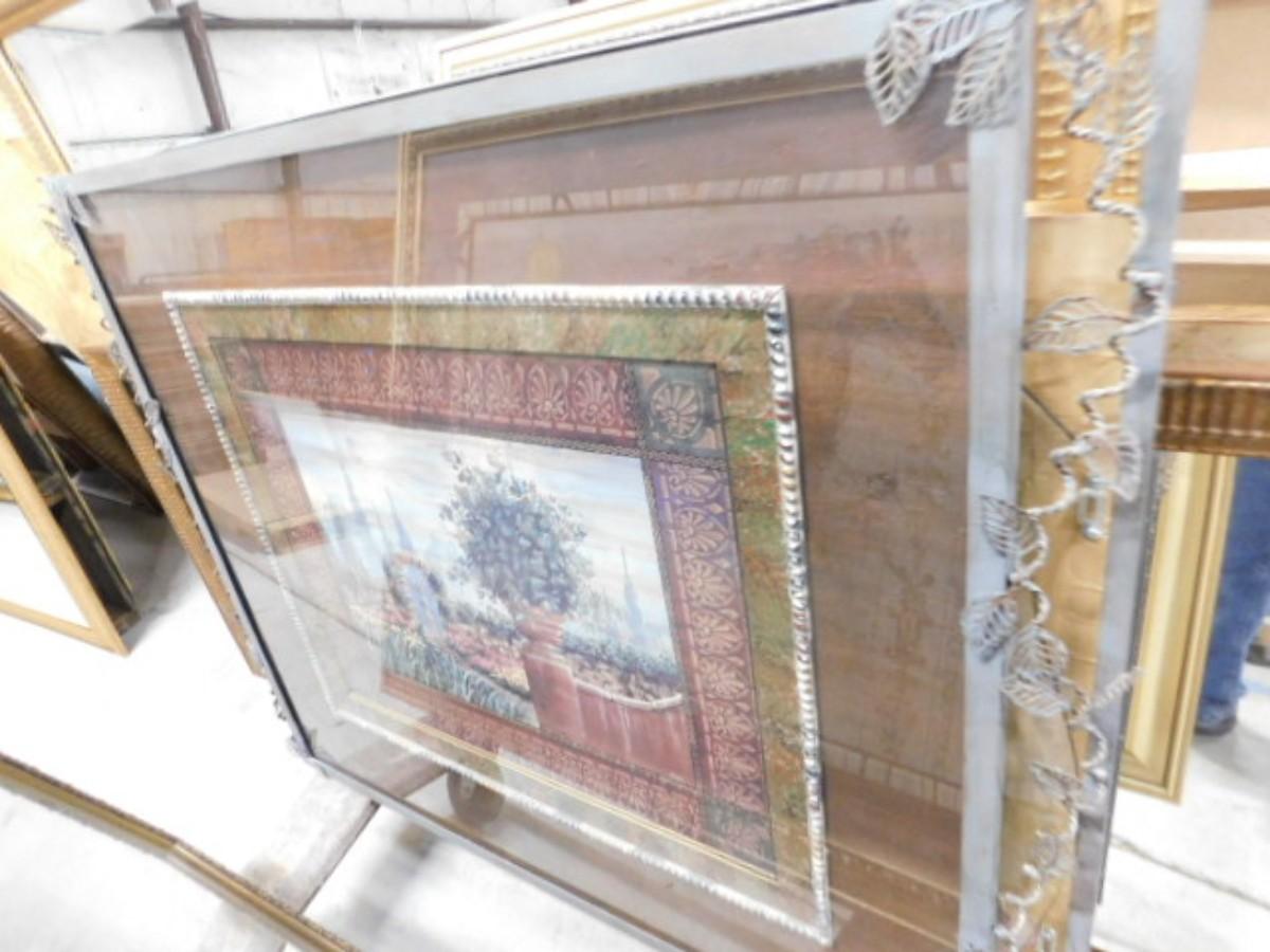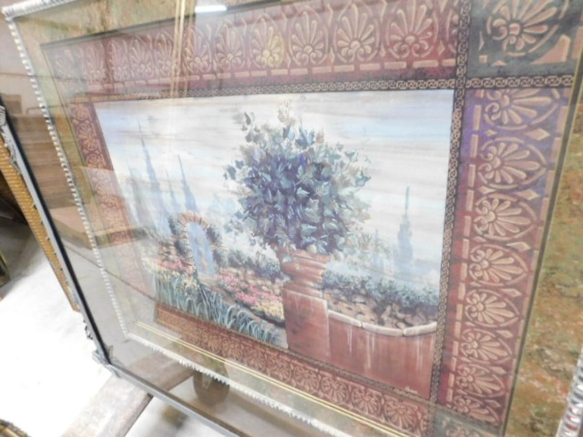 John Richard Metal Wrought Frame with Leaf Design English Garden Print in Decorative Relief Matting Choice B. Expect some wear or scratches to the finish. Shipping option available via freight or local mover at Buyer's expense. Buyer must have all shipping scheduled within the stated dates and times of pickup. Recommended local mover is Beaty Bros. Moving 828-201-2982