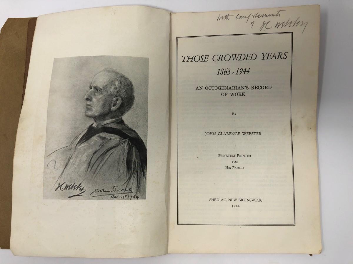 Description: John Webster Those Crowded Years 1863-1944 An Octogenarian's Record Of Work. Shediac, News Brunswick 1944; Measurement approximately: 10” H. Material: Paper. Note: Frontispiece., Signed by Author. Book Privately Printed. For His Family. Letter is enclosed from Authors Family mentioning the Book. Soft Cover. 51 PP.