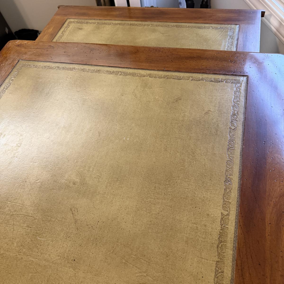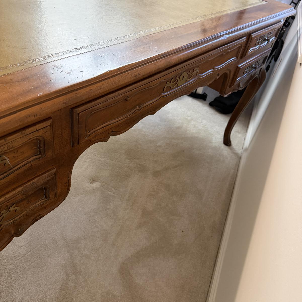 This stunning Louis XV style desk has a tooled leather insert top with five dovetailed drawers. Desk also has a 12” pullout on each side that also has tolled leather inserts. Desk measures 63” x 31” x 30”H and has a finished back. Key is included but is broken, see pictures. There is scratches and nicks on desk, see pictures.