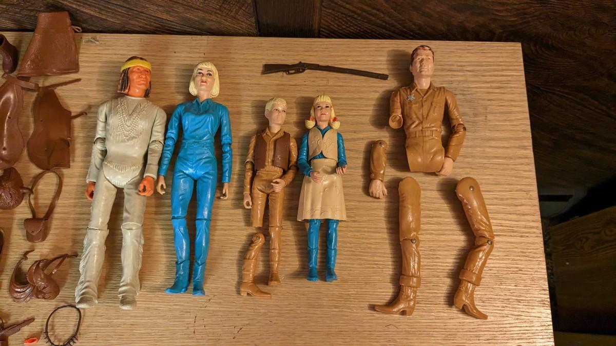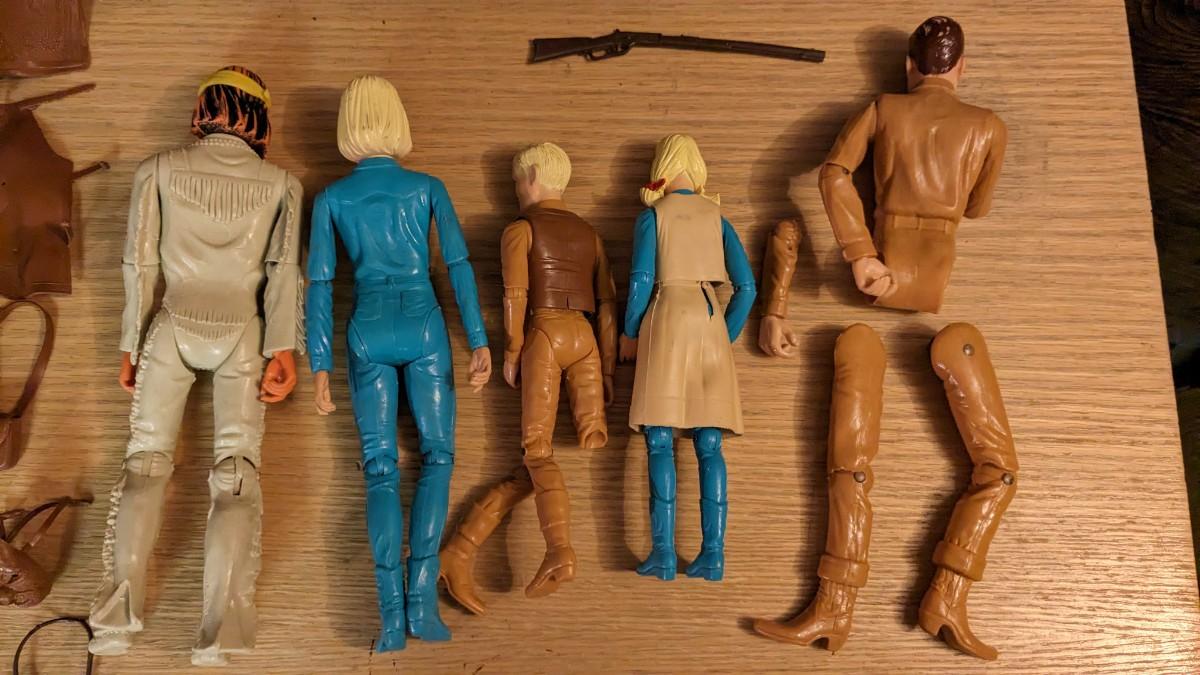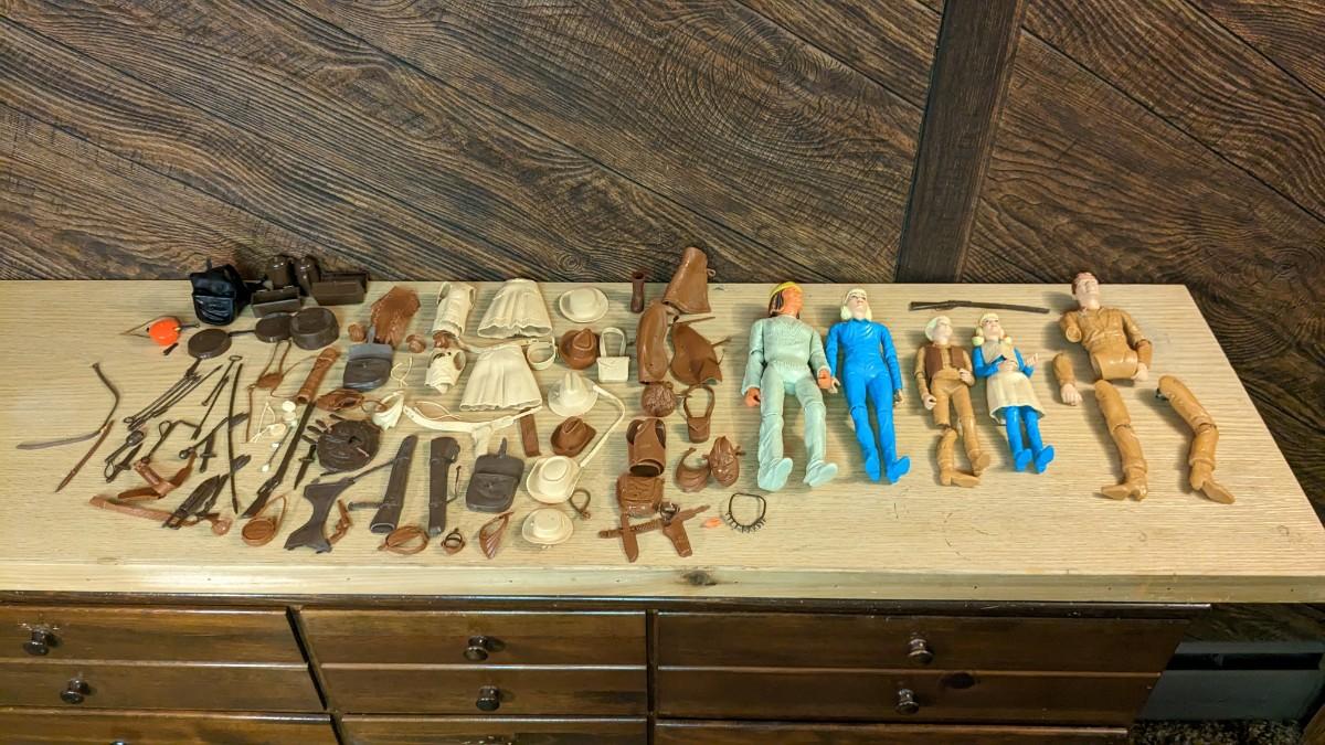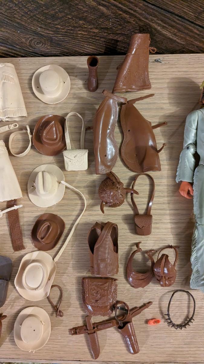 an impressive assortment of J&J accessories and some very well played with figures. Note flaws in photos. Horses can be found in lot 97. basement