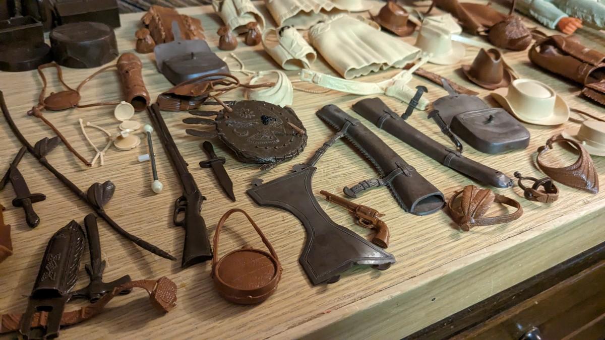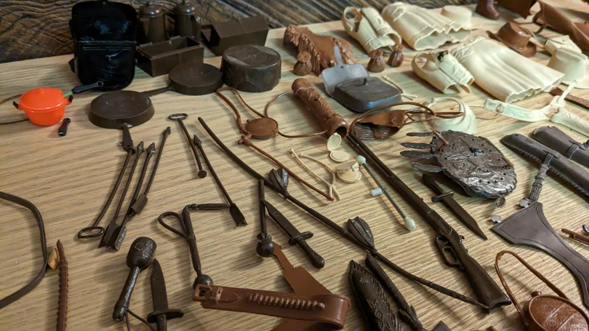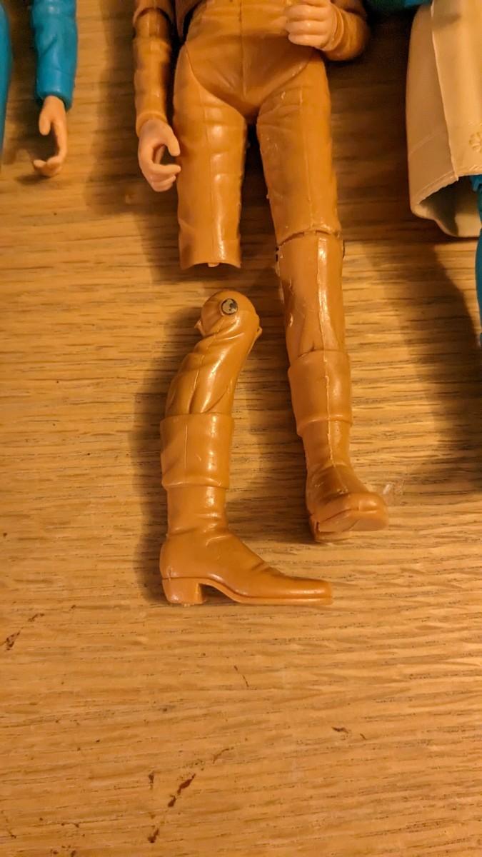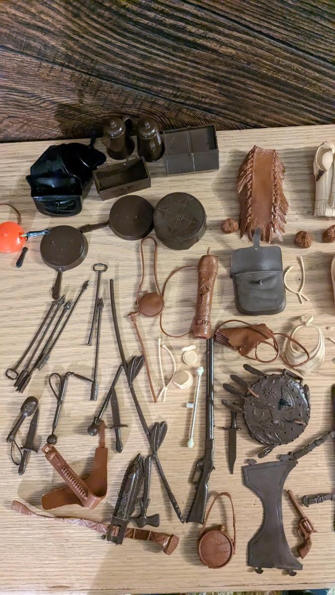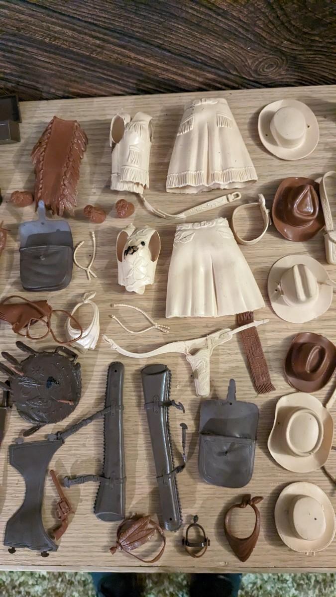 an impressive assortment of J&J accessories and some very well played with figures. Note flaws in photos. Horses can be found in lot 97. basement