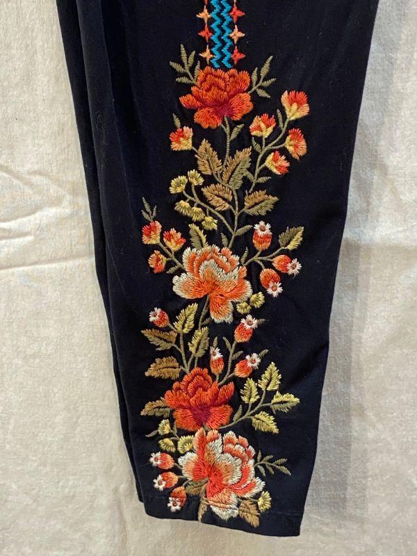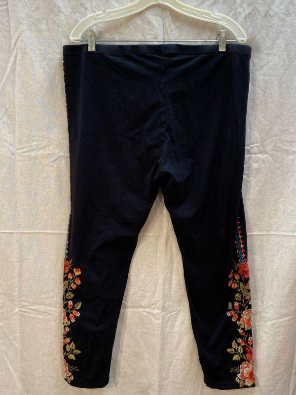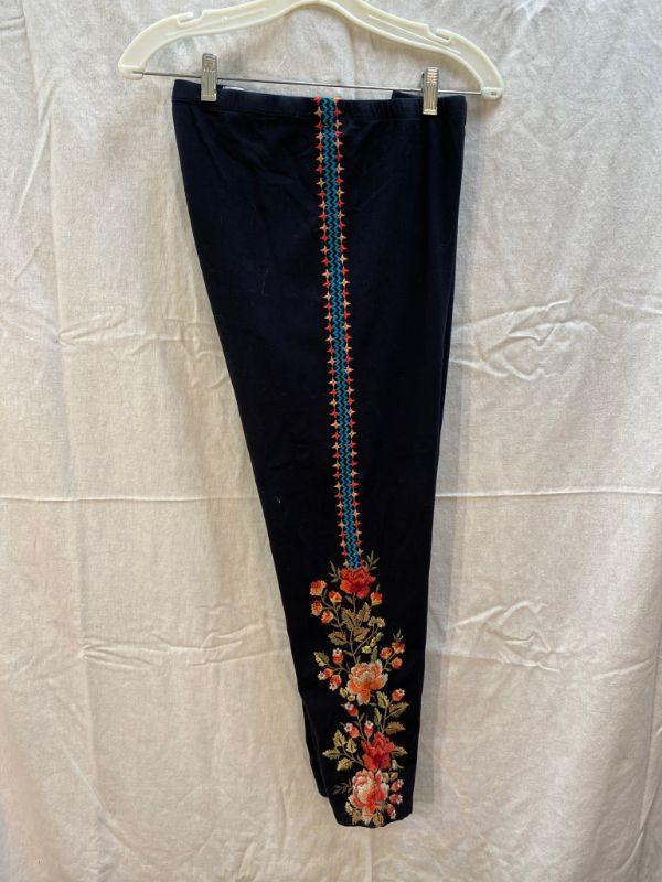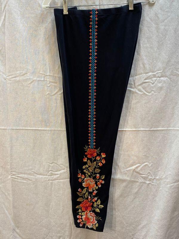 Johnny Was JW Los Angeles embroidered leggings. Striped down the outer seam with roses at the bottom. Nicely done. Size PXXL. They are ankle length maybe 7/8 length, but they are not capri. Good condition.