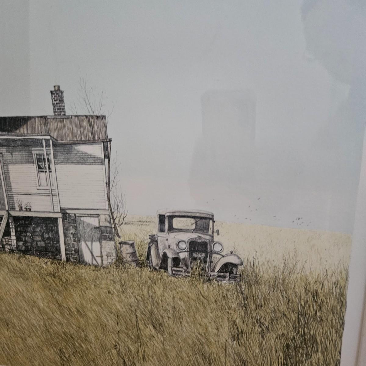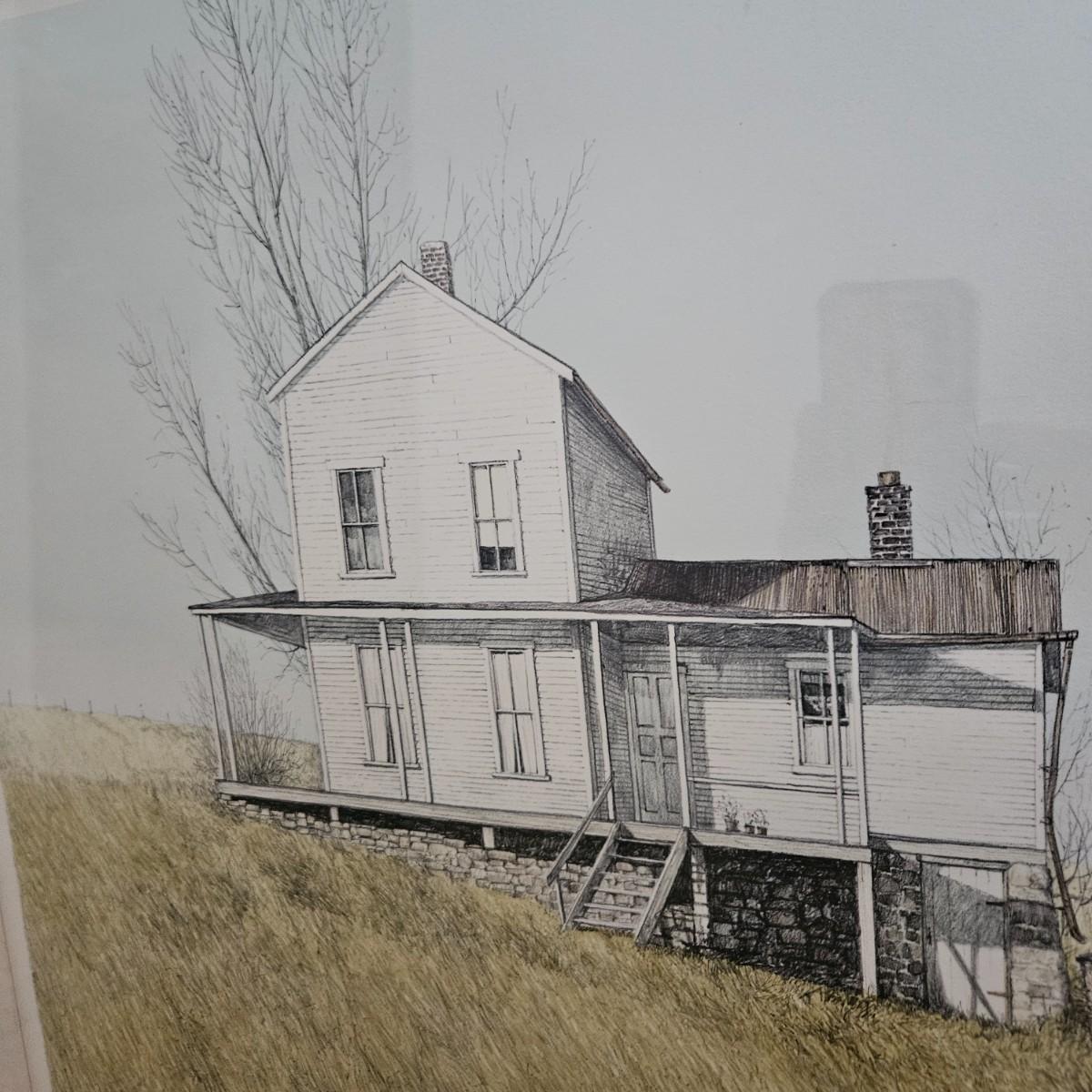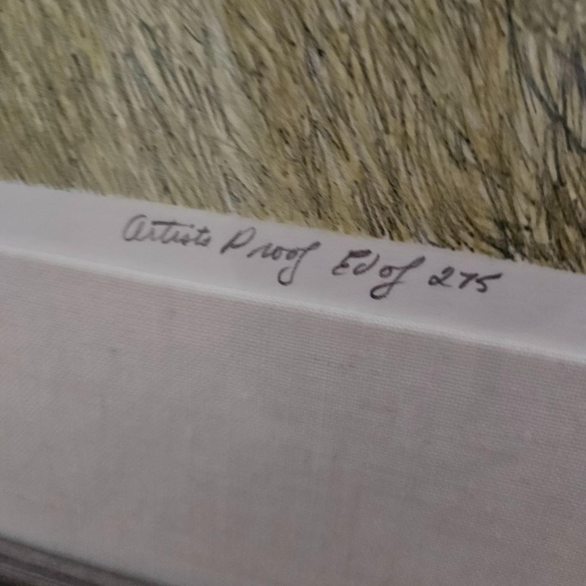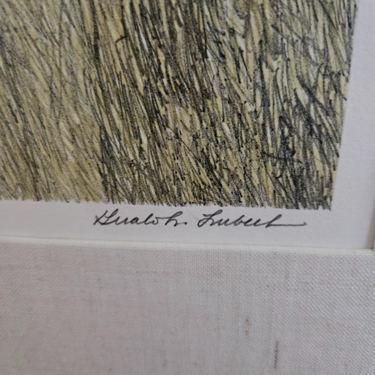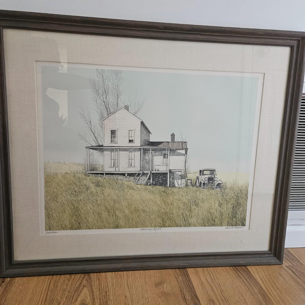 A custom framed artist proof edition titled "John's Place" signed by artist Gualoh Lubeck. It measures approximately 34" x 28". It has a wooden frame with a grey finish with a linen wrapped mat. Shipping available. Shipping can be costly. We suggest contacting our local shipping provider, Postage Express, with dimensions and getting an estimate before bidding: 828-670-5501 or email shipping@postageexpressnc.com.