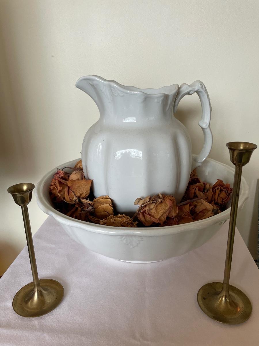 Johnson Bros. Antique water basin with 2 brass candle holders