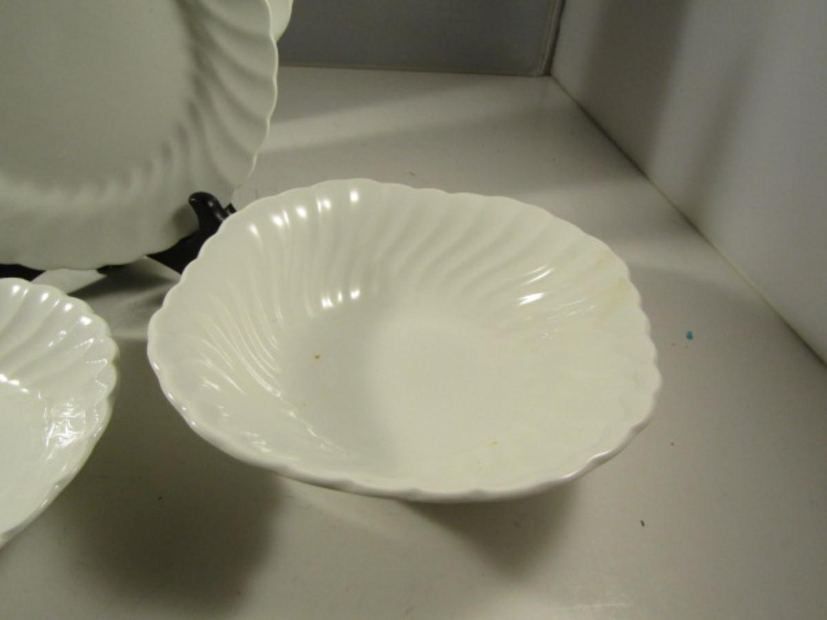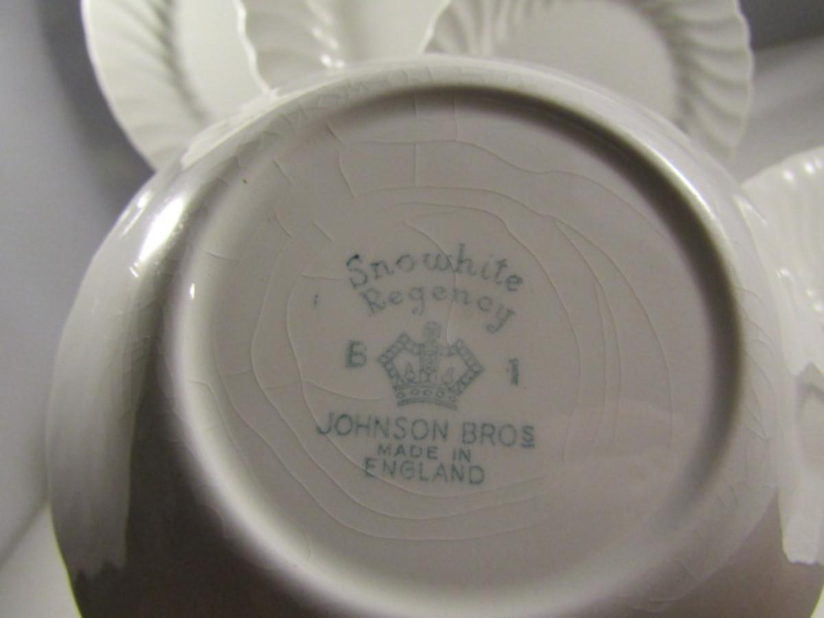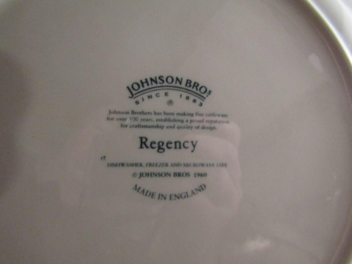Johnson Bros. 'Regency' Dinnerware- Approx 99 Pieces. Collection has different stamps- pieces may be different ages. 10 1/2 dinner plates- 4, 9 3/4" plates- 14, bread/dessert plates- 16, berry bowl- 4, square salad bowl- 17, cup- 19, saucer- 22, 8 1/4" vegetable bowl- 1, 9" oval platter- 1, 12" oval platter- 1.