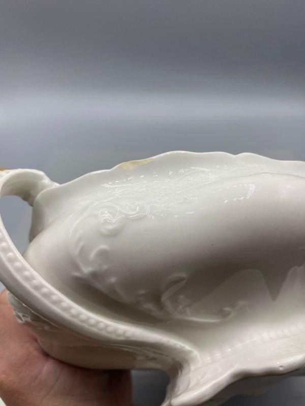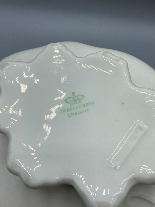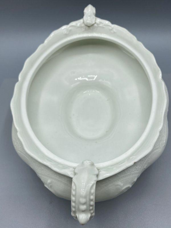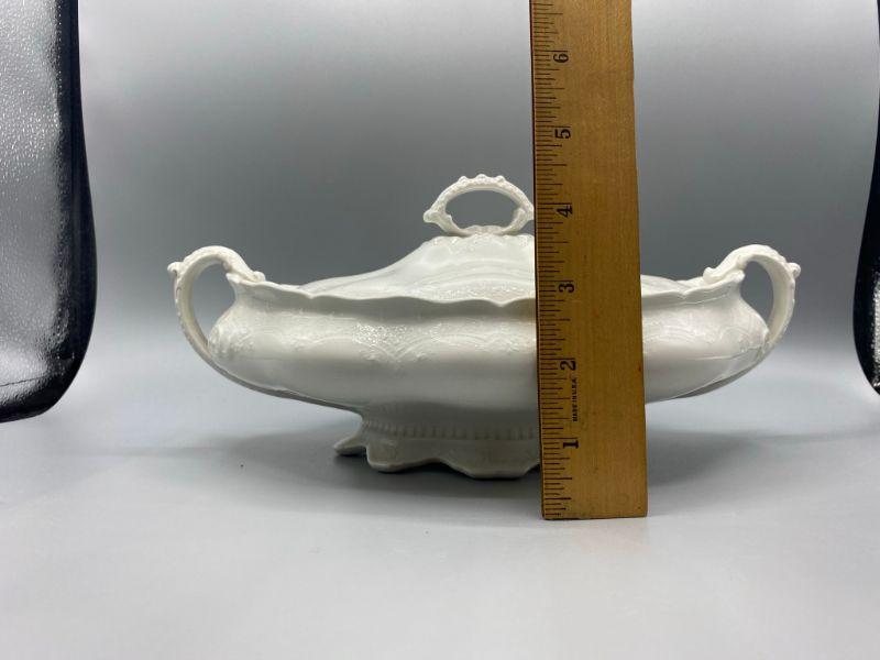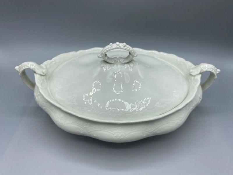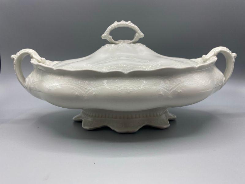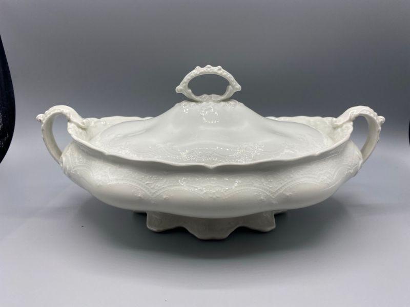 Vintage Johnson Bros white serving dish. Shallow, lidded dish with handles. Great to be used as a casserole dish, vegetable dish, or soup tureen. Solid white with white lace design, mix with any existing service set. About 10" wide, and 4.5" at top of lid. There is a chip in the rim. Displays nicely.