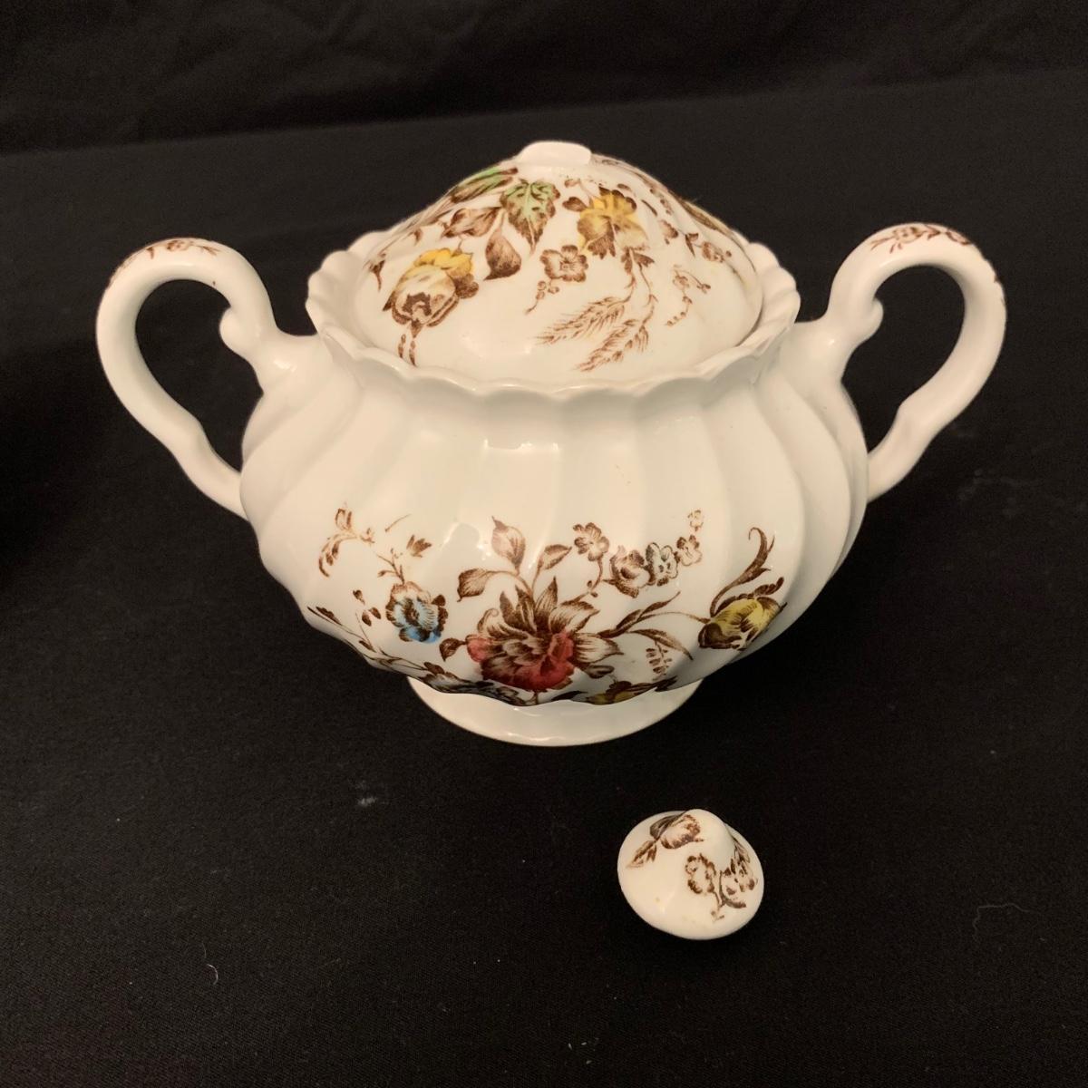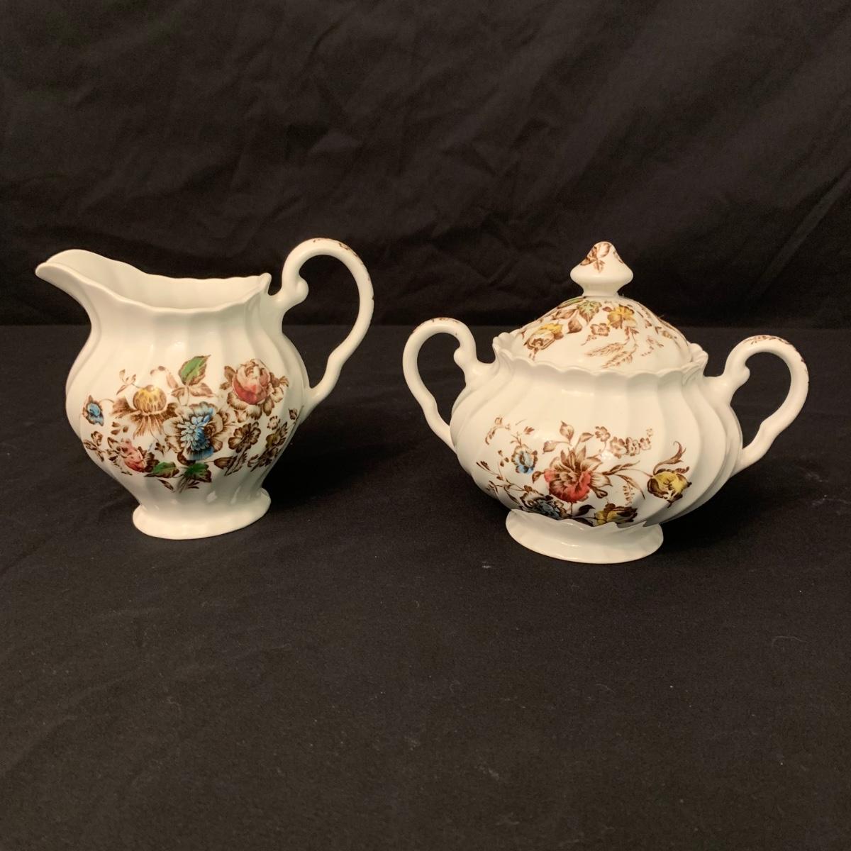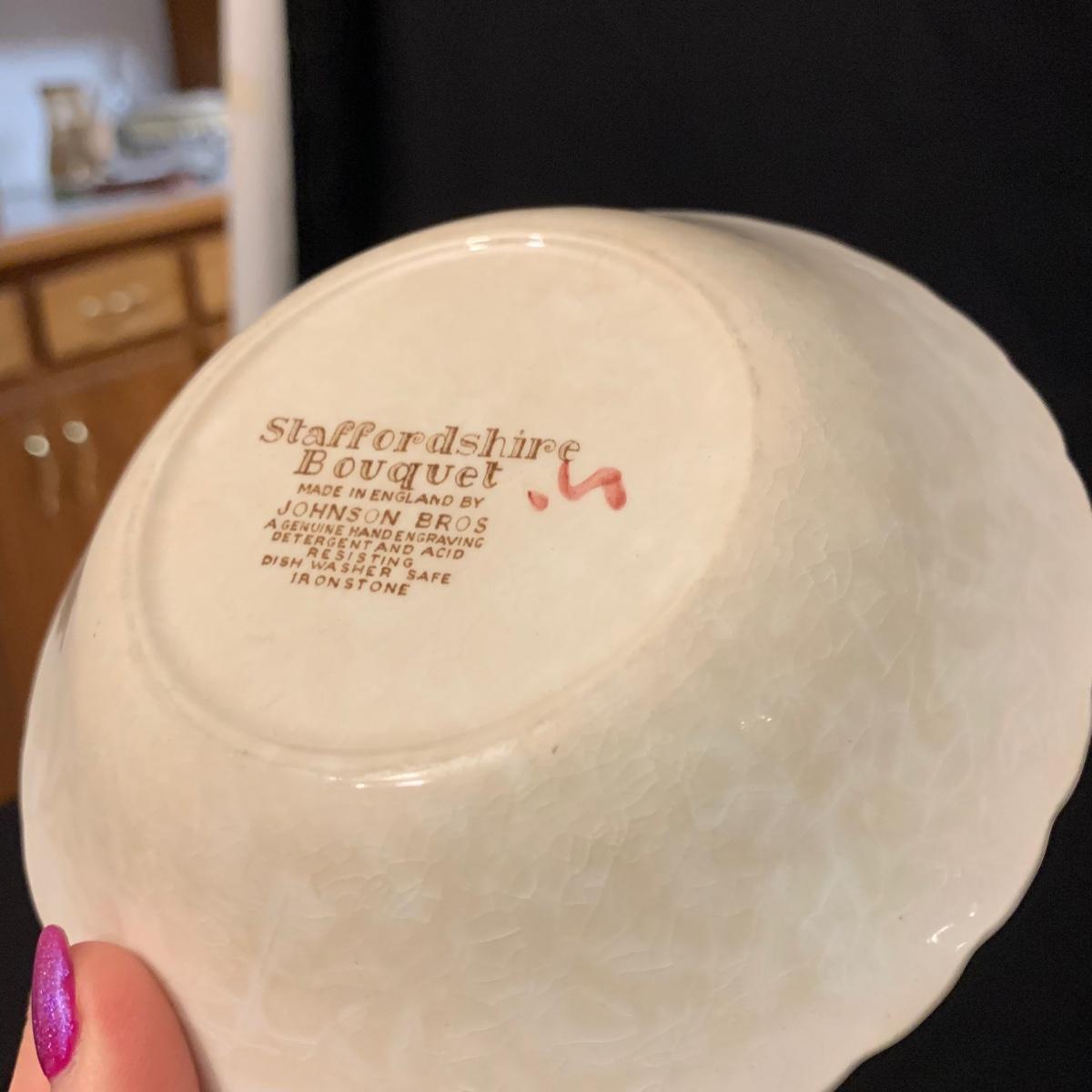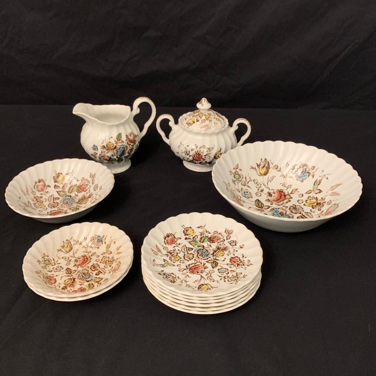 Ironstone China set made in England by the Johnson Bros., in the Staffordshire Bouquet design. Set comes with a milk pitcher and lidded sugar dish, one 8.25”D bowl, one 6”D bowl, two 5” dishes, and six 5.75”D saucers. The set is in pretty good condition with the exception of some slight staining on the two small dishes, a chip in one of the saucers, and the top handle of the sugar dish lid is broken off. It is included and can be glued on. Shipping available.