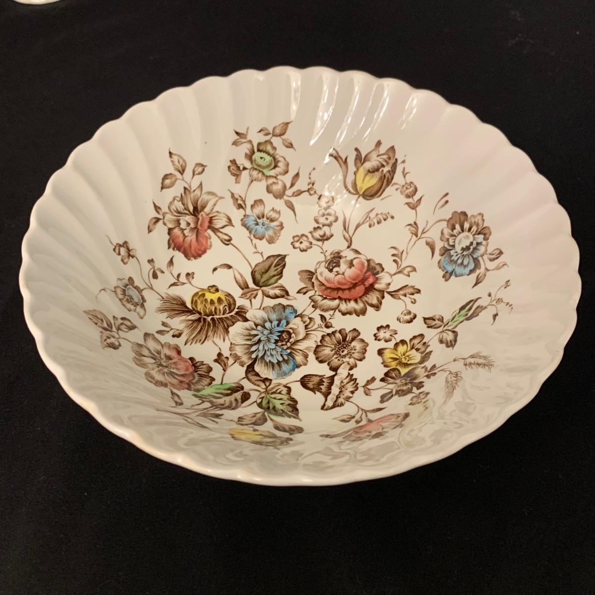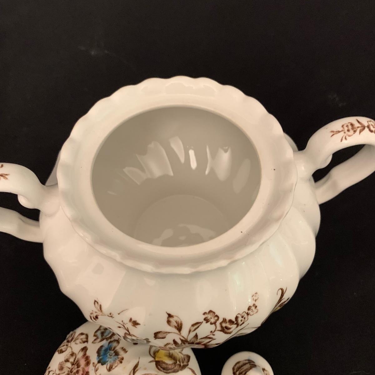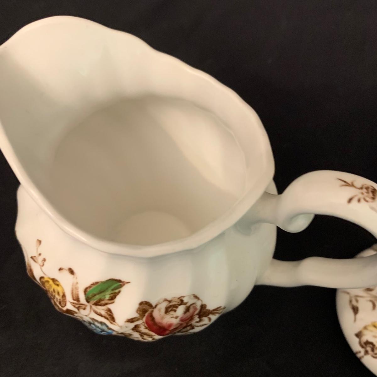 Ironstone China set made in England by the Johnson Bros., in the Staffordshire Bouquet design. Set comes with a milk pitcher and lidded sugar dish, one 8.25”D bowl, one 6”D bowl, two 5” dishes, and six 5.75”D saucers. The set is in pretty good condition with the exception of some slight staining on the two small dishes, a chip in one of the saucers, and the top handle of the sugar dish lid is broken off. It is included and can be glued on. Shipping available.
