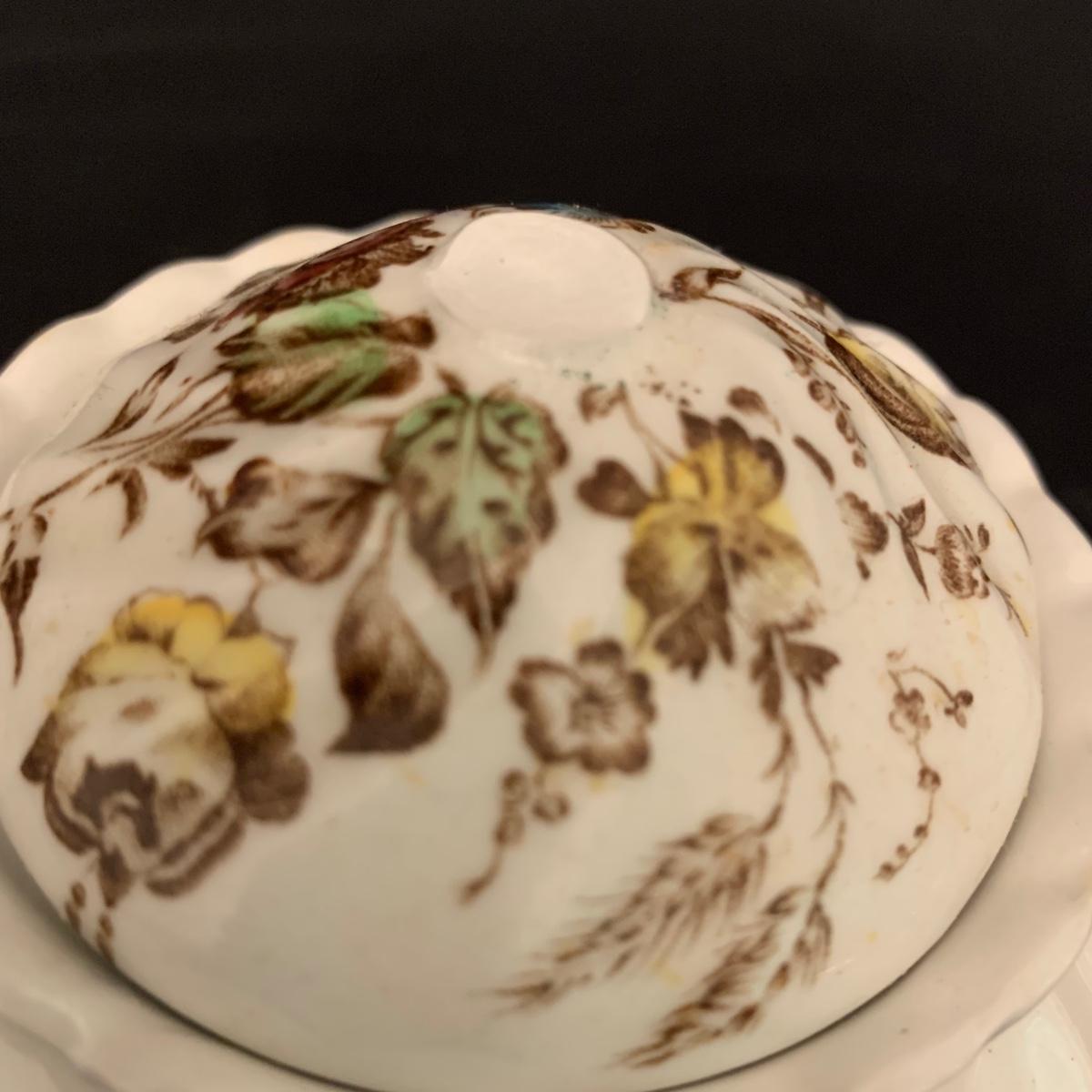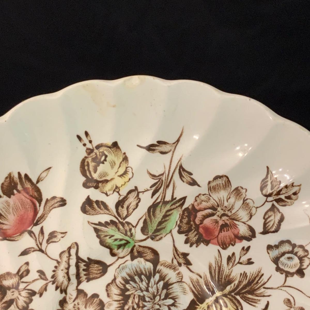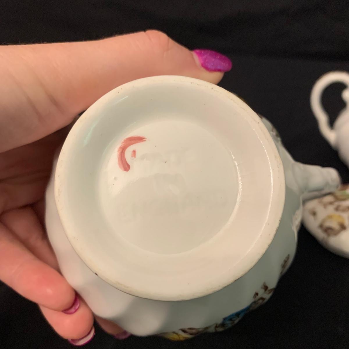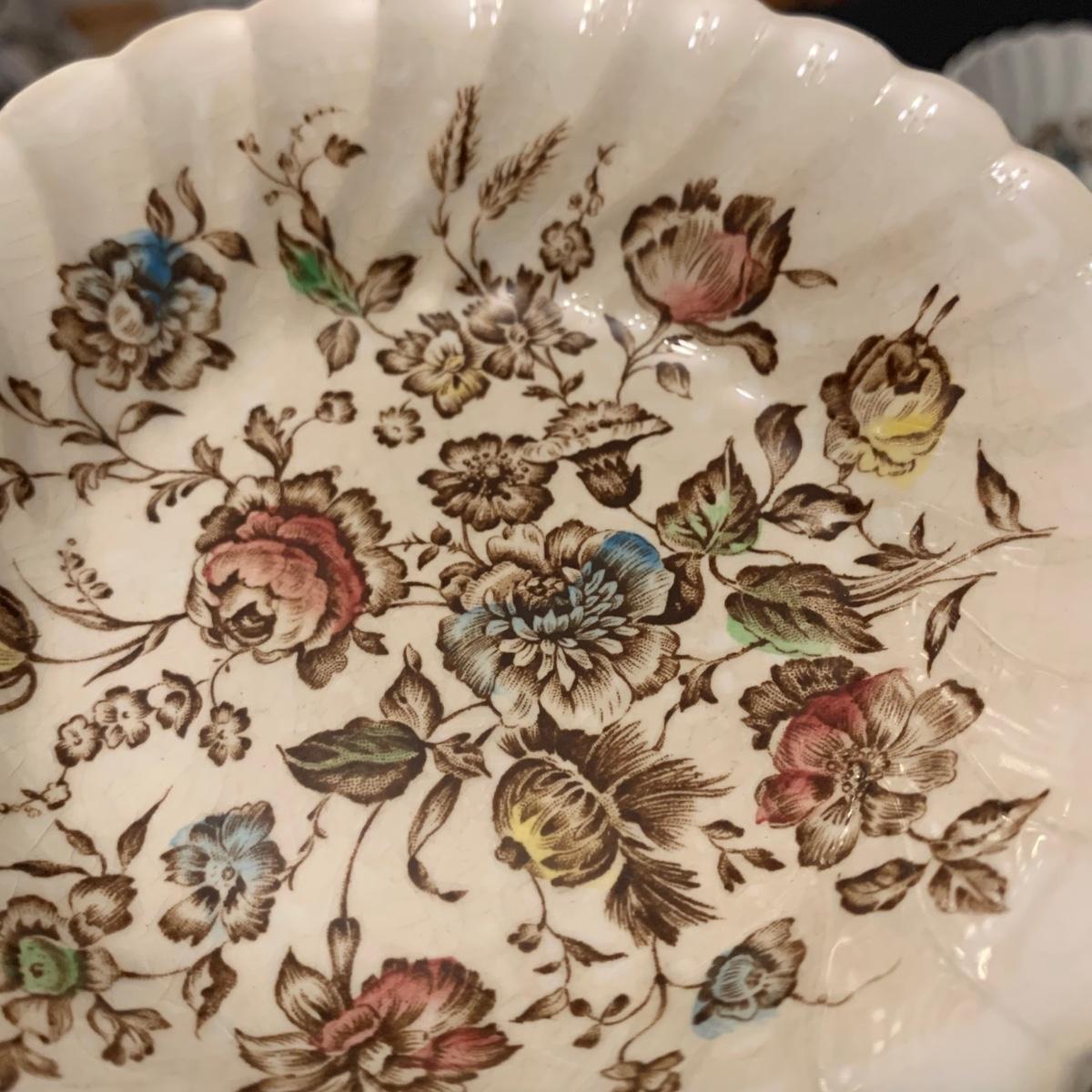 Ironstone China set made in England by the Johnson Bros., in the Staffordshire Bouquet design. Set comes with a milk pitcher and lidded sugar dish, one 8.25”D bowl, one 6”D bowl, two 5” dishes, and six 5.75”D saucers. The set is in pretty good condition with the exception of some slight staining on the two small dishes, a chip in one of the saucers, and the top handle of the sugar dish lid is broken off. It is included and can be glued on. Shipping available.