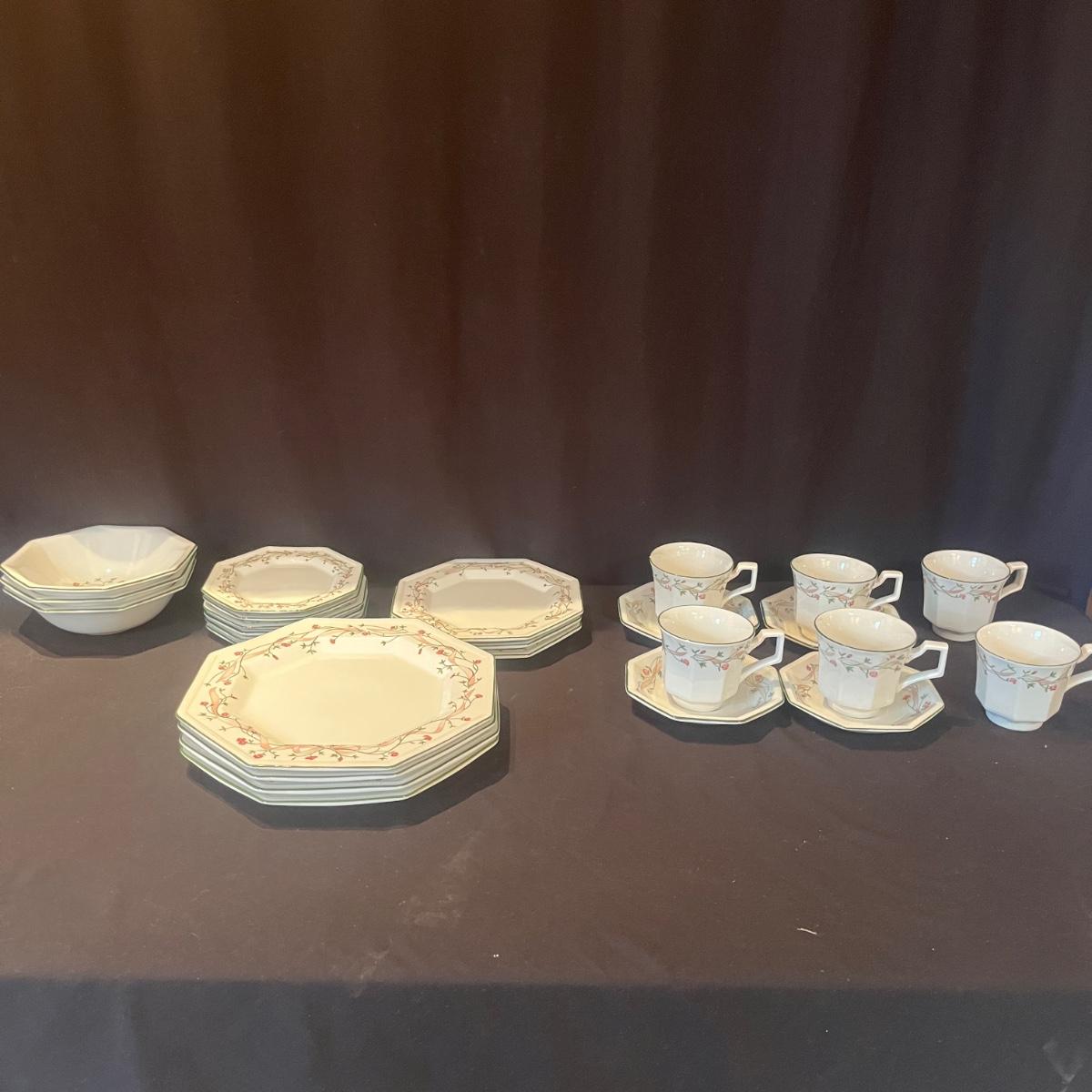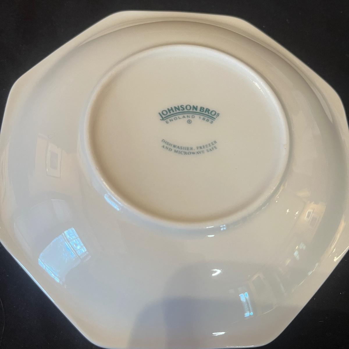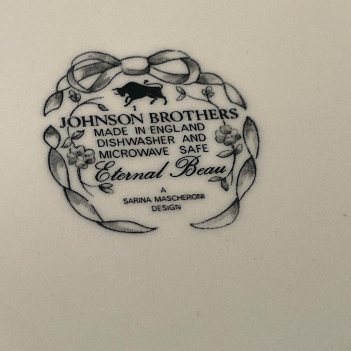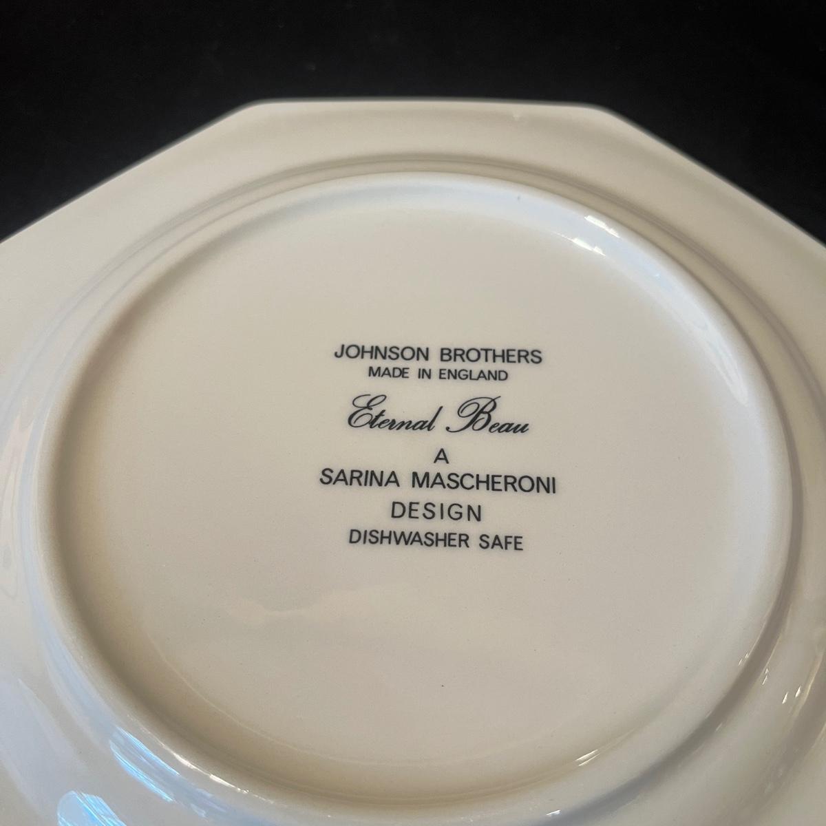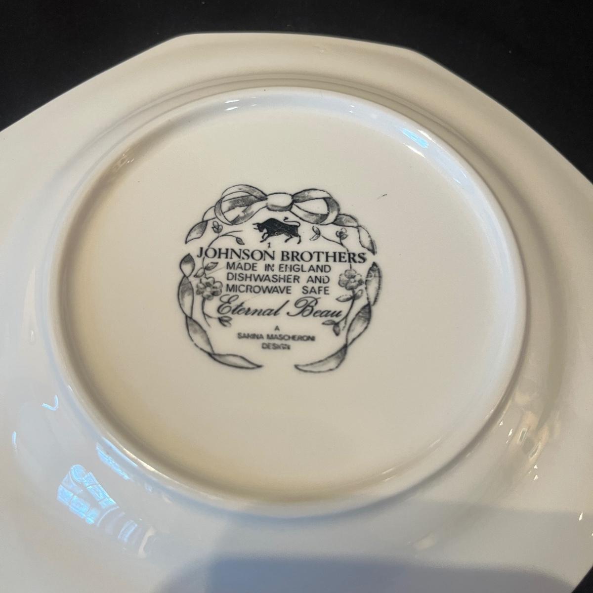 This selection of Johnson Brothers China in Eternal Beau print includes four dinner plates, three medium plates, six small plates, six teacups, four saucers and three bowls. Dinner plates measure 10”D.