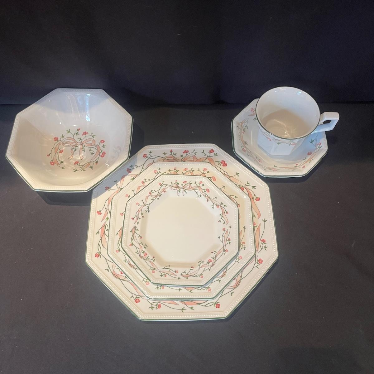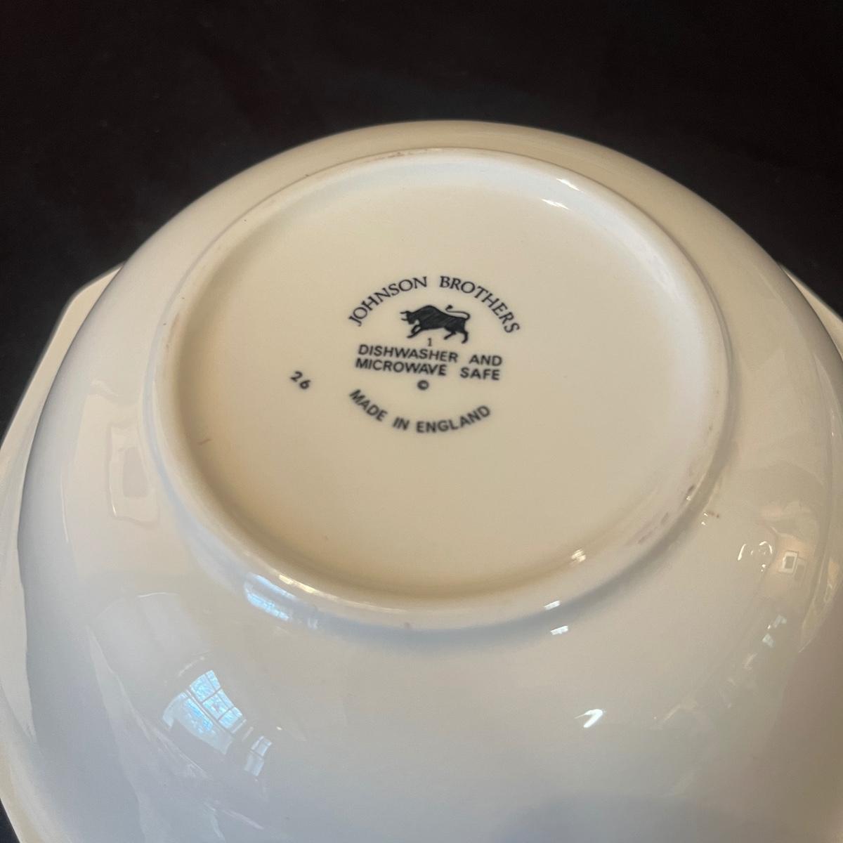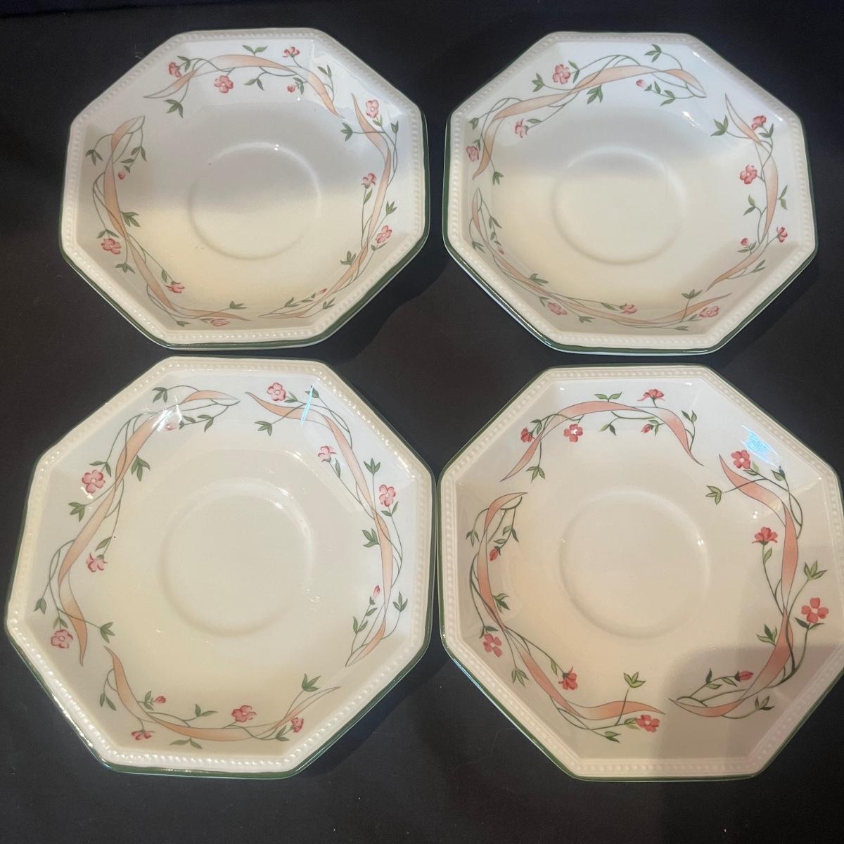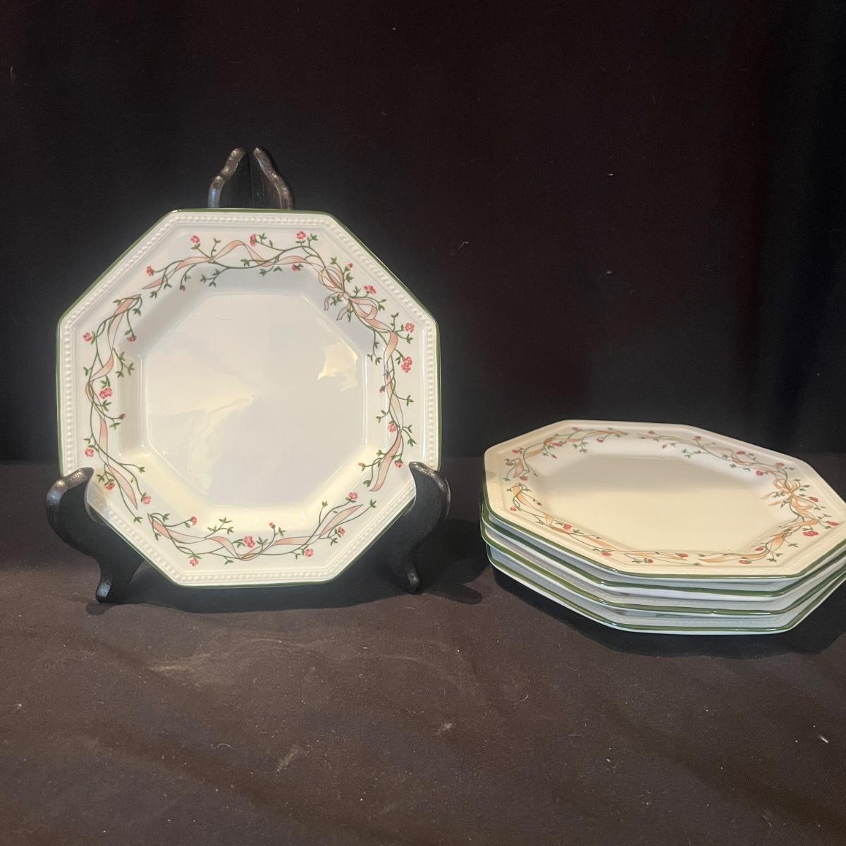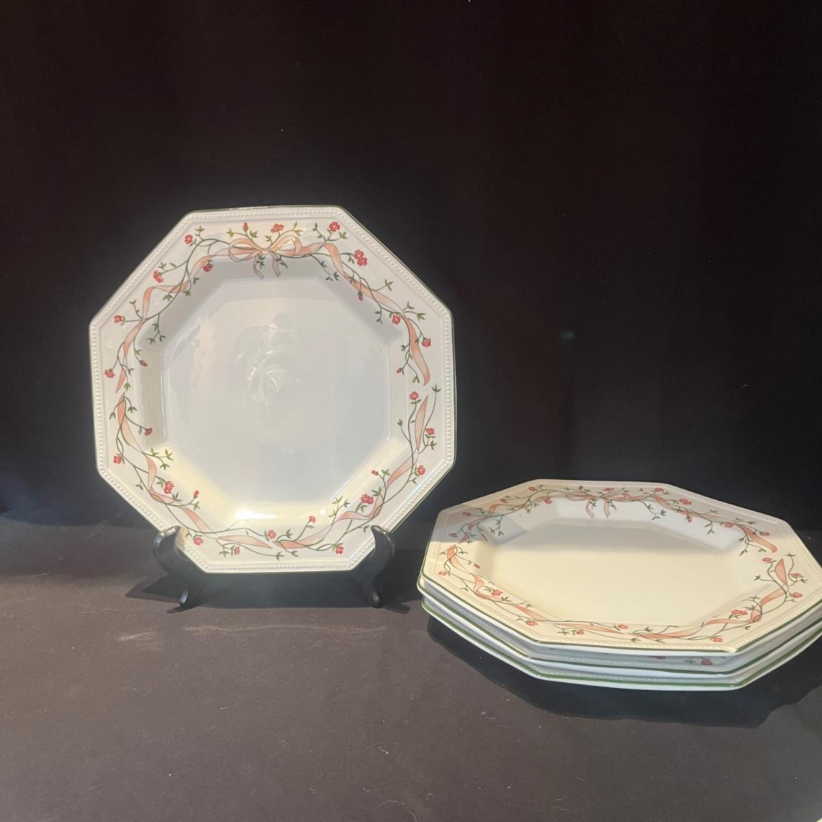 This selection of Johnson Brothers China in Eternal Beau print includes four dinner plates, three medium plates, six small plates, six teacups, four saucers and three bowls. Dinner plates measure 10”D.