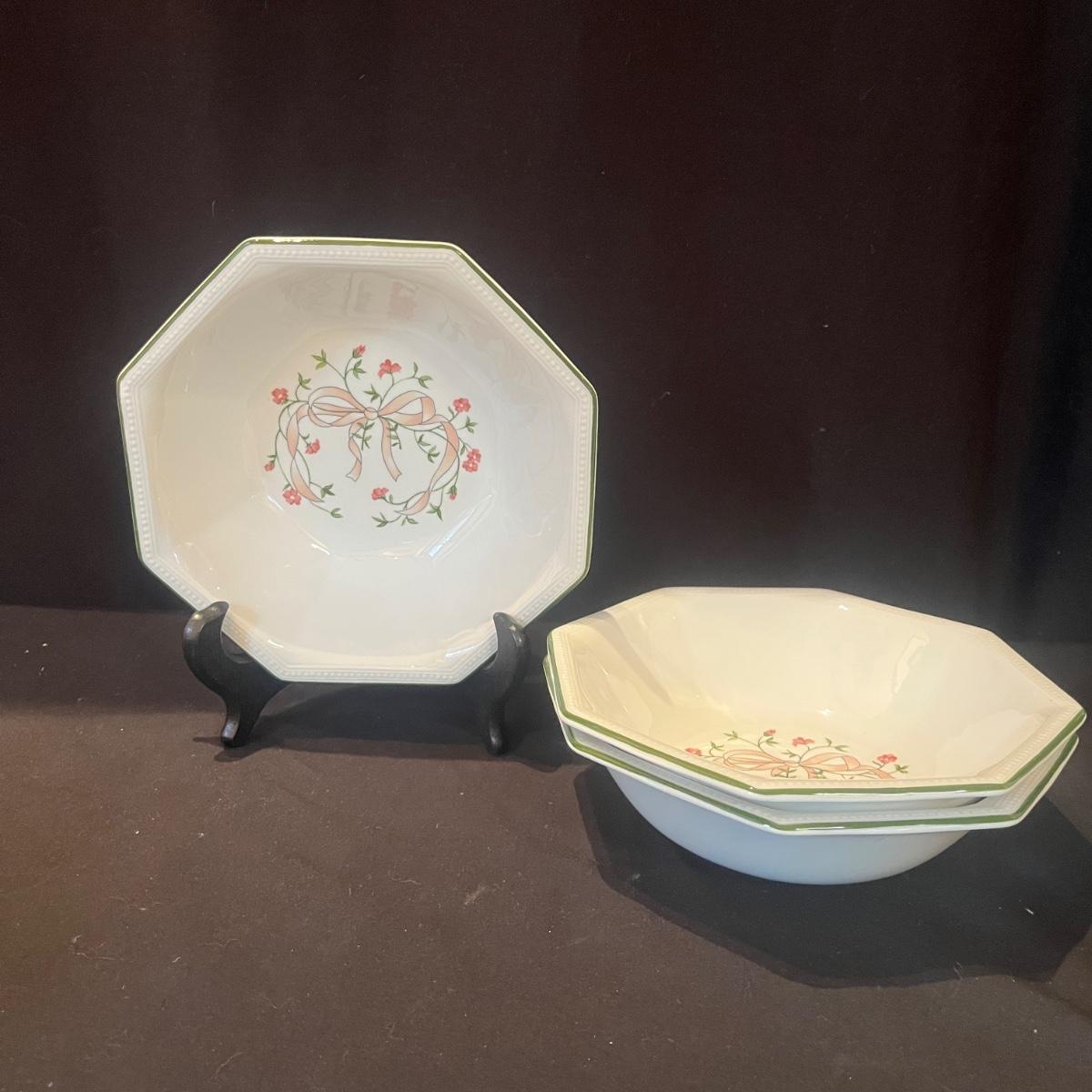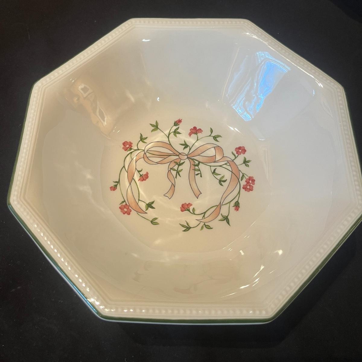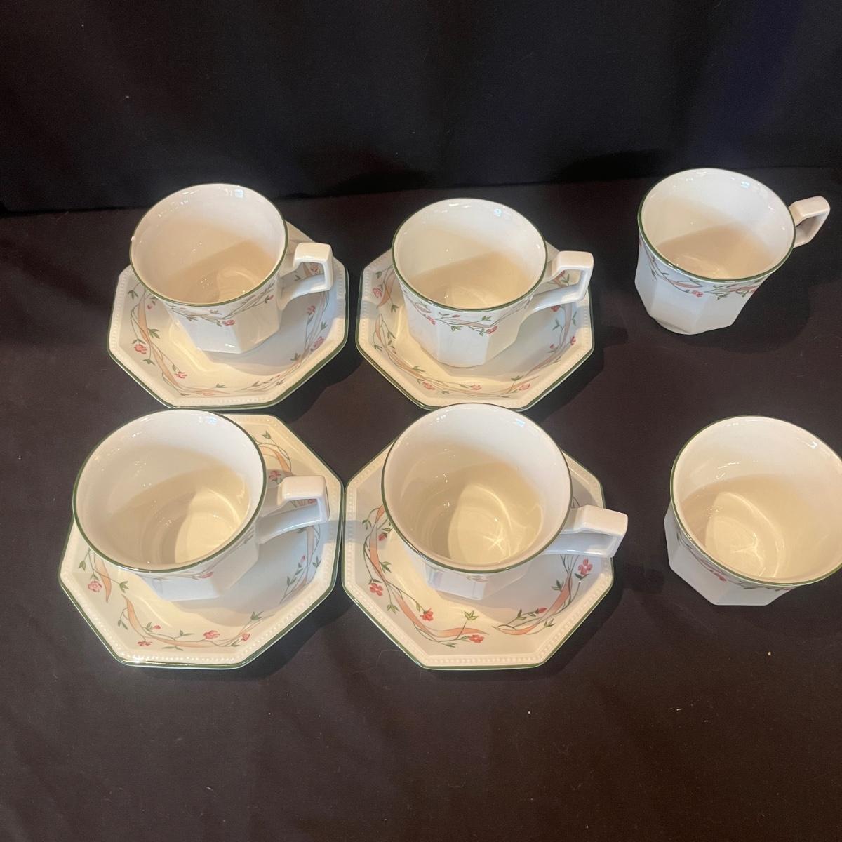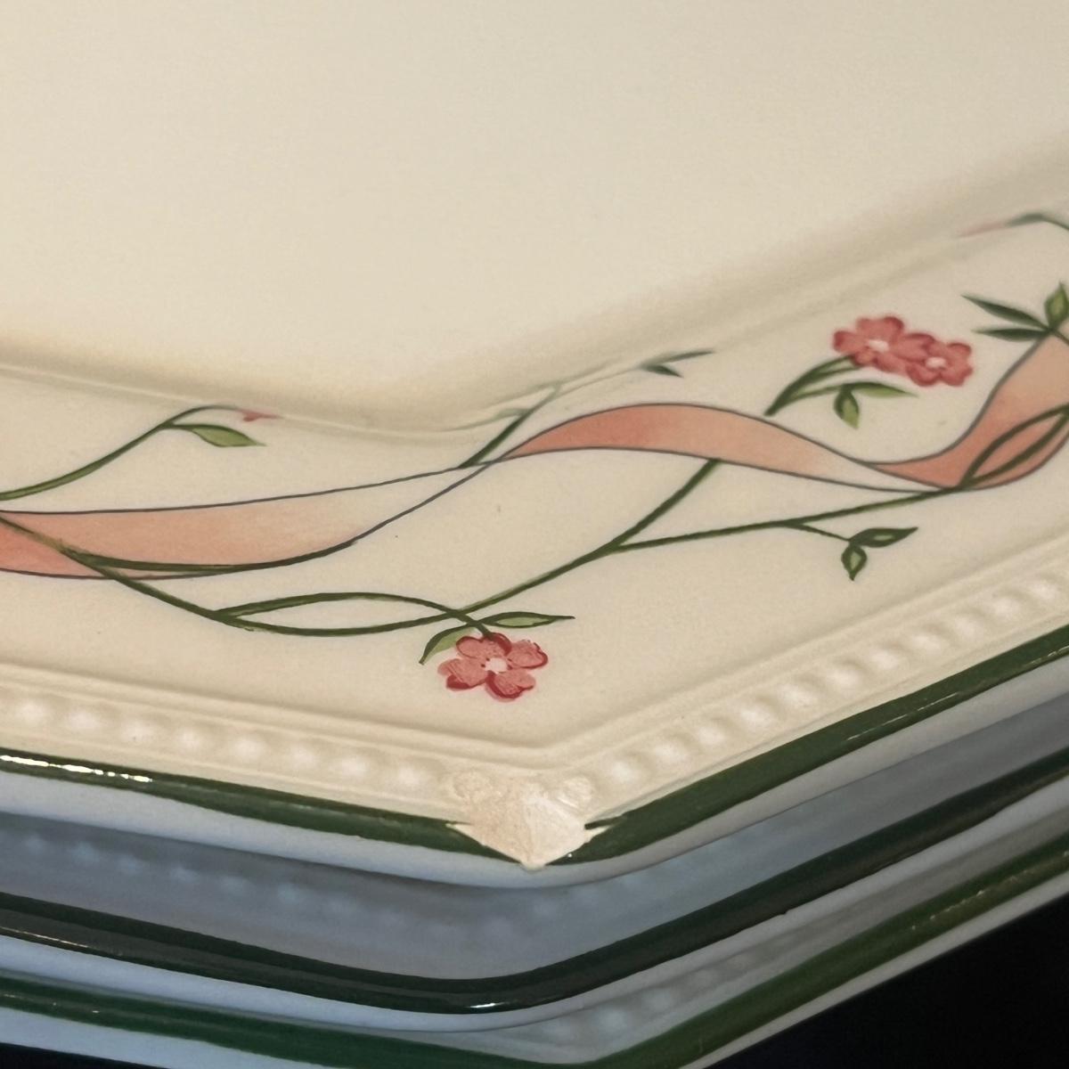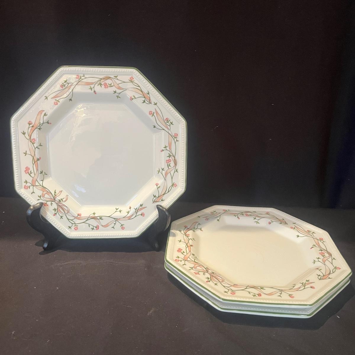 This selection of Johnson Brothers China in Eternal Beau print includes four dinner plates, three medium plates, six small plates, six teacups, four saucers and three bowls. Dinner plates measure 10”D.