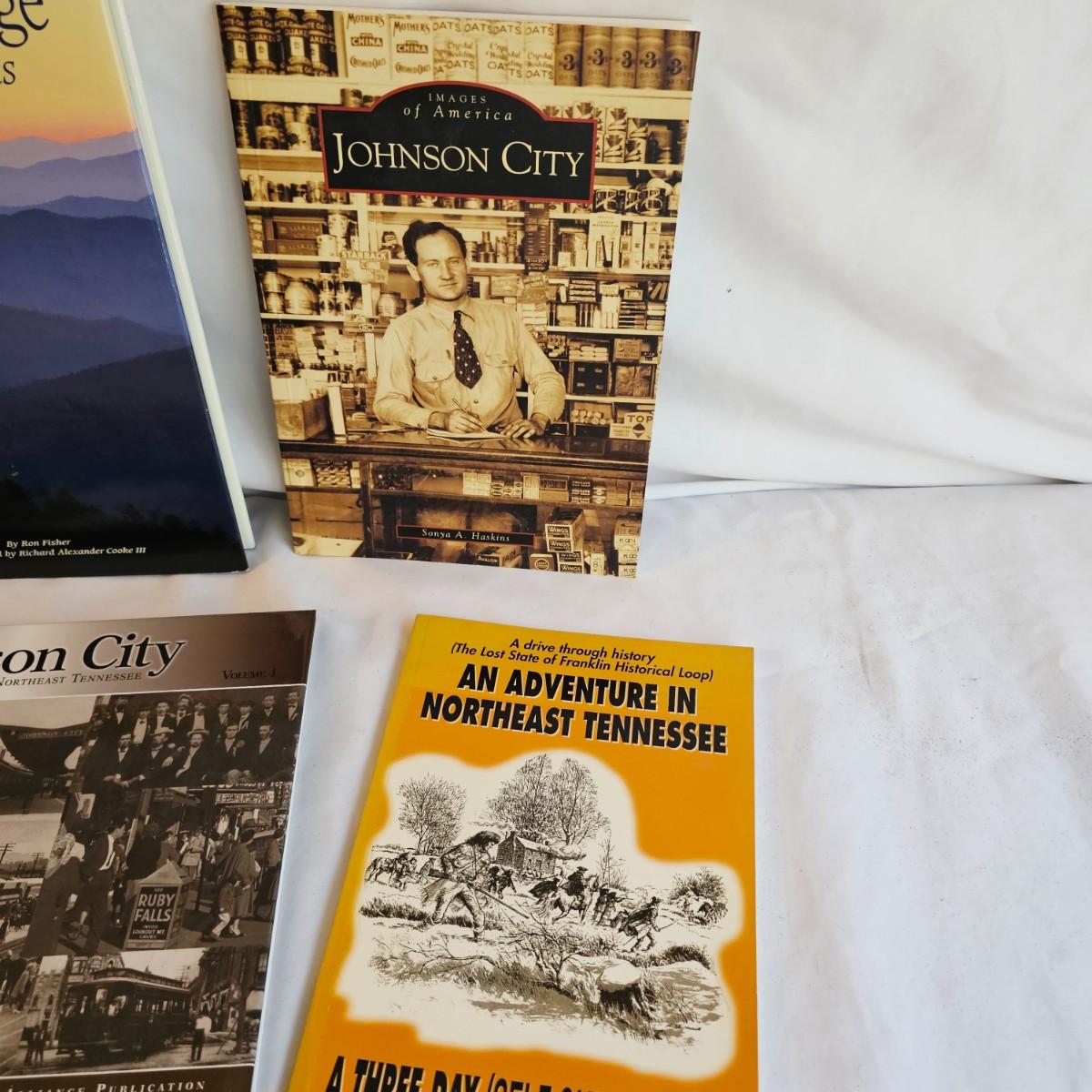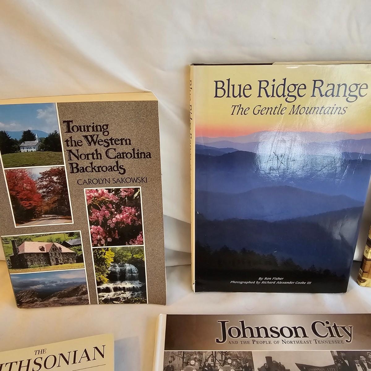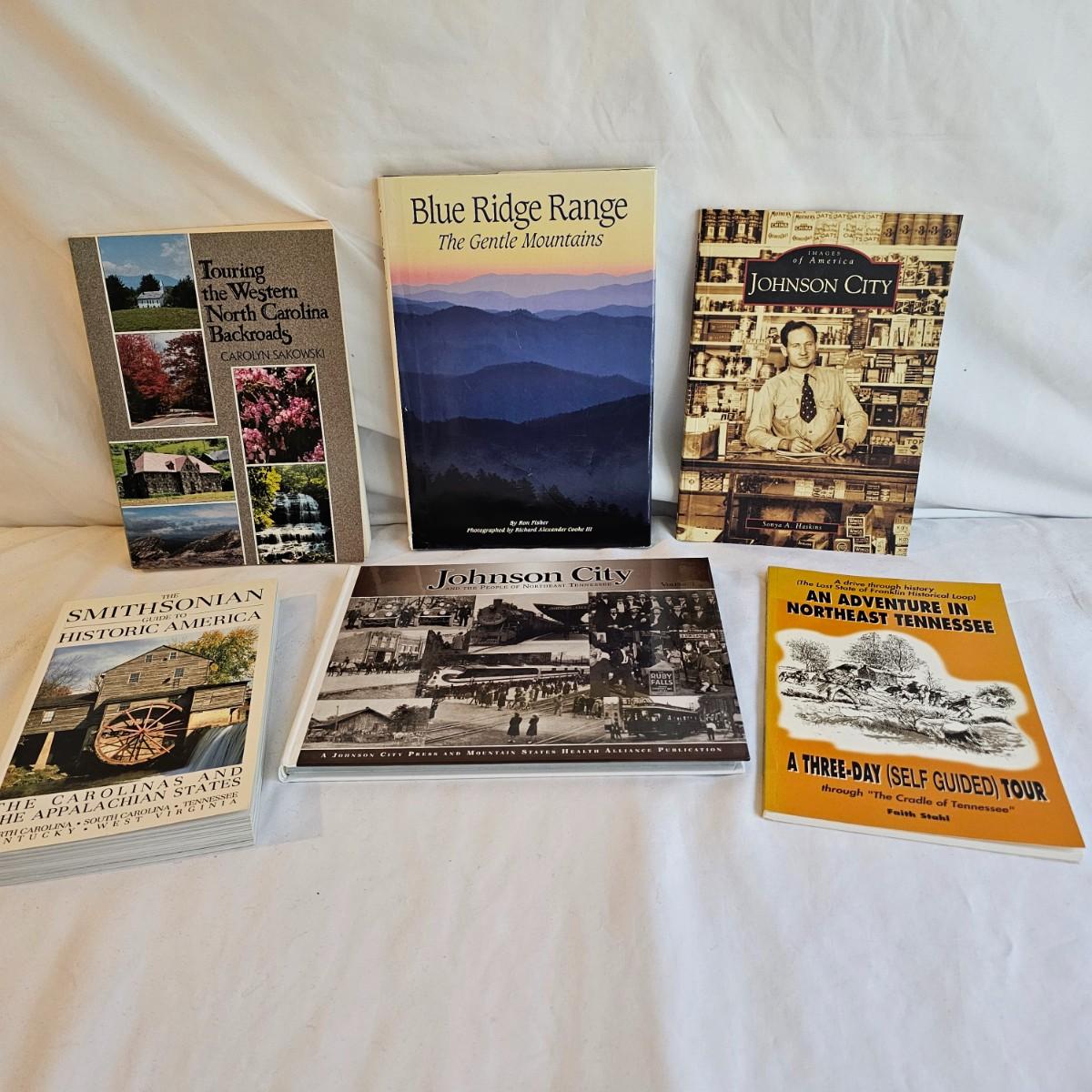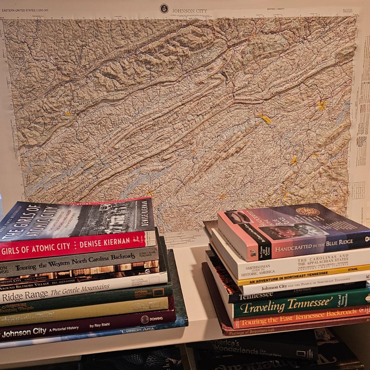 A 32" x 21" topographical map of Johnson City and surrounding areas, mounted on foam core board. Lot also includes books on touring and traveling the Blue Ridge and surrounding area. See photos for details. Local pickup only.