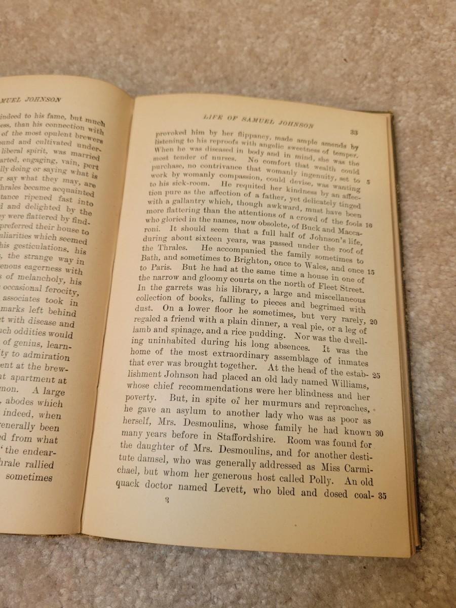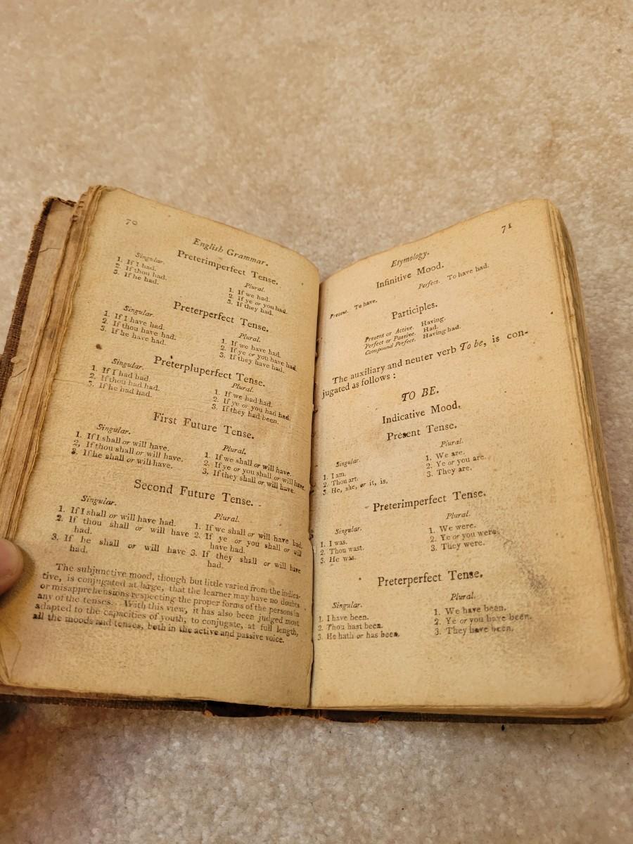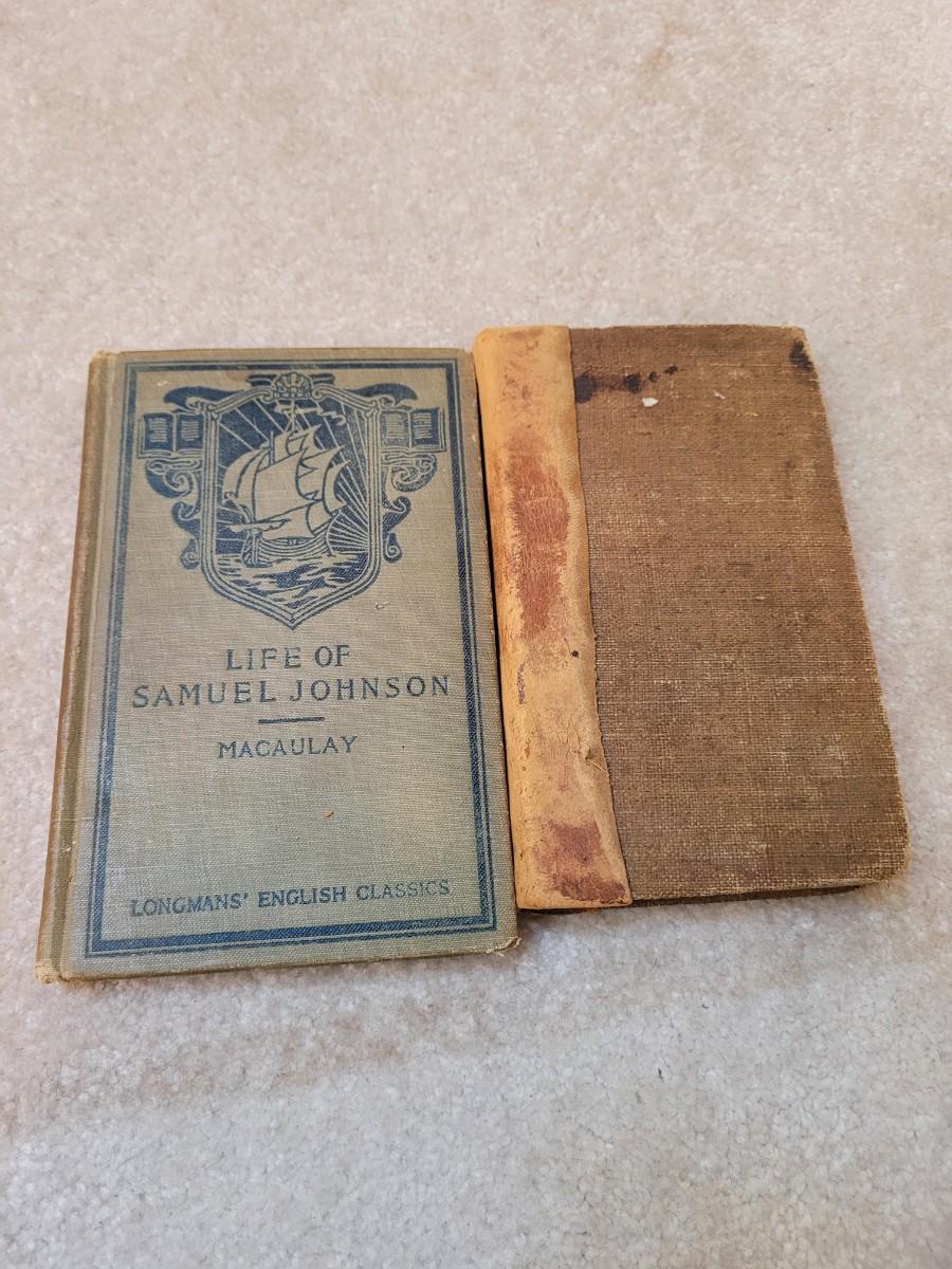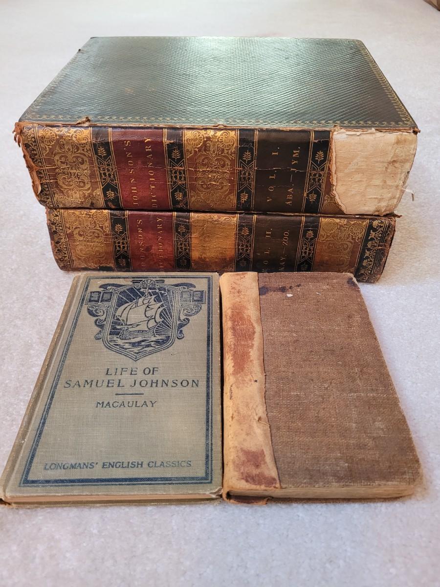 In this lot are two Johnsons Dictionaries and two antique English books. The Johnsons Dictionaries are volumes one and two of the English language series. 1820 is printed at the bottom of the title page. They are very old and feature beautiful artwork and designs throughout. They extensively cover the English language of the time over the course of two books. The other two books are smaller books also pertaining to the English language. One is "Life of Samuel Johnson", and the other is an appendix of rules and observations of the English language (the handwritten note says first edition 1806). It features a piece of leather binding the spine.