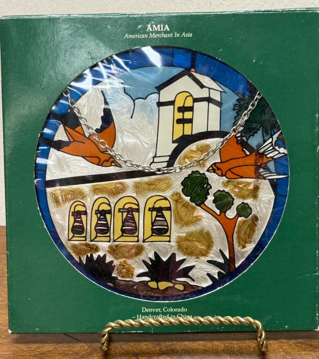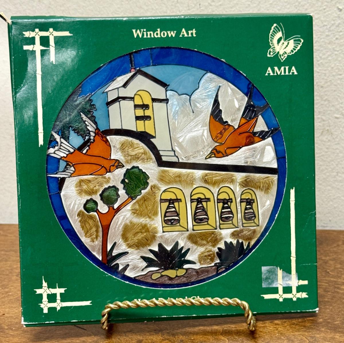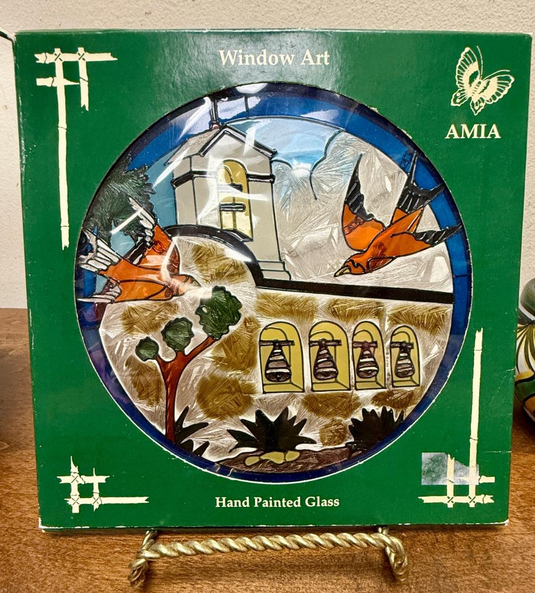 Amia Window Art Hand Painted Glass Decor Round San Juan Capistrano & Swallows