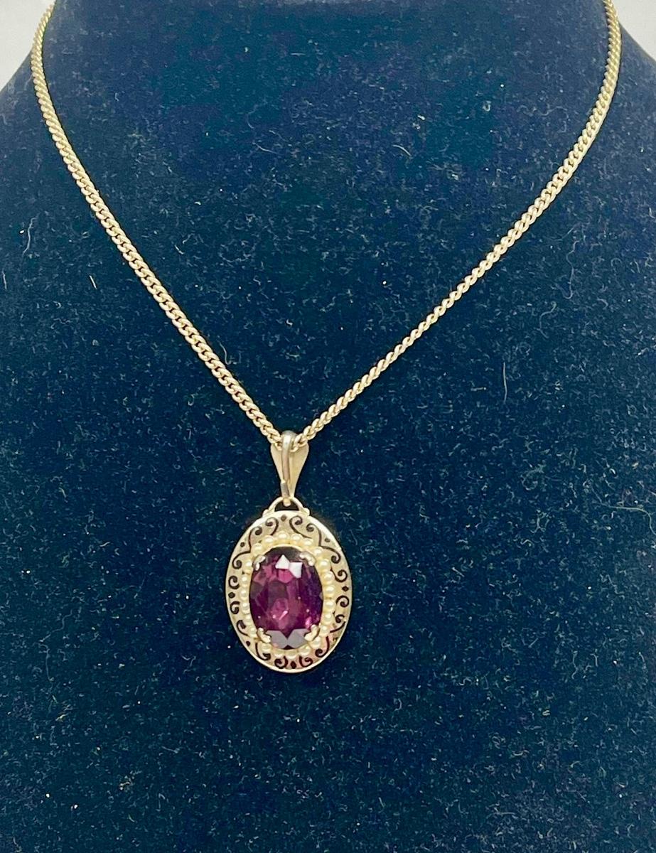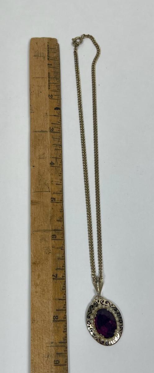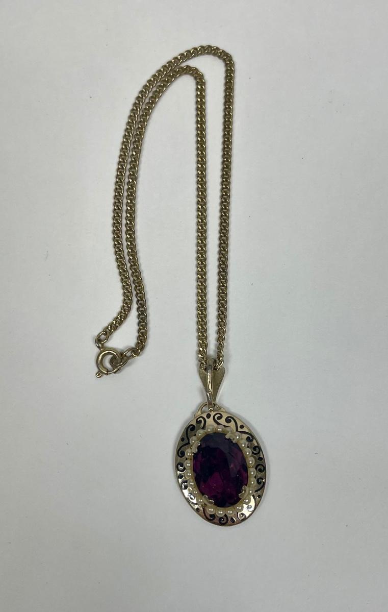 Magenta Colored Stone Pendant with Gold-tone Setting & Chain