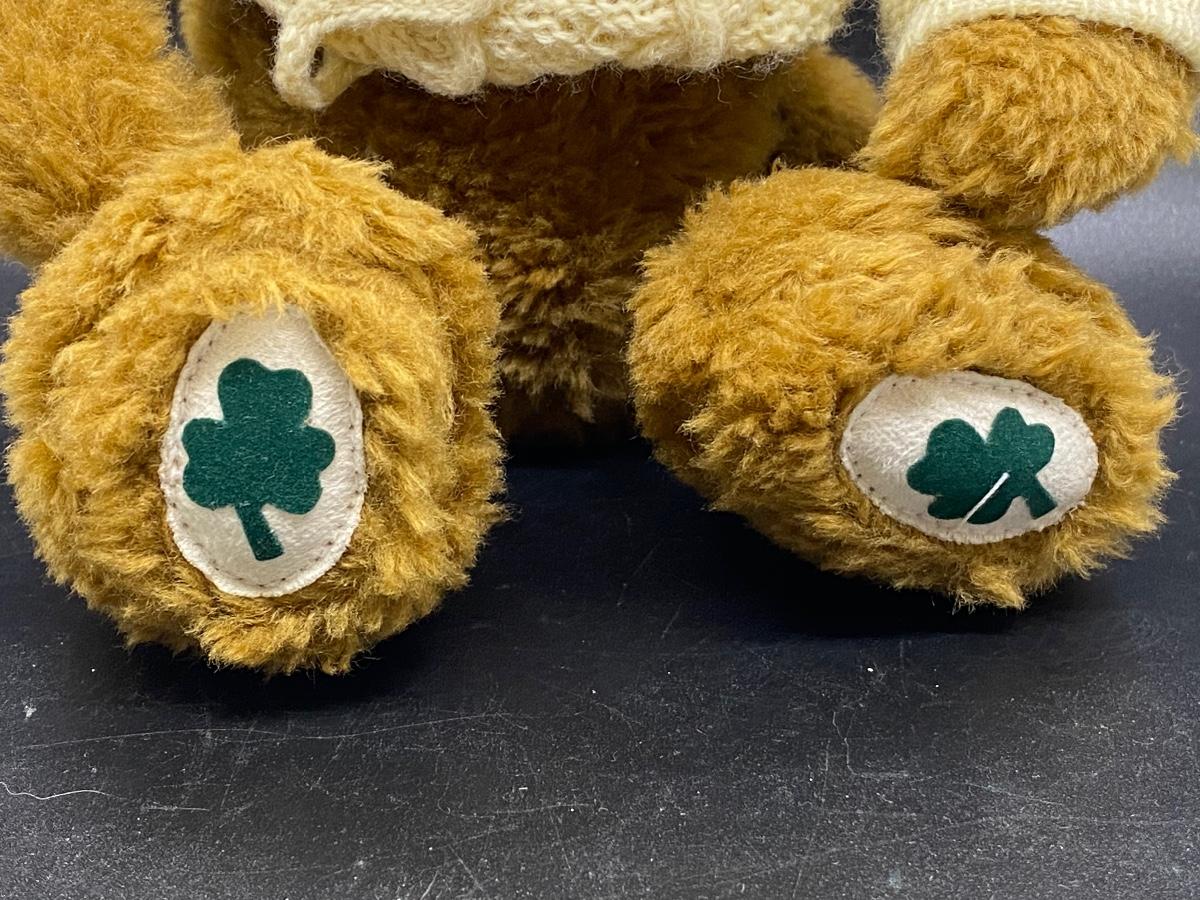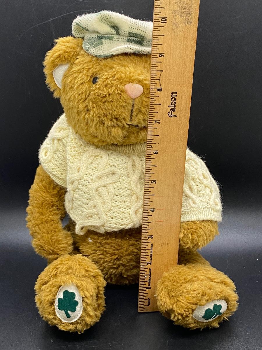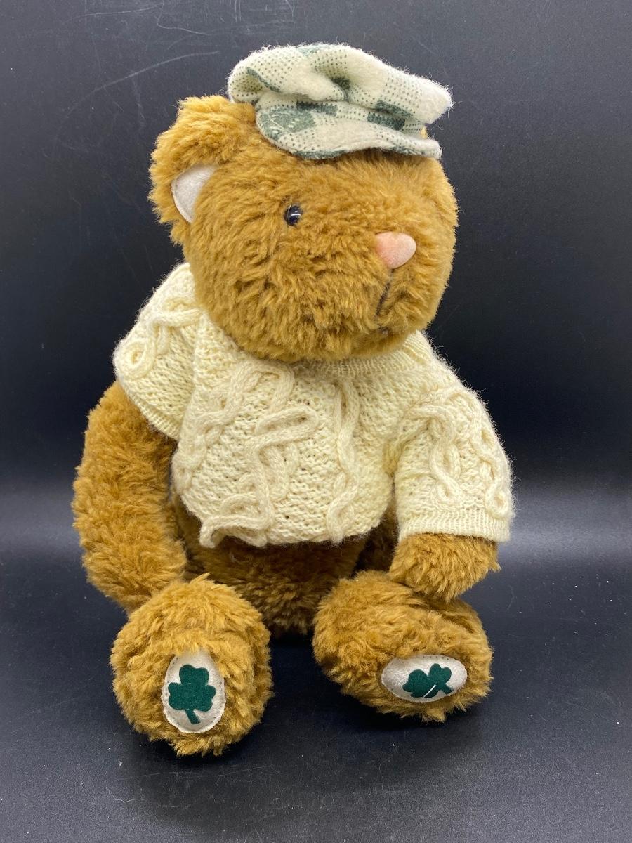 Cute jointed plush animal from Tender Hearted Collectibles. Wearing a sweater and cap, it has shamrocks on the soles of it's feet. In good condition, no holes.