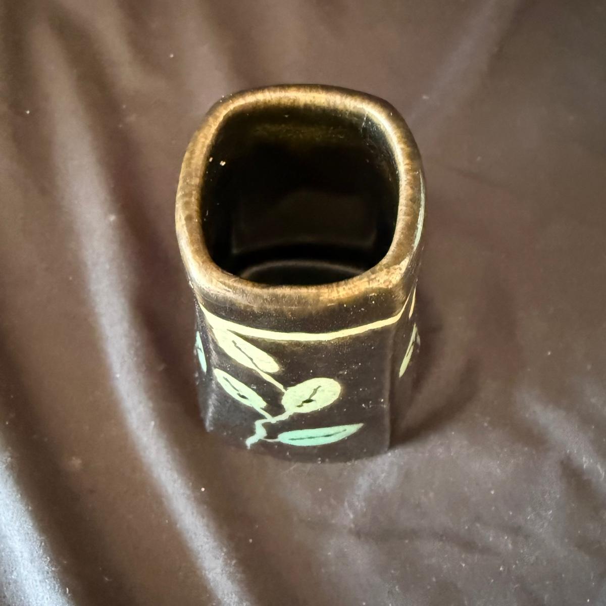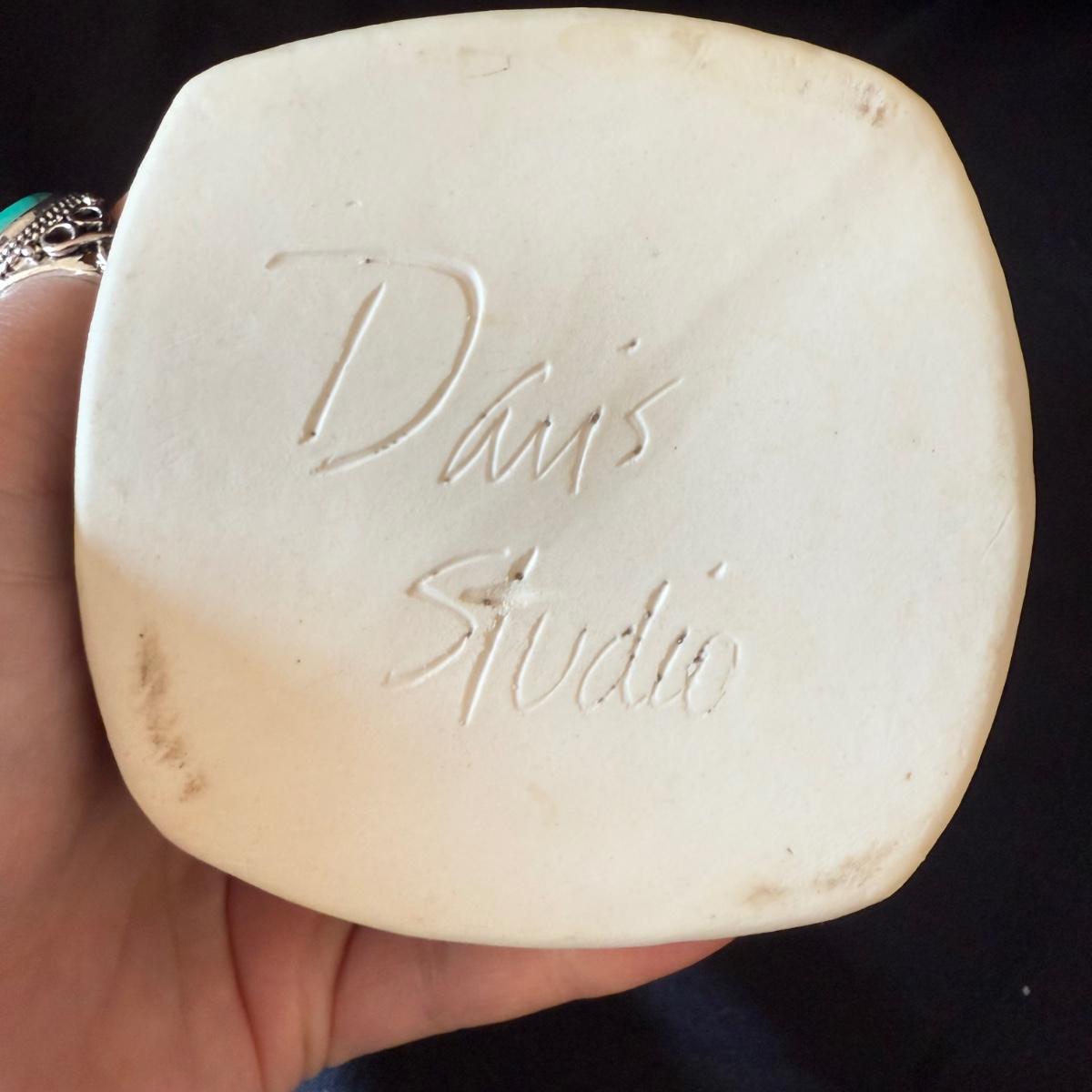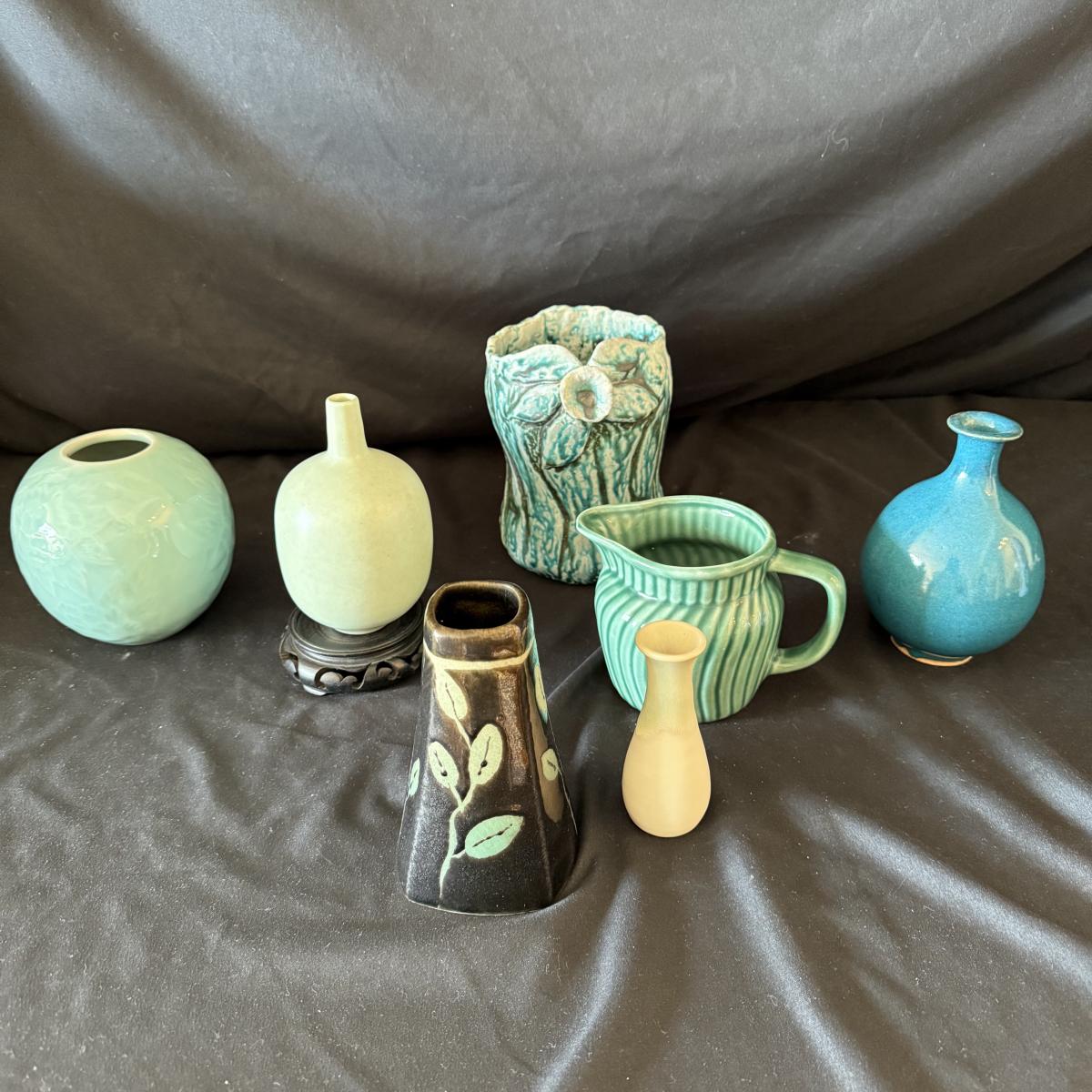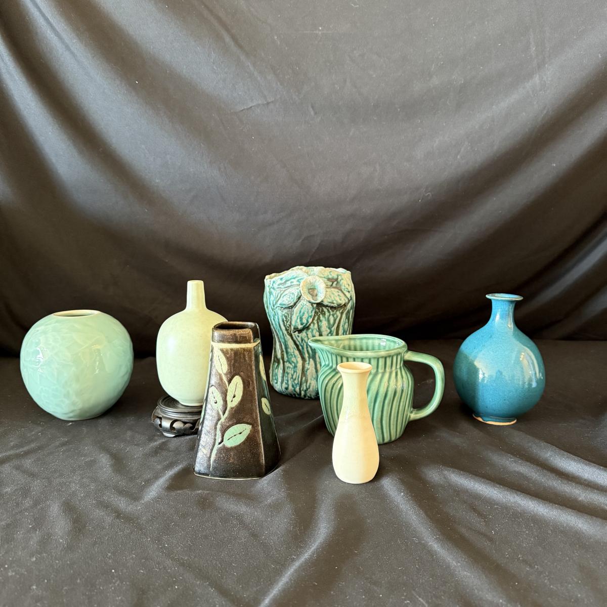 This lot contains a variety of seven different likely handmade ceramic vases. The largest piece is a chunky vase with a floral sculpture, deep etching and a teal and green glaze. This item measures 4.5”D x 6.5”H. Next is a soft teal round vase with a muted floral design. Moving on there is a soft blue minimalist bud vase designed by Jonathan Adler for ATA (Aid to Artisans) it is stamped ‘Adler for PB’ as well as ‘ATA’ on the bottom and comes with a small wooden stand. This item stands 5.5”H. Next is a brown vase with green leaves. This item measures 3.35” x 3.25” x 5.5”H and is signed “Dan’s Studio” on the bottom. Moving on there is a vibrant indigo bud vase likely signed by David Chohlidakis. Lastly, a small swirled teal pitcher and a precious tiny little bud vase with a gentle green glaze and texture around the neck of the vase. See pictures for details. Shipping available.