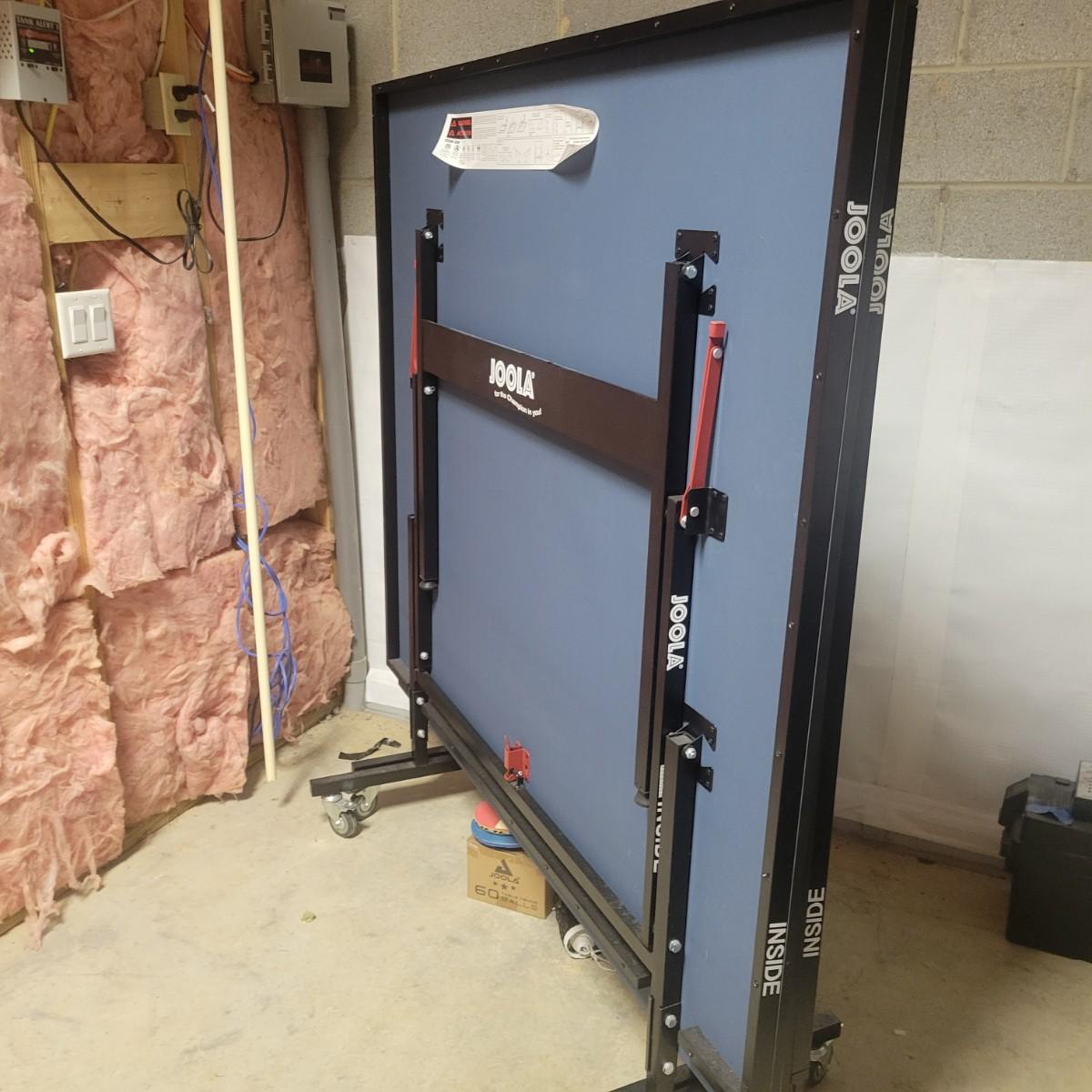 A Joola ping pong table that folds up and separates into two pieces for easy transportation and storage. It measures approximately 60" x 108" x 30"H. This lot also includes three paddles, a net, connection brackets and a box of ping pong balls. Local pickup only. Winning bidder must bring assistance to help move and load this item due to its weight and/or size.