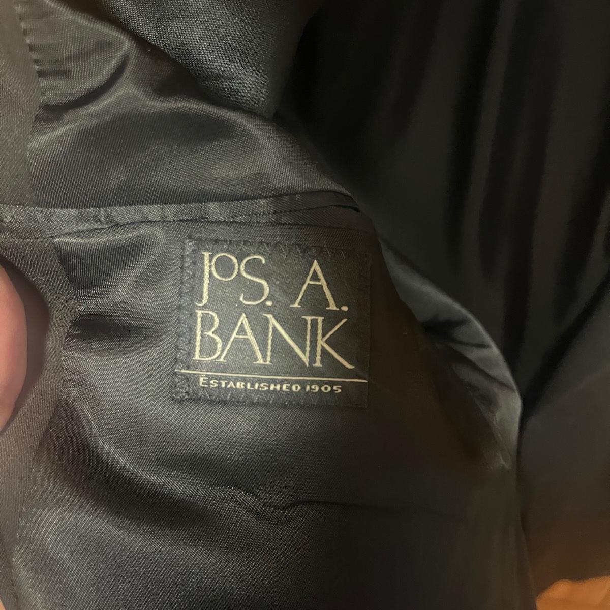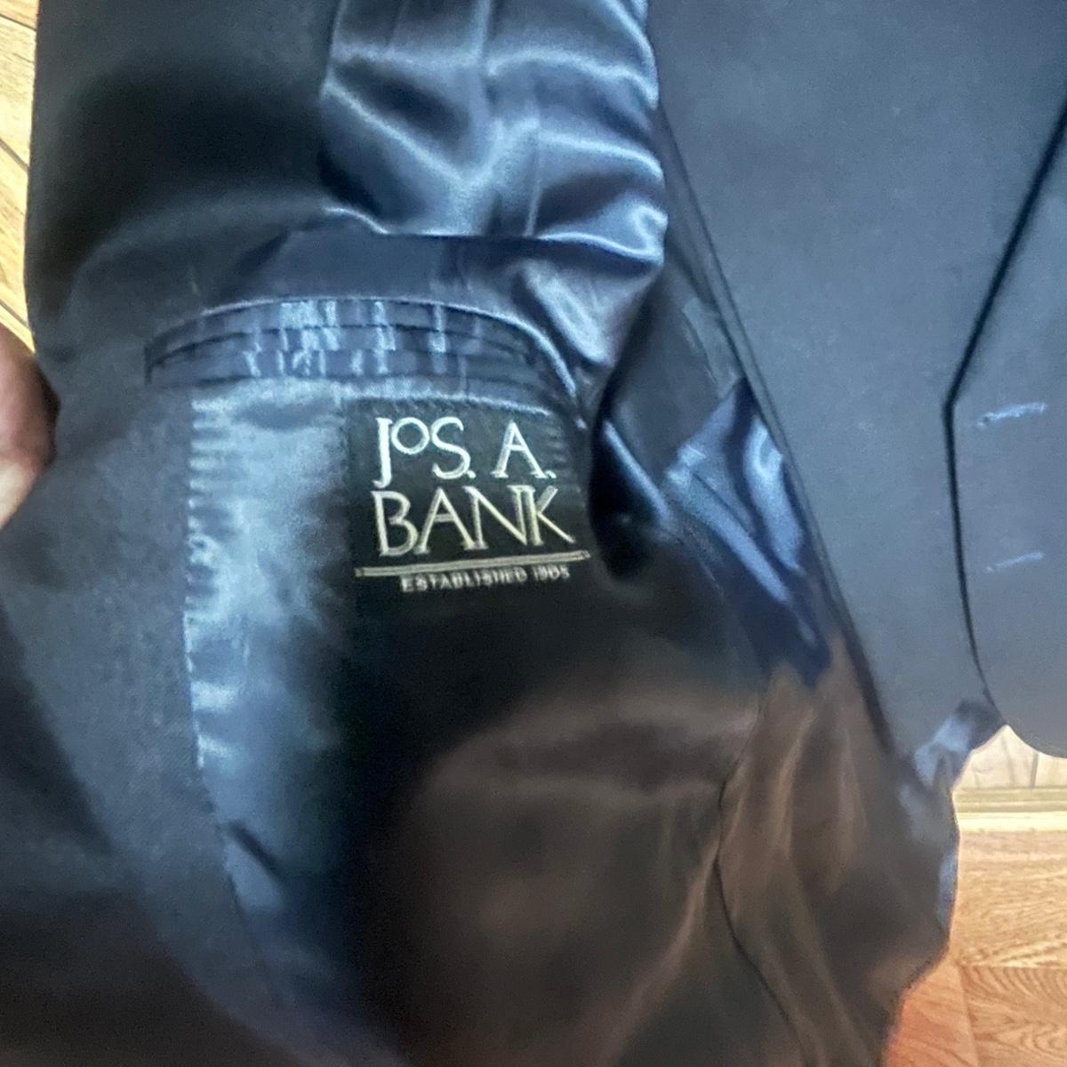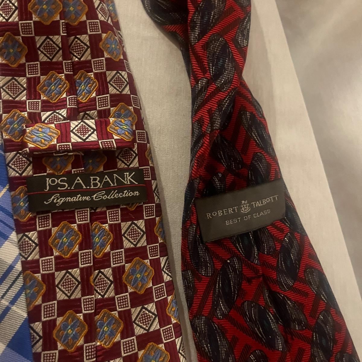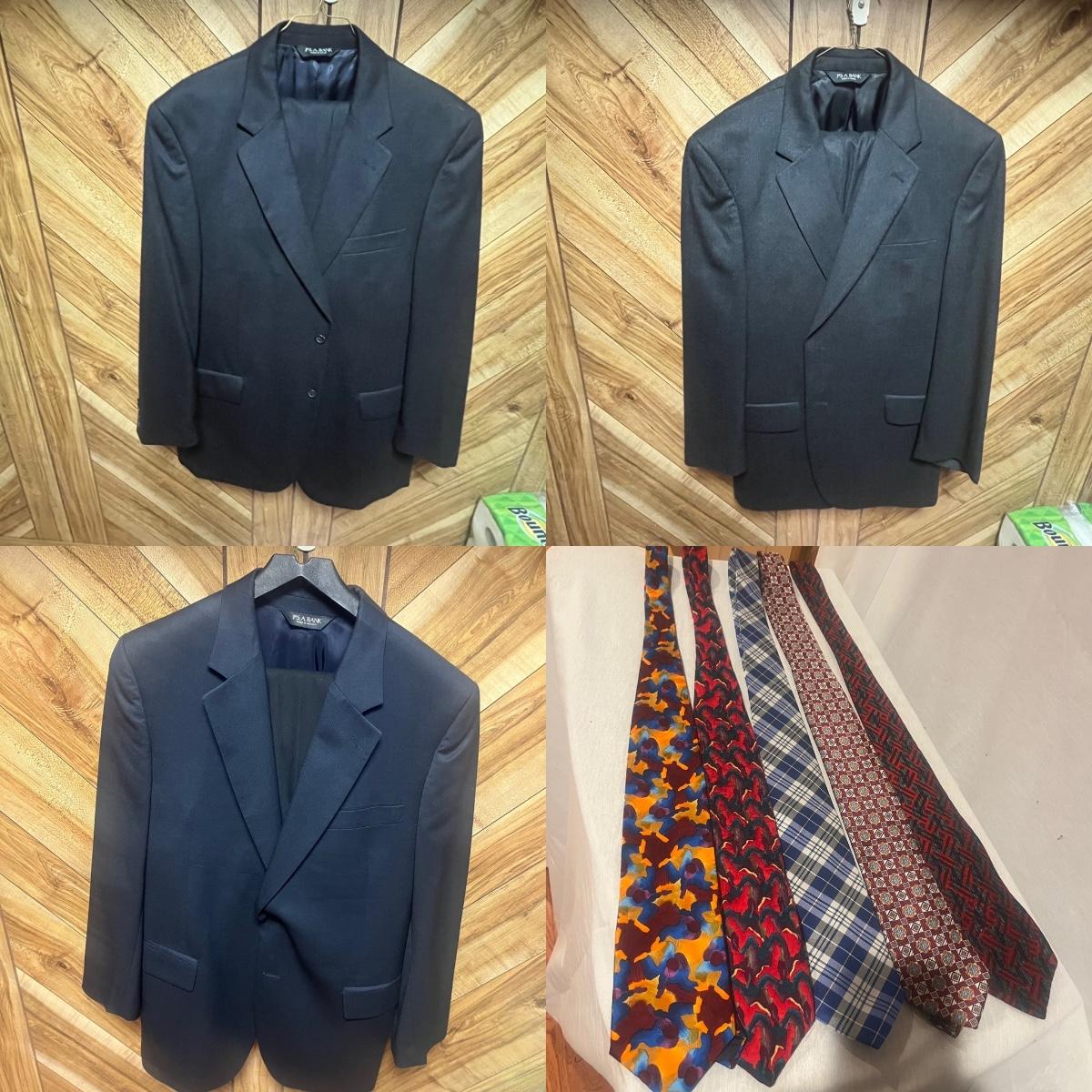 Lot includes three Jos A Banks jackets, two Jos A Banks suits and one pair of pants. Also includes eight ties from a variety of brands including J. Garcia, Jos A Banks and more. An approximate example of measurements can be found in photos.