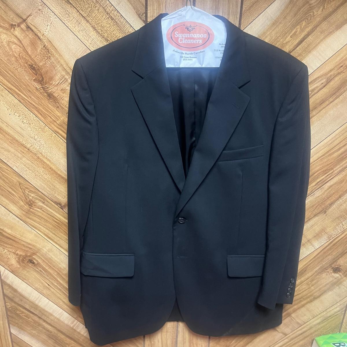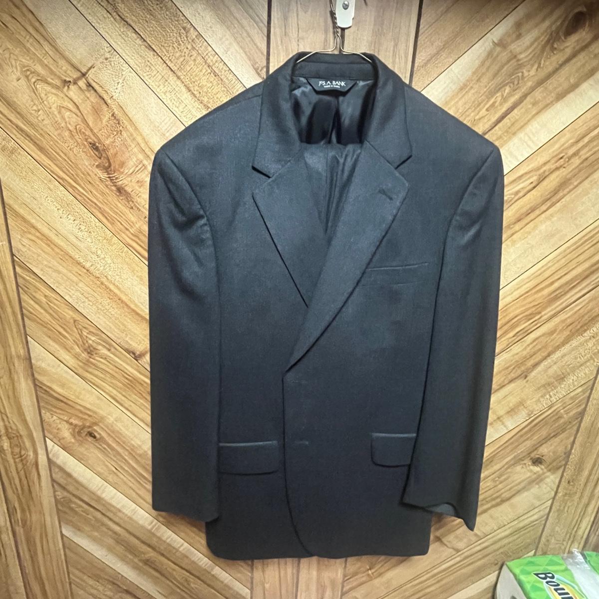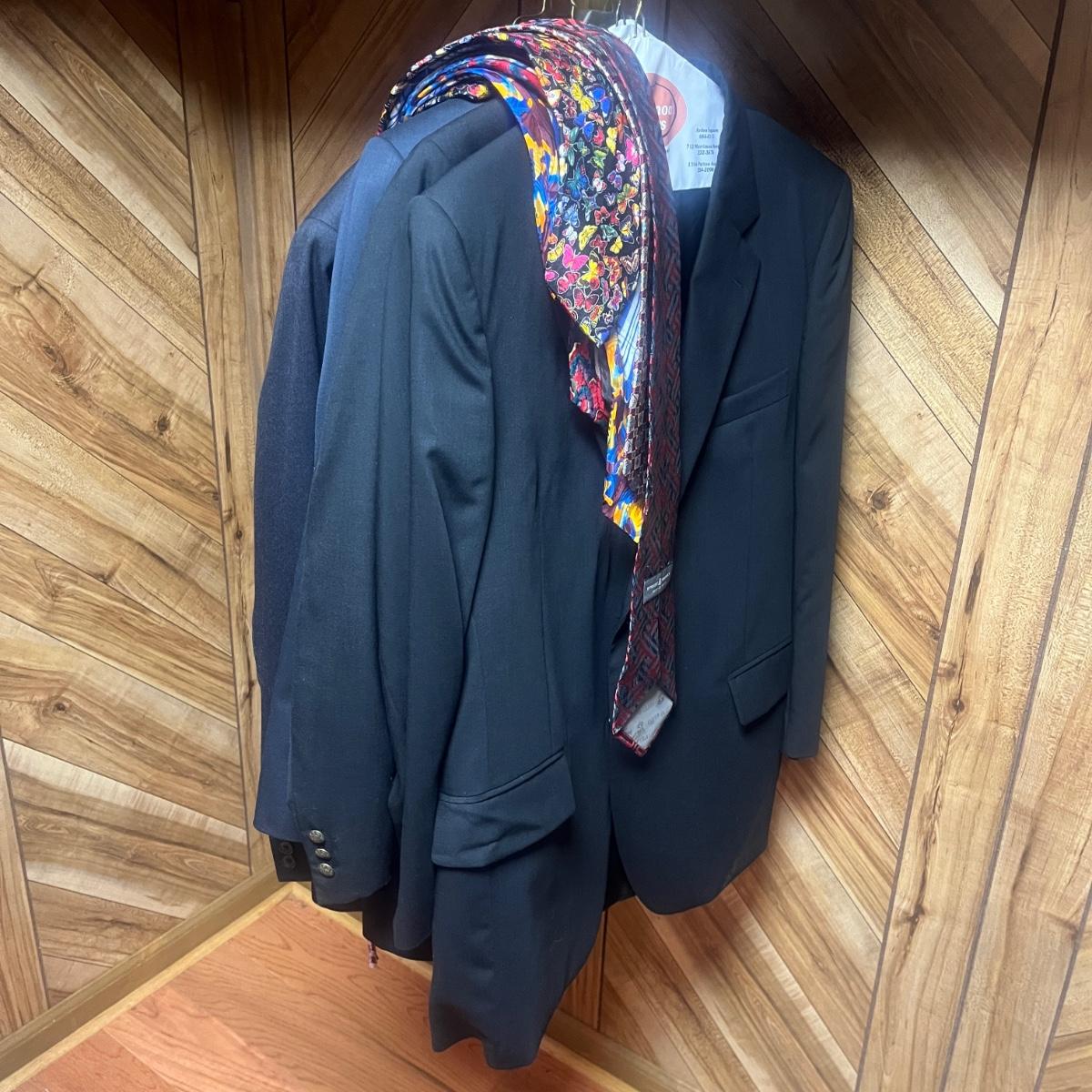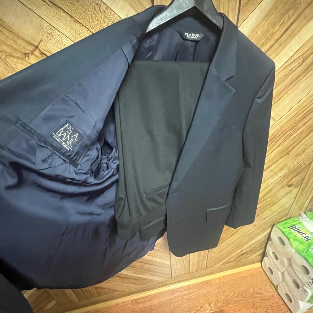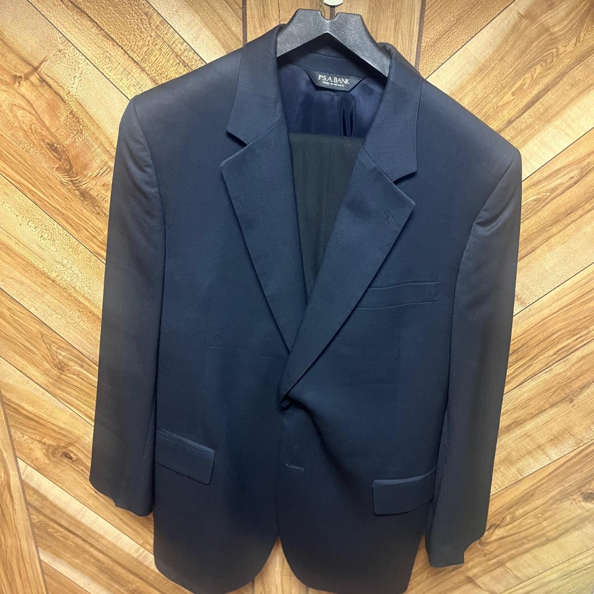 Lot includes three Jos A Banks jackets, two Jos A Banks suits and one pair of pants. Also includes eight ties from a variety of brands including J. Garcia, Jos A Banks and more. An approximate example of measurements can be found in photos.
