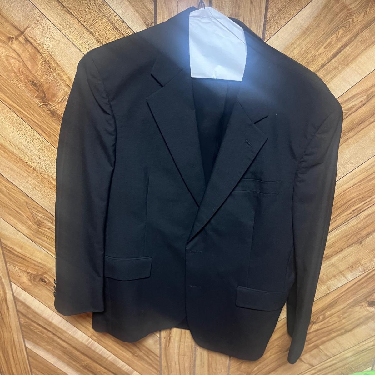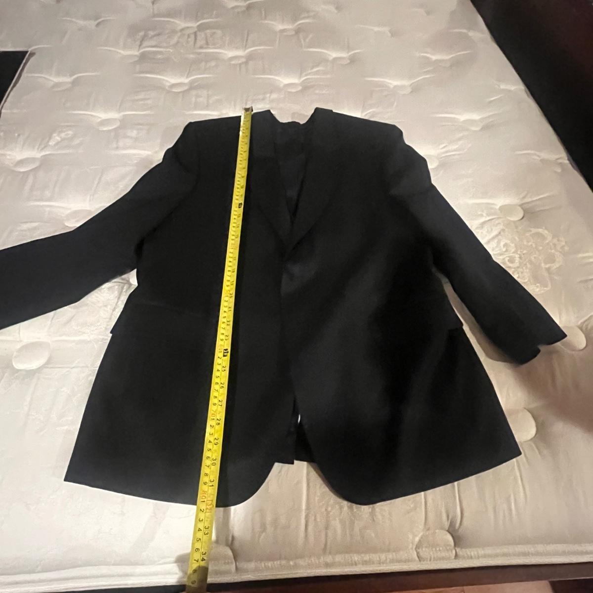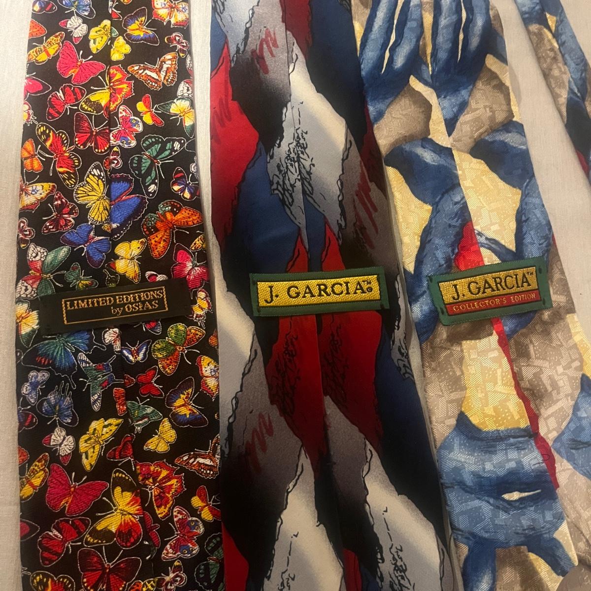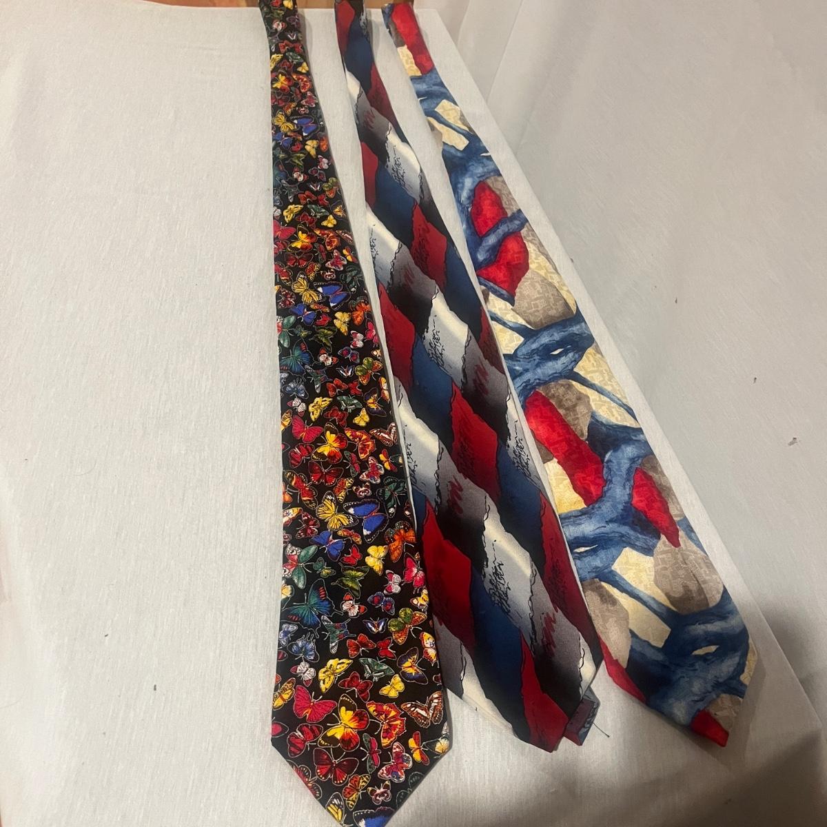 Lot includes three Jos A Banks jackets, two Jos A Banks suits and one pair of pants. Also includes eight ties from a variety of brands including J. Garcia, Jos A Banks and more. An approximate example of measurements can be found in photos.