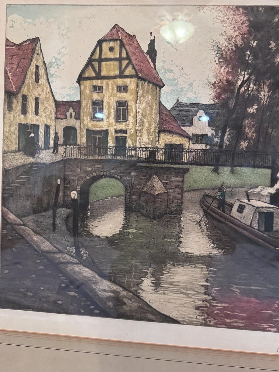 Joseph Francis Gilbert (British 1792 - 1855) color Lithograph of European village canal scene. Signed lower right in pencil.