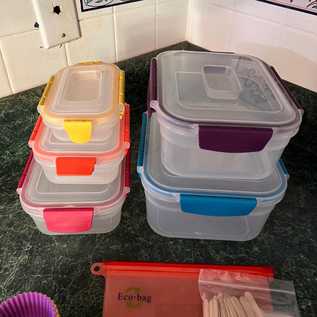 Five Joseph Joseph lockable lidded storage containers. Lot also includes a popsicle tray, silicone cupcake liners and more.