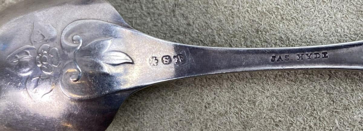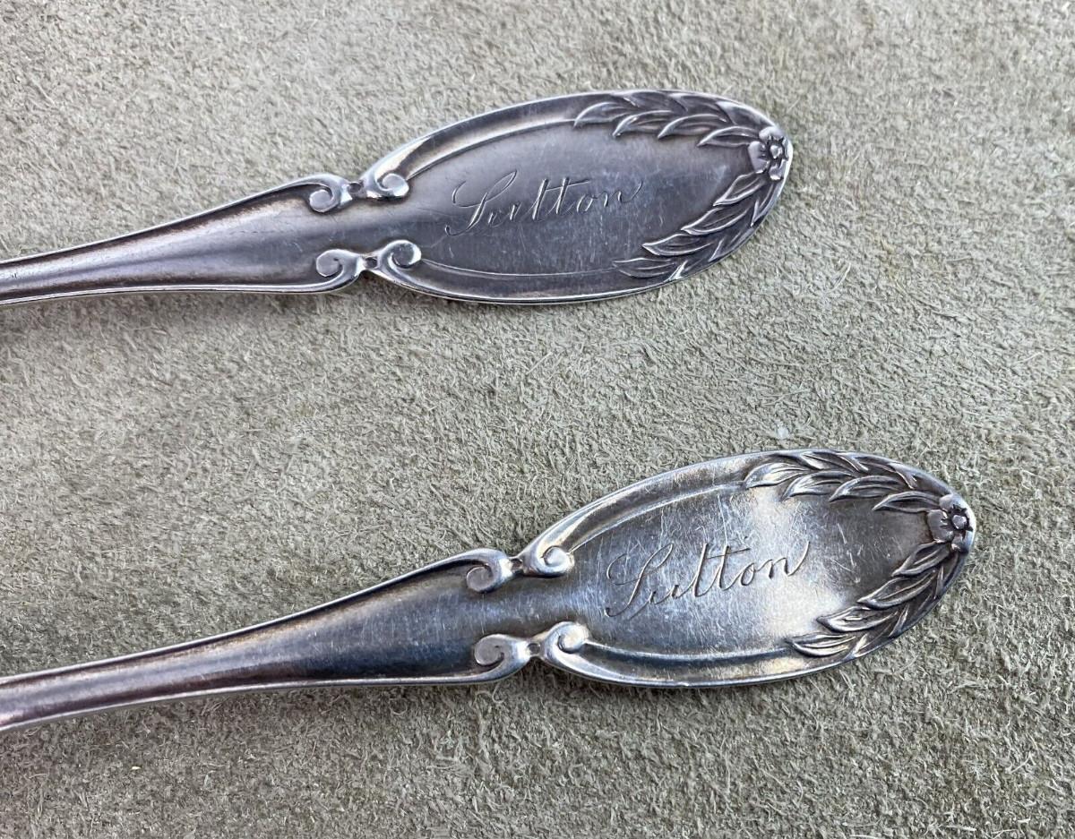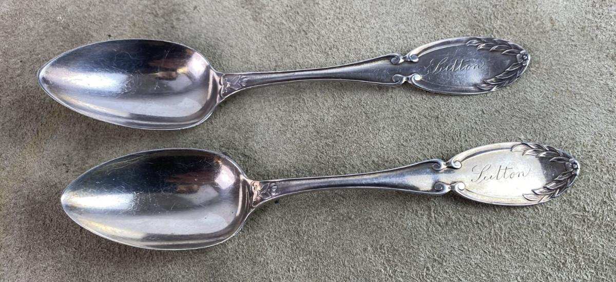 Teaspoons from the 19th century...in the Wreath pattern introduced in 1854...from master silversmith Joseph Seymour of Syracuse, New York...Light normal surface wear...as shown..Clearly hallmarked...Retailed by James Hyde a jeweler in Auburn, N.Y...Monogrammed SUTTON...5 3/4"...Weight 43.4 grams