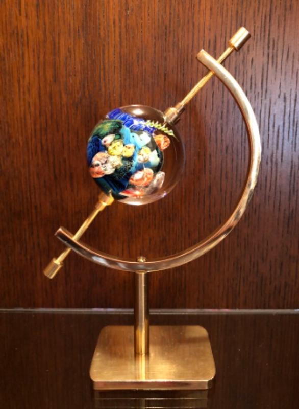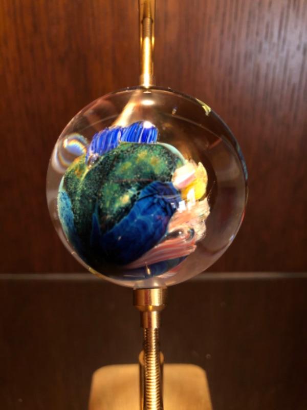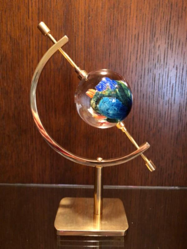 Amazing Inhabited Planet 1.75” marble with brass stand. Overall height: 6.75”