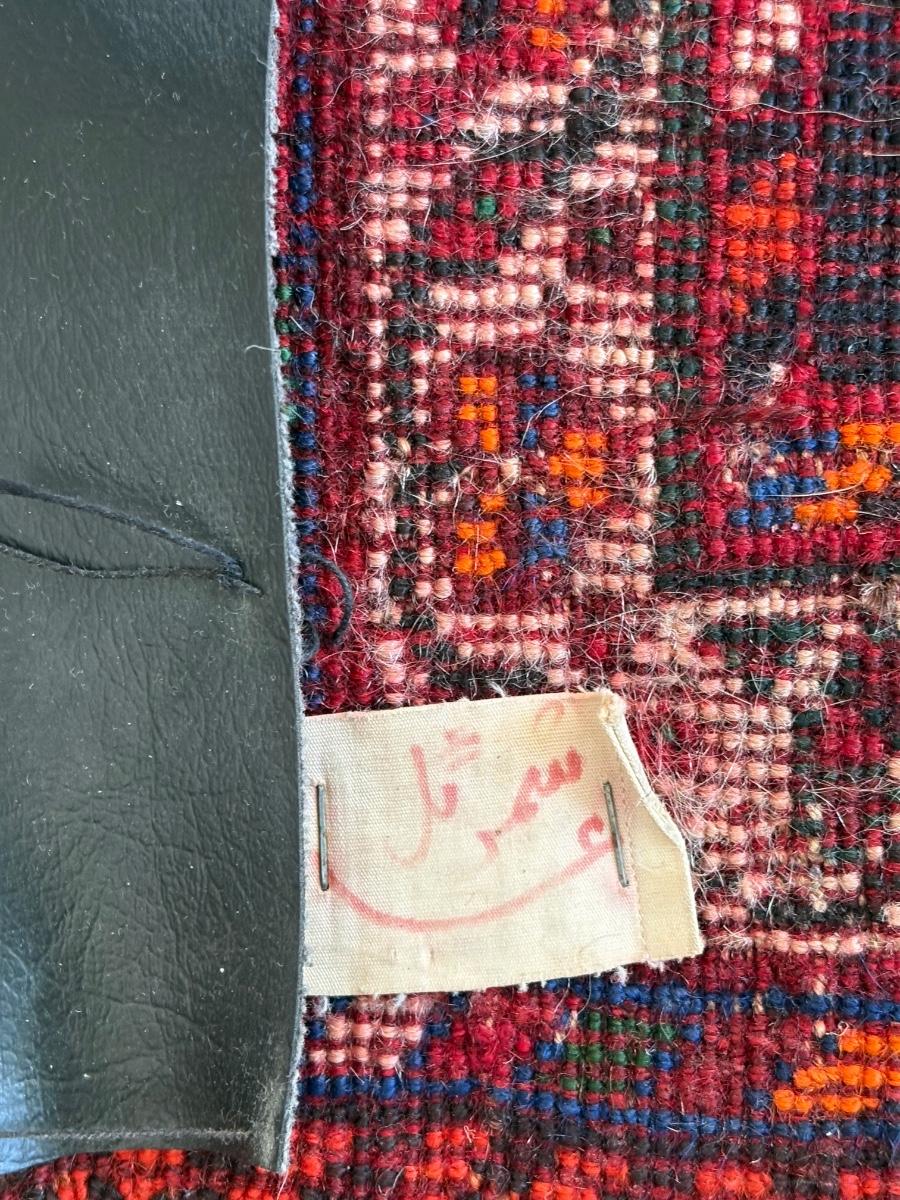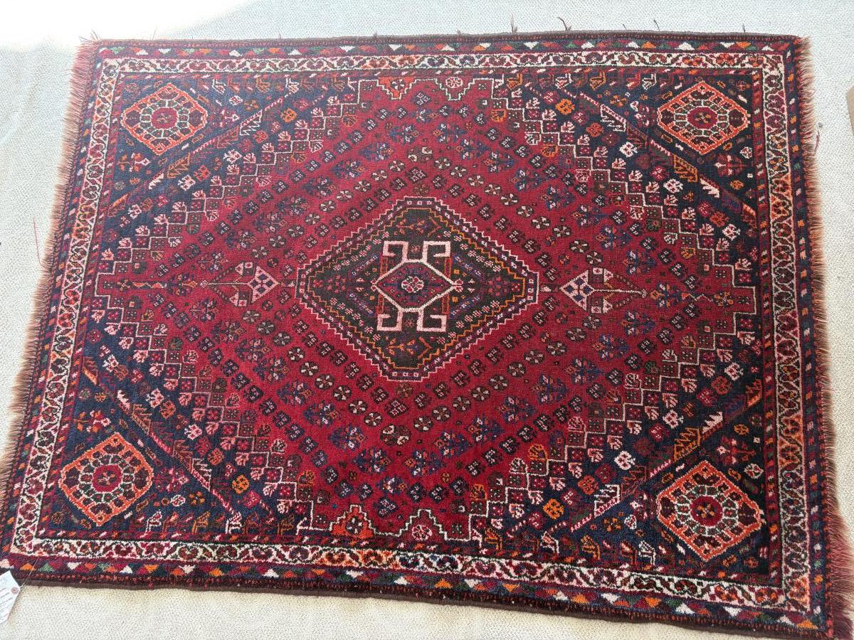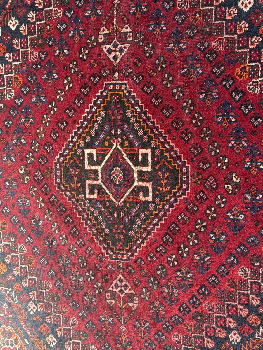 Gorgeous hand-knotted Persian wool rug in colors of rich red, navy, cream and gold. Appears to be freshly cleaned with tag still attached. The seller purchased this rug in Tehran, Iran between 1975-1972.