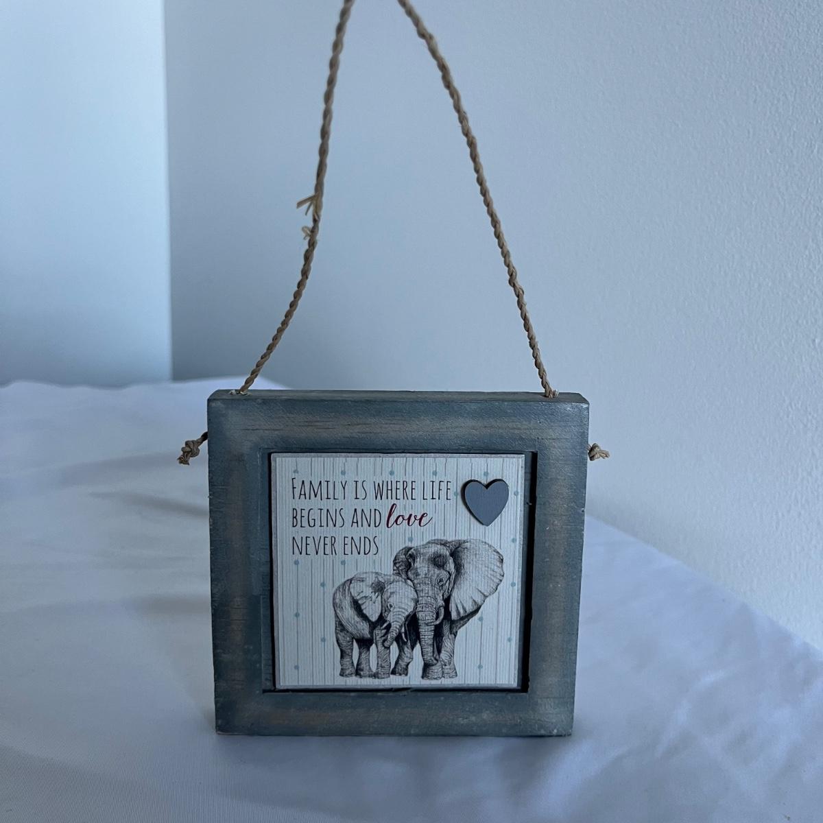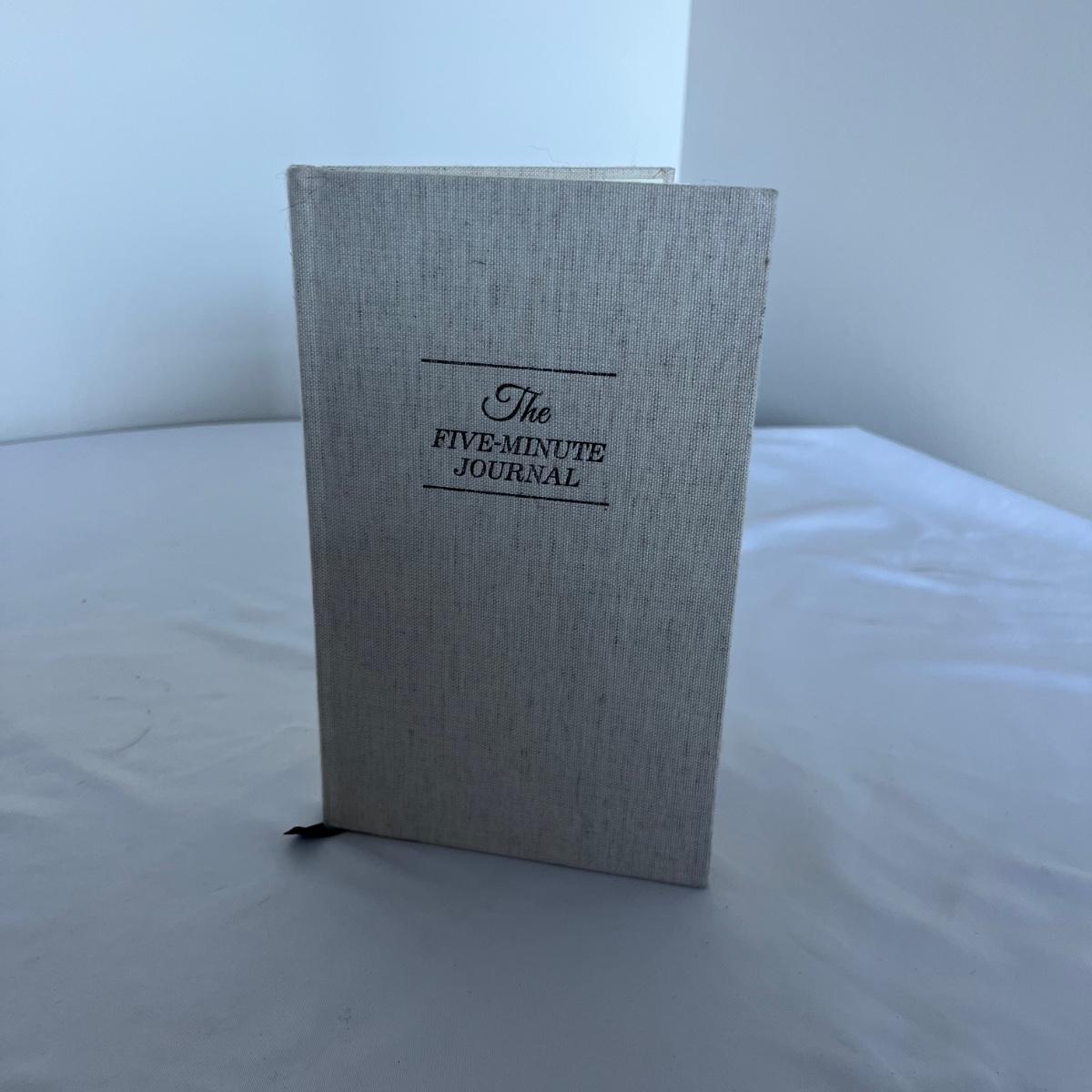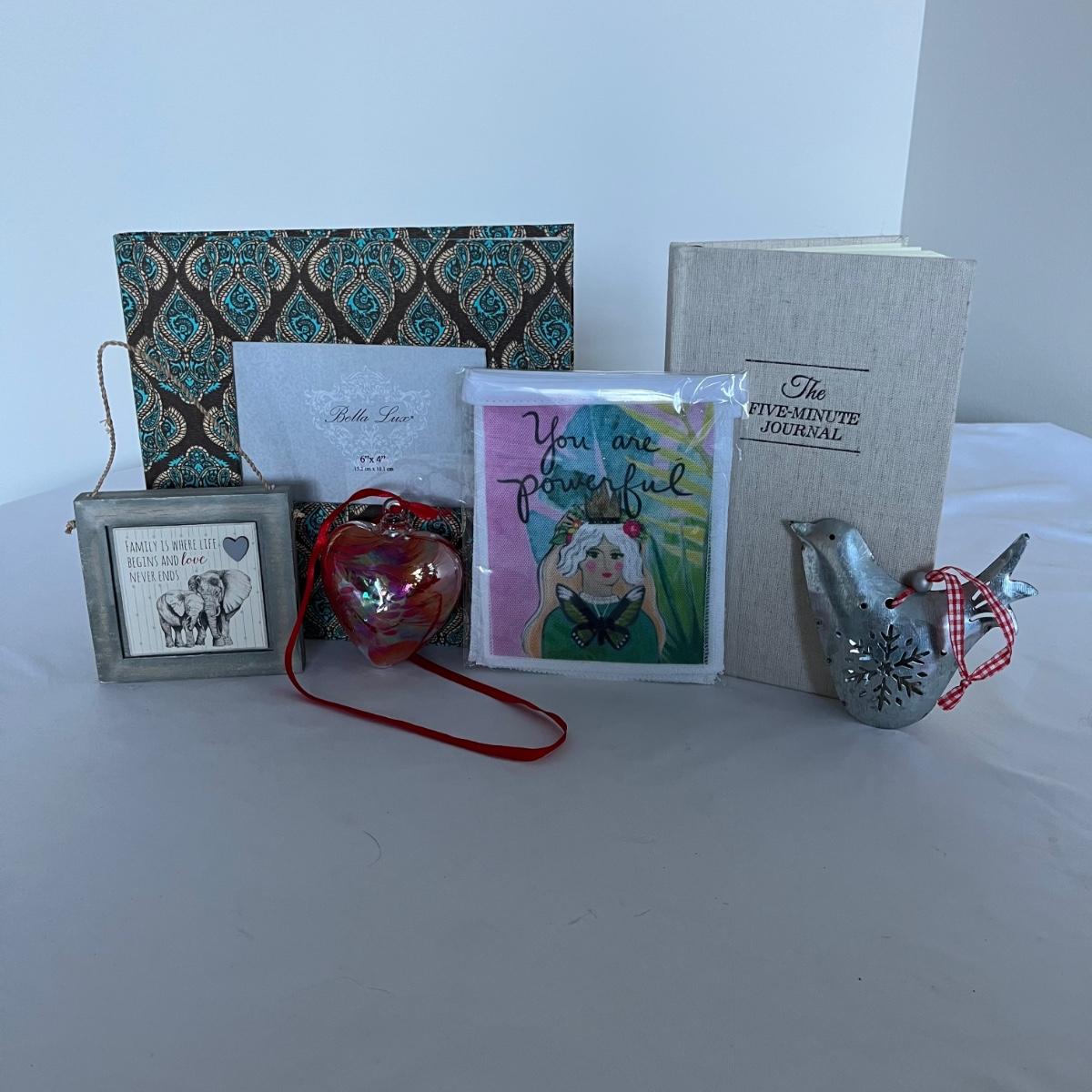 Lot includes a cloth-covered photo album, The Five Minute Journal, locally made blessing banner, metal dove ornament, glass heart, and a wooden keepsake that says "Family is where life begins and love never ends". Photo album measures 8.5” x 9.5” x 1.5”.