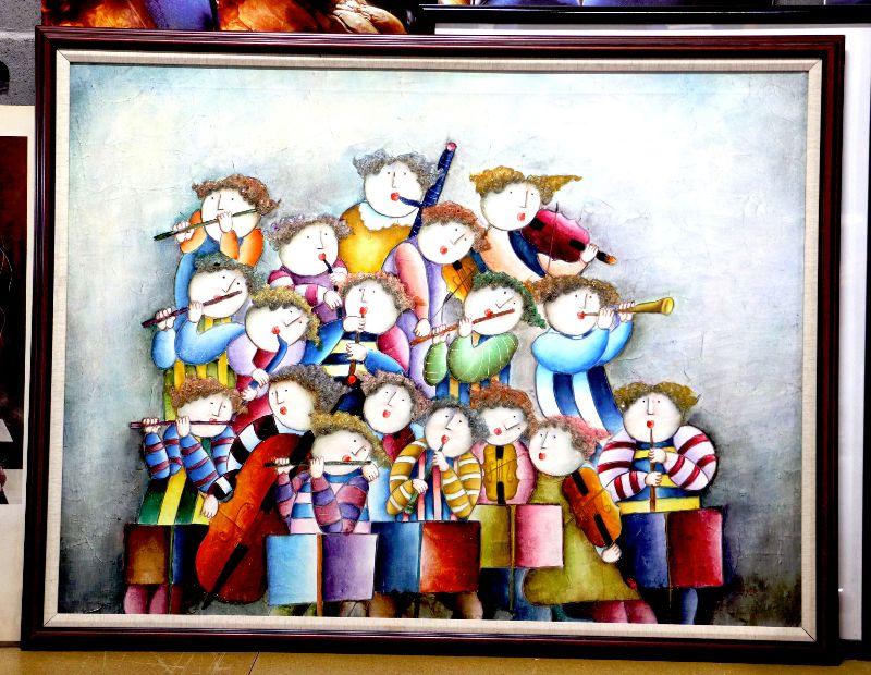 Joyce Roybal - Musicians - original oil painting, oil on canvas, signed at lower right corner. This is super impressive painting, huge in size - 52" x 40", in excellent condition with very minor wear to frame only, , last photo shows how this painting compares to the painting in size of 18"x21", beautiful painting, as seen on pictures.
