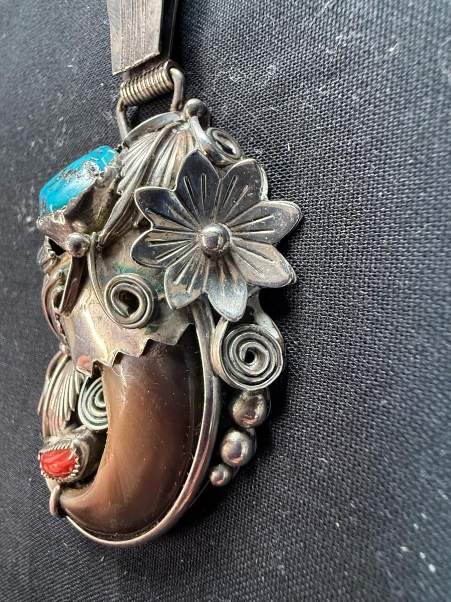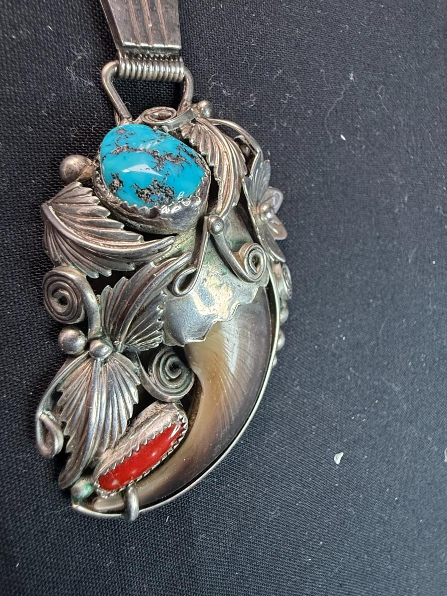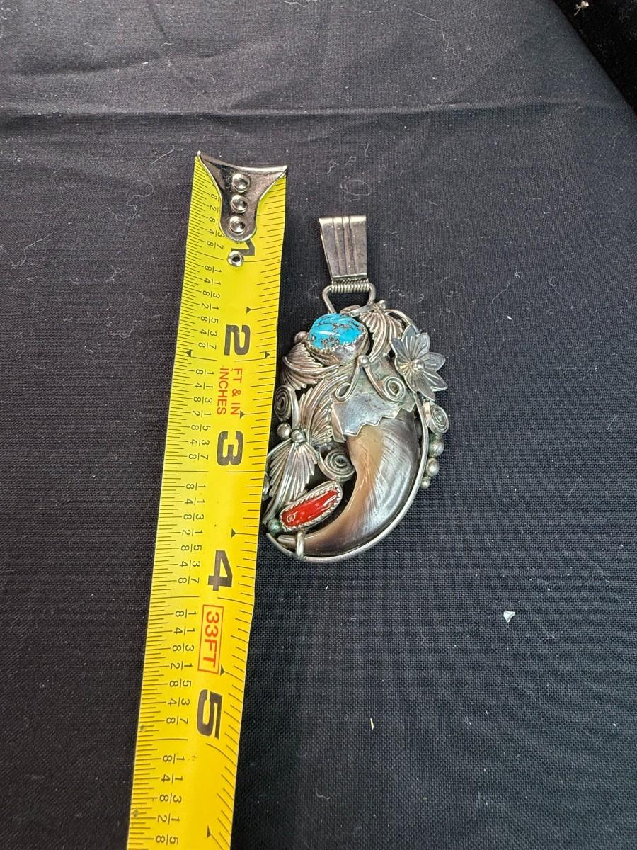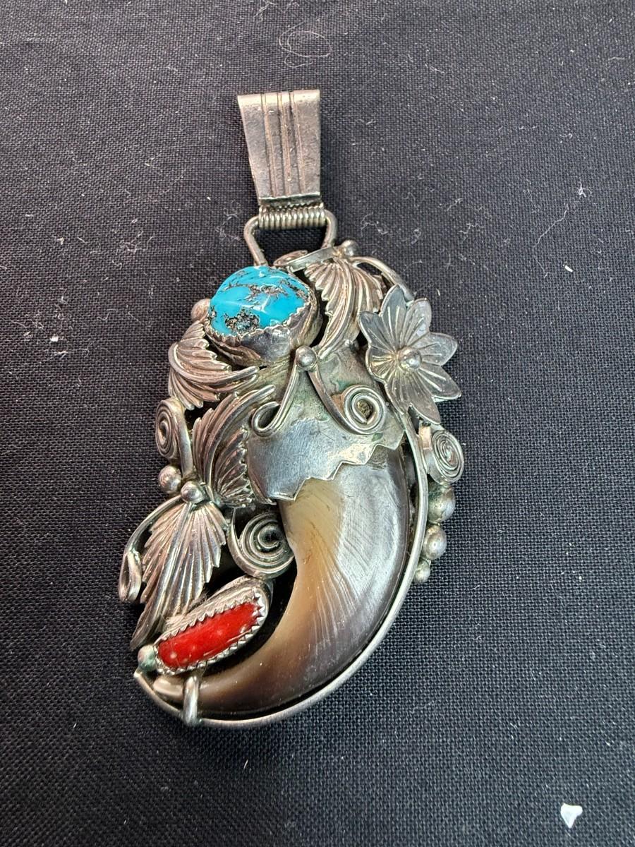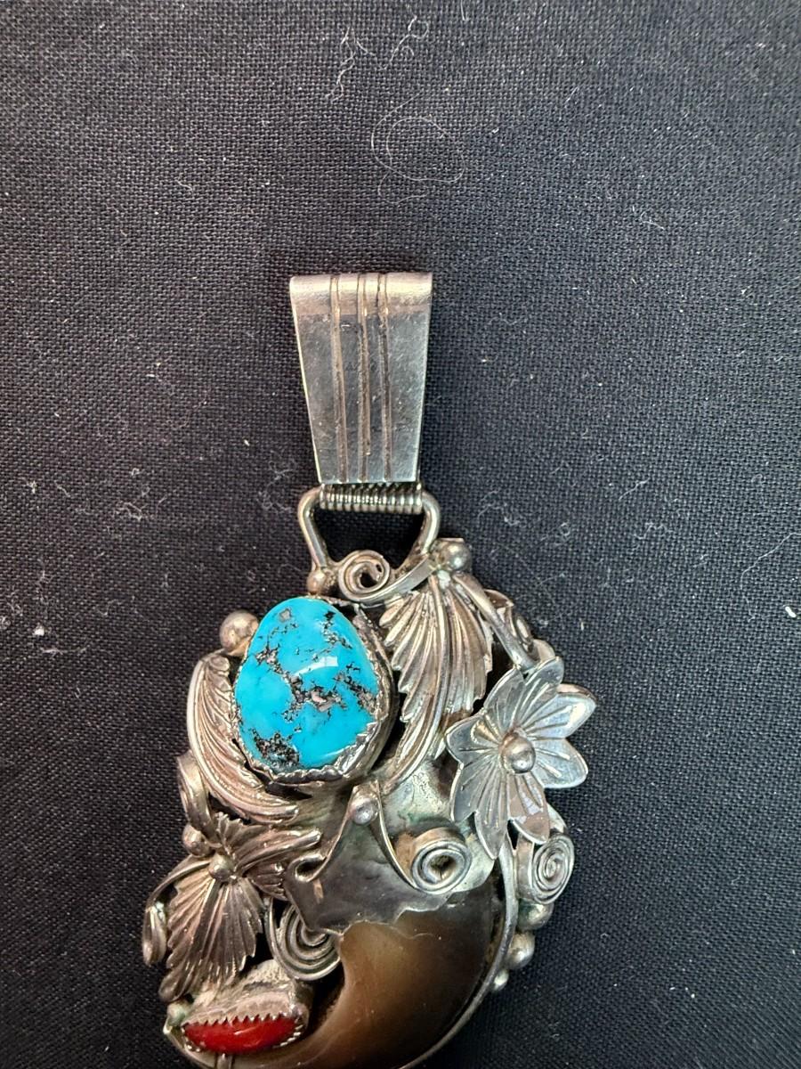 JT STERLING TURQUOISE RED CORAL BEAR CLAW PENDANT