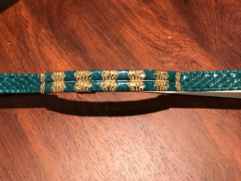 Excellent condition Judith Leiber teal and gold snakeskin belt. 37" L