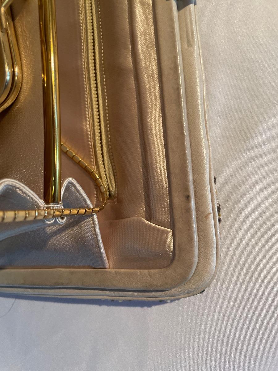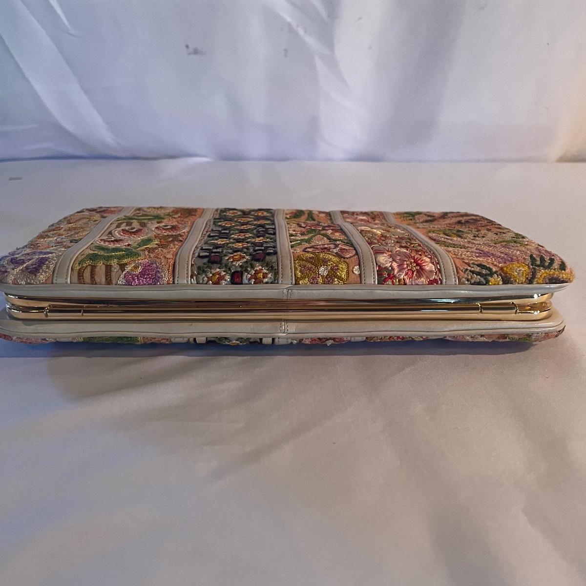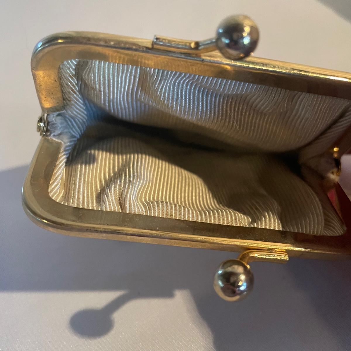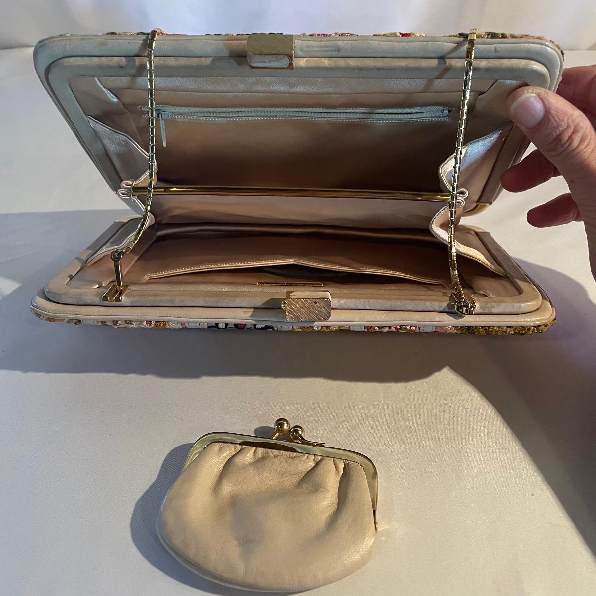 This gorgeous vintage Judith Lieber purse has been well cared for with only some to be expected minor signs of age (shown in last image and barely visible with a little discoloration on the interior frame), no rips or stains. The embroidery that surrounds the outer shell is in very good condition. Purse comes with matching coin purse and a storage bag which will be the reason it’s in such good condition.