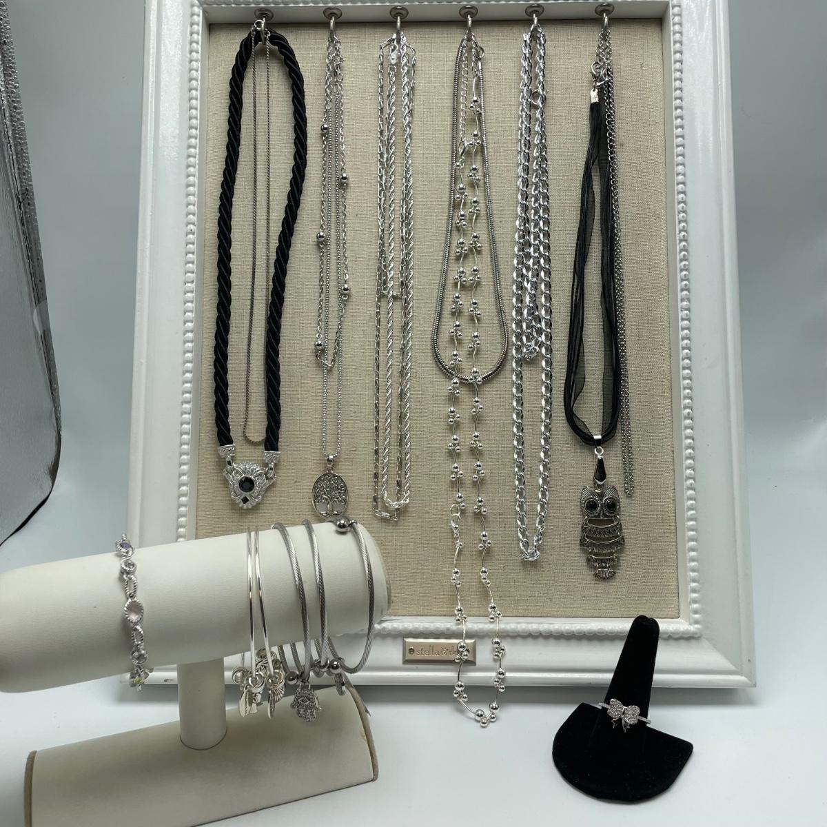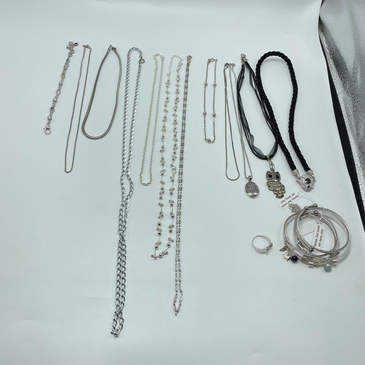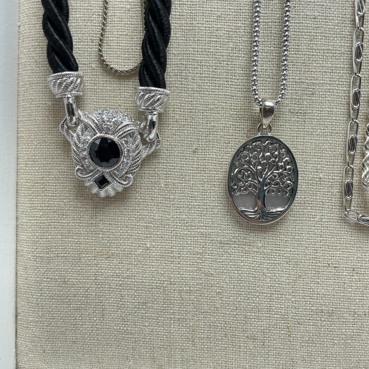 Judith Ripka bracelet with lobster clasp stamped 925 and CZ with multi colored gems. Lot also features eleven necklaces, sizes range between 13” and 34”, the tree pendant and its chain are stamped 925, the other necklaces do not appear to have stamps. Lot includes five more bracelets with charms. The cross does not appear to be marked while the hand and heart charms are stamped 925. The two other bracelets have brand style charms marked 925, but the other charms do not have stamps. Please see photos for all markings found. We cannot guarantee the authenticity of the gemstones. All sales are final. No returns or refunds. Please bid accordingly.