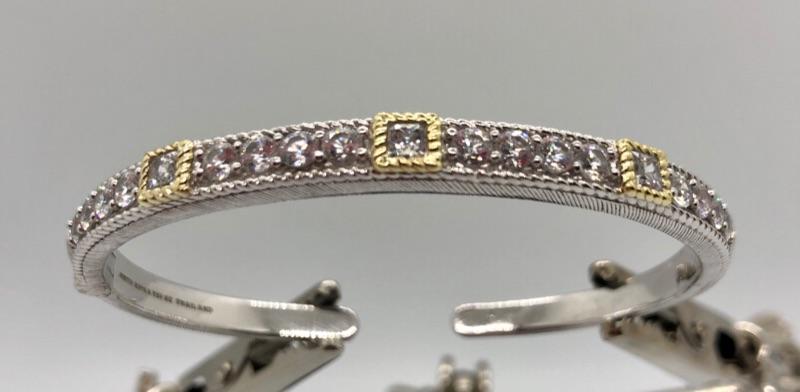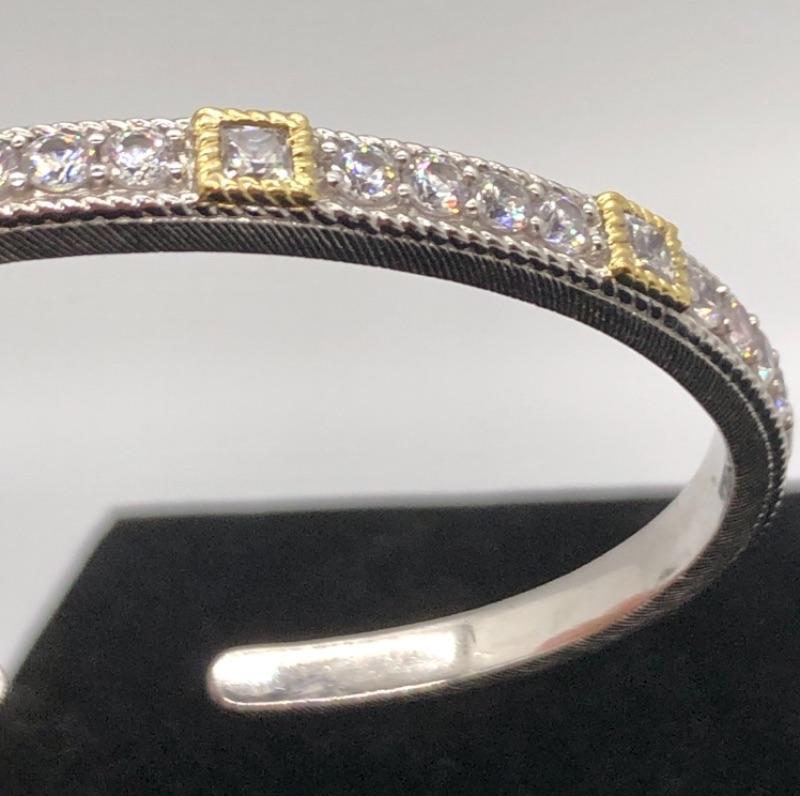Judith Ripka sterling silver hinged bracelet. Textured silver with CZ stones. Three stones are surrounded with gold tone squares. About 2" inside measure. Stamped inside on hinged piece.