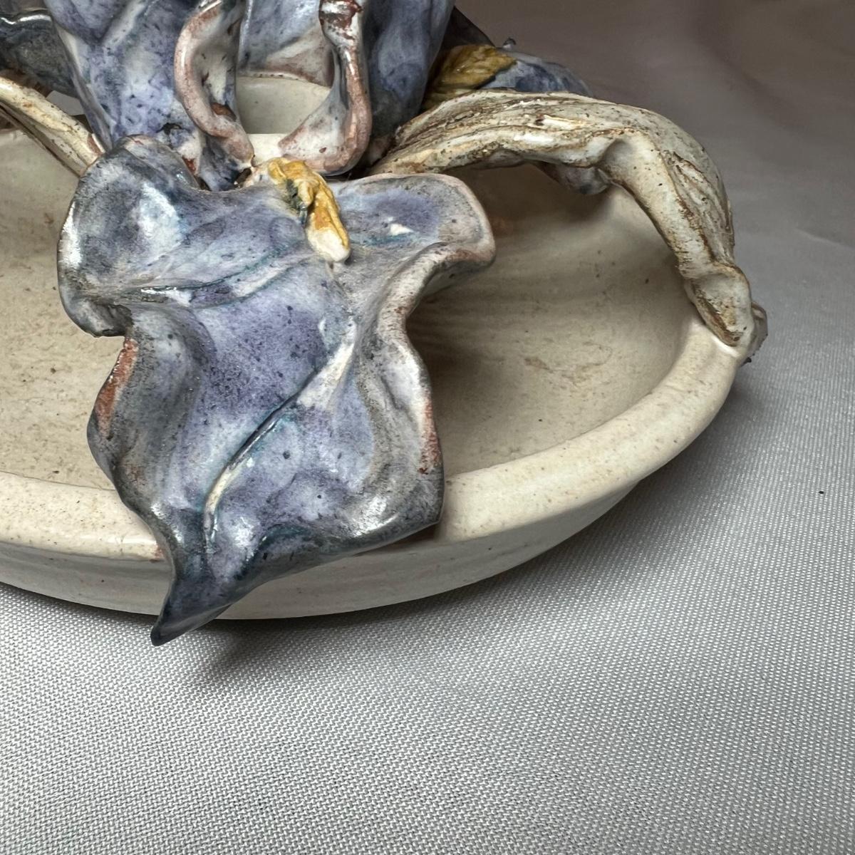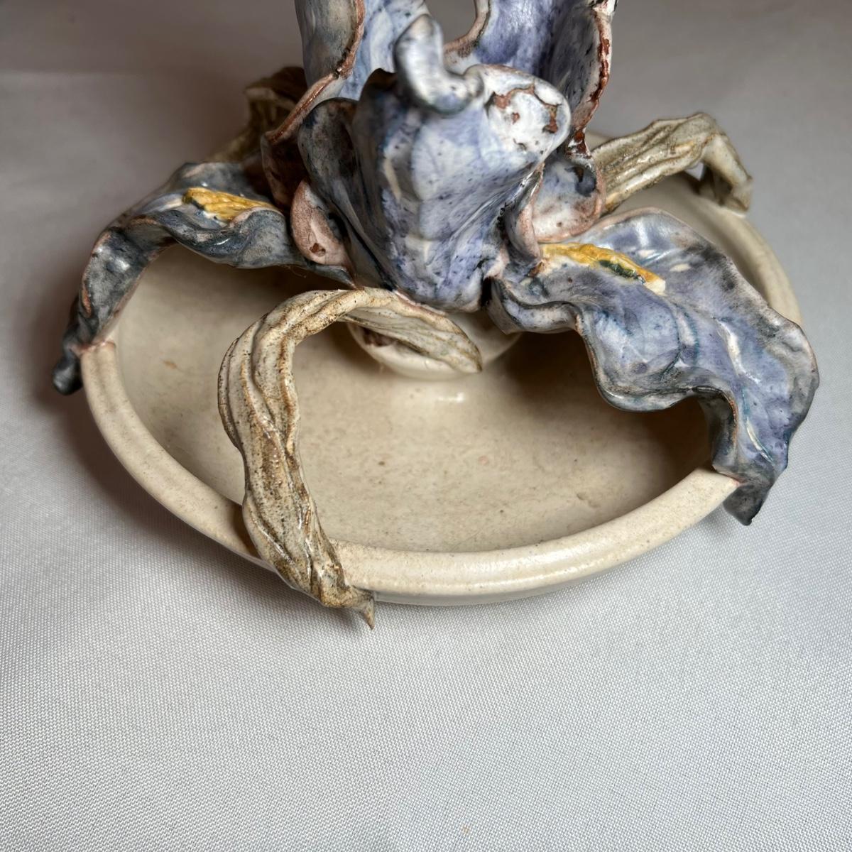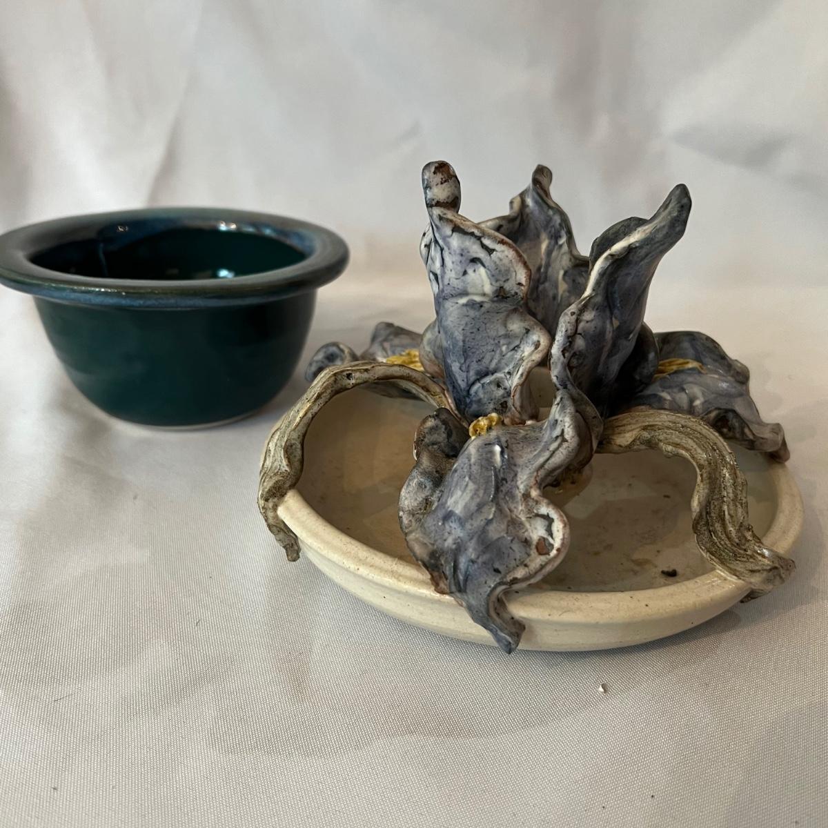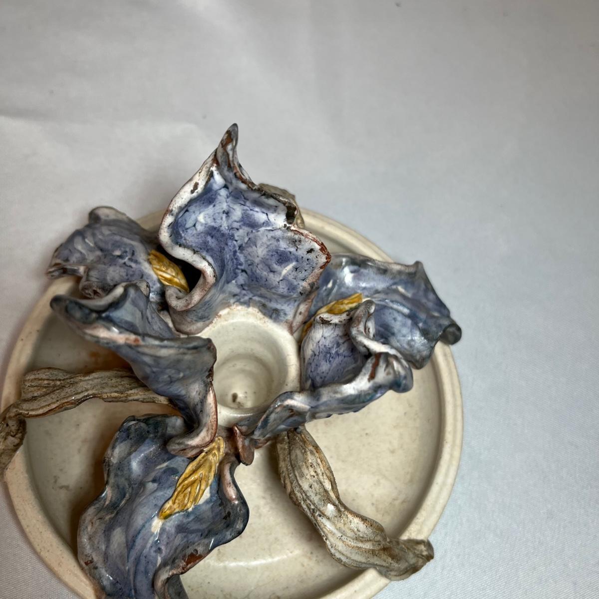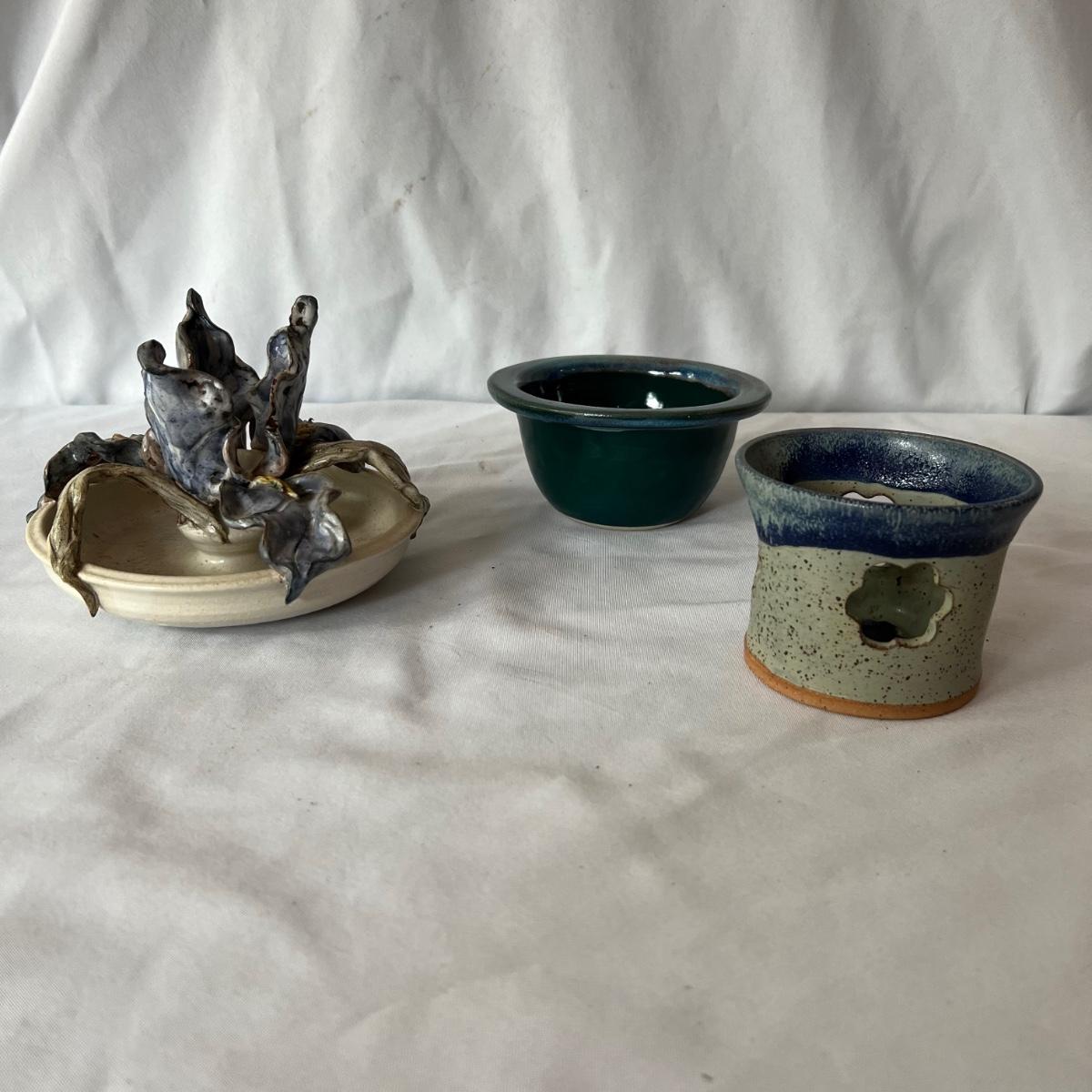 Some beautiful Gatlinburg pottery for you here in this lot that includes a stoneware bowl with three inner tubes most likely for flower stem holding and a stunning purple iris flower candle holder by Judy Jones. Lastly, a Rene marked votive holder. All of these pieces have makers marks, see images.