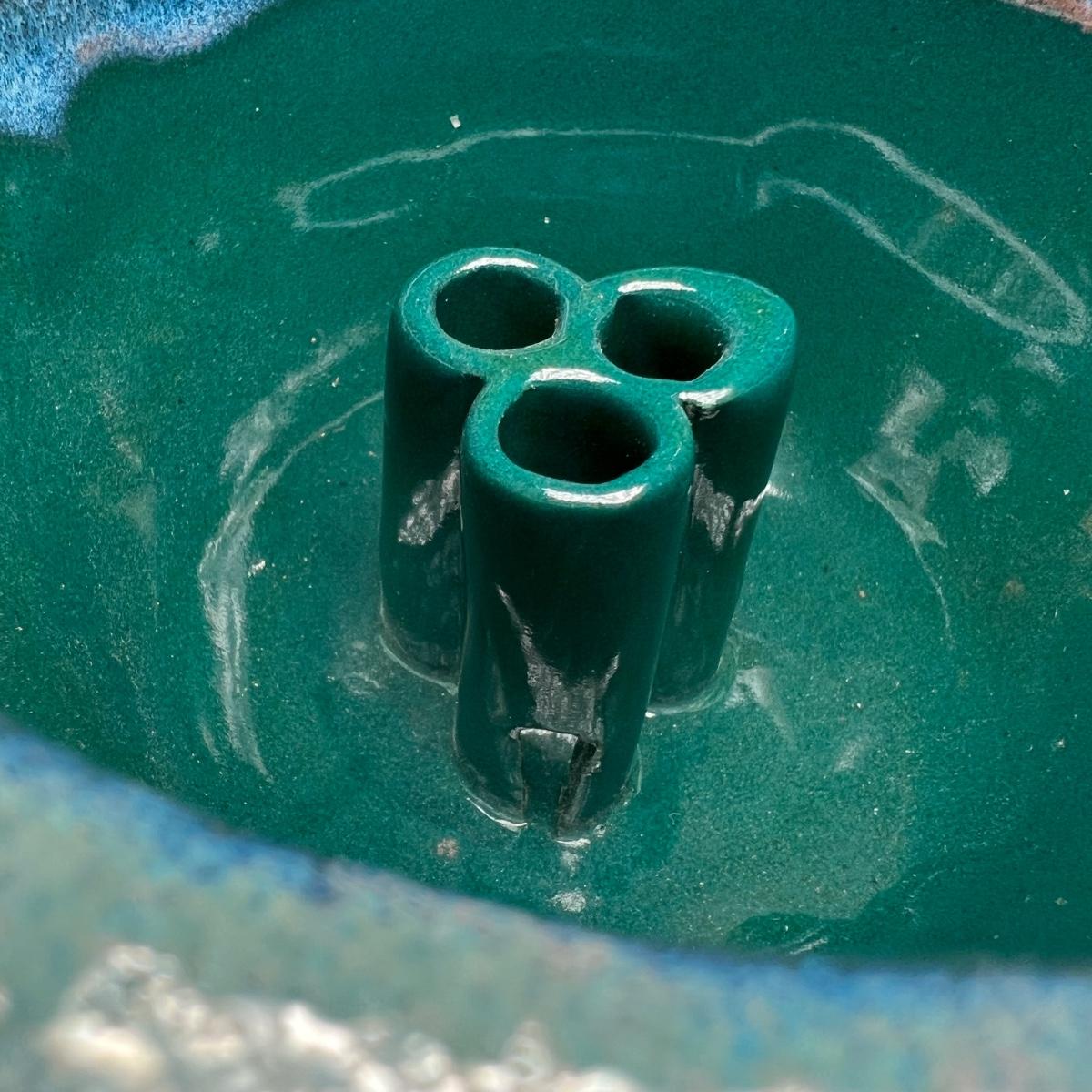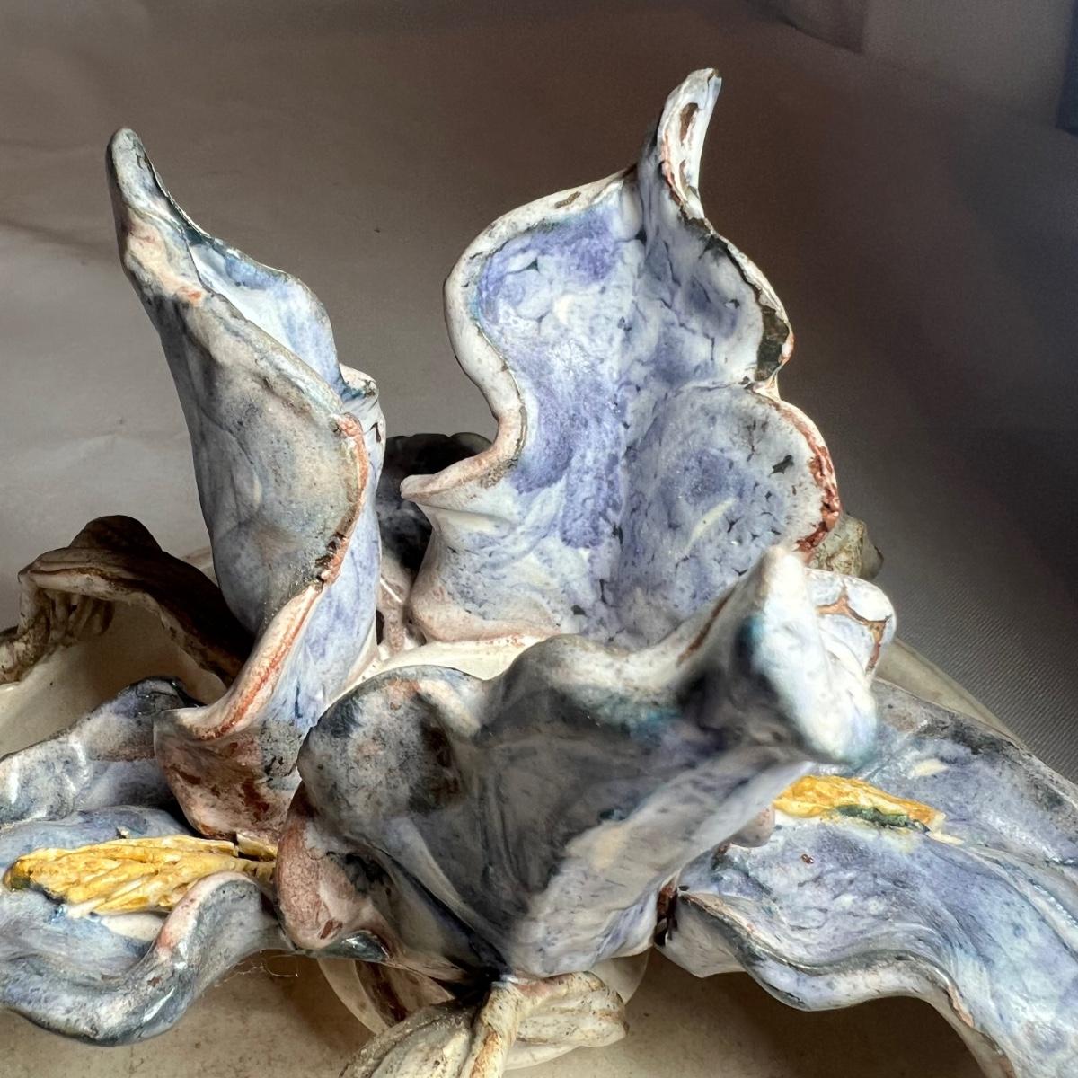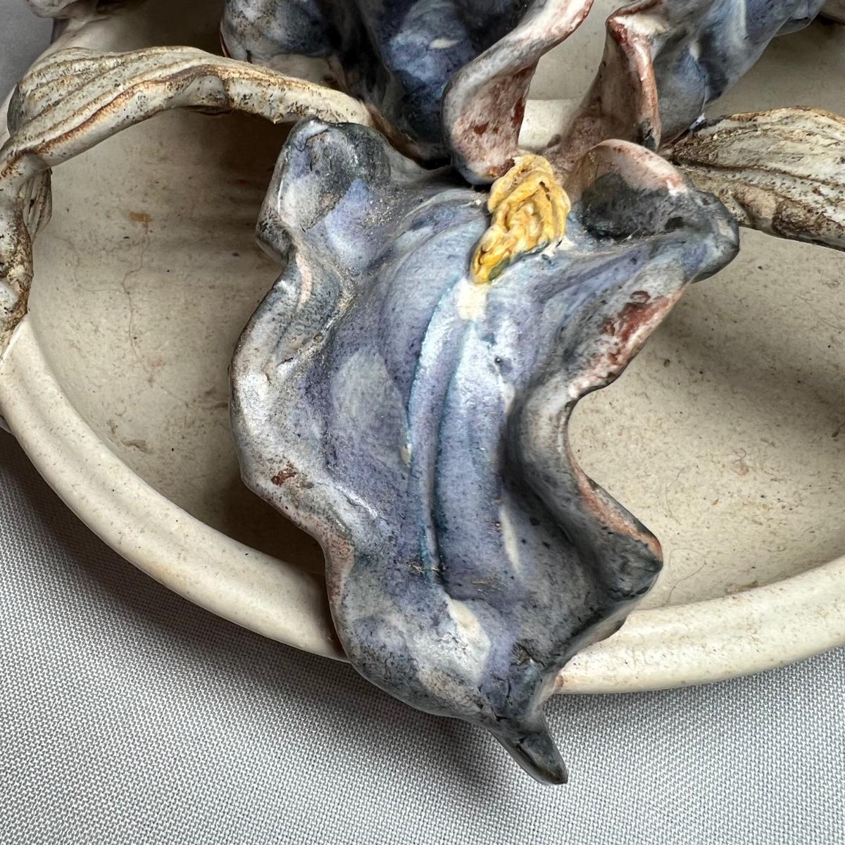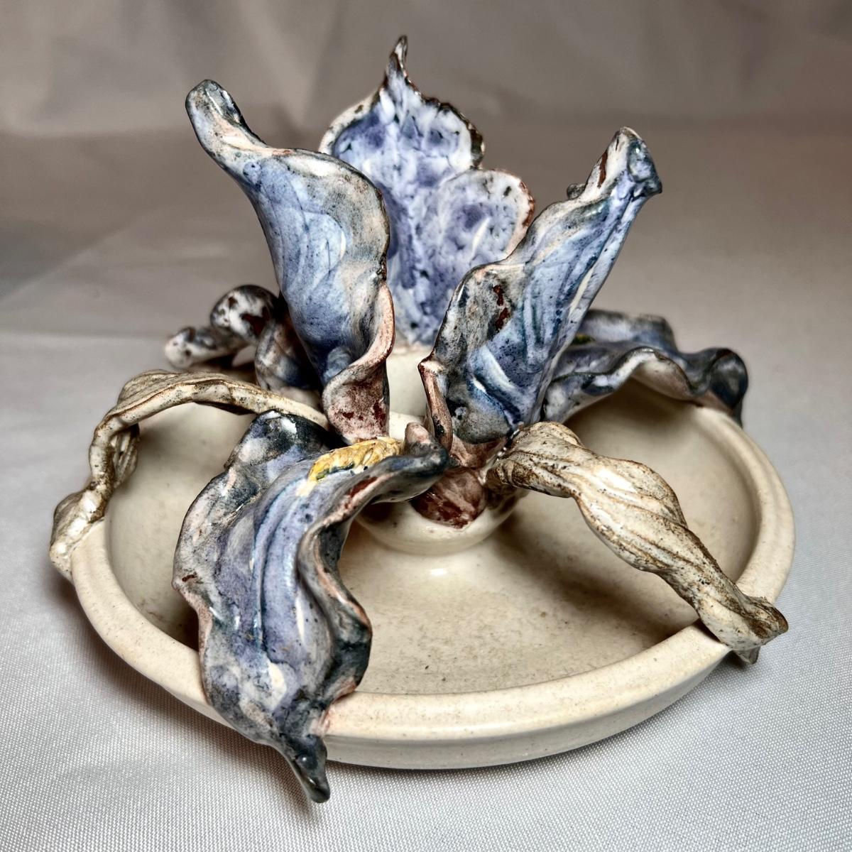 Some beautiful Gatlinburg pottery for you here in this lot that includes a stoneware bowl with three inner tubes most likely for flower stem holding and a stunning purple iris flower candle holder by Judy Jones. Lastly, a Rene marked votive holder. All of these pieces have makers marks, see images.