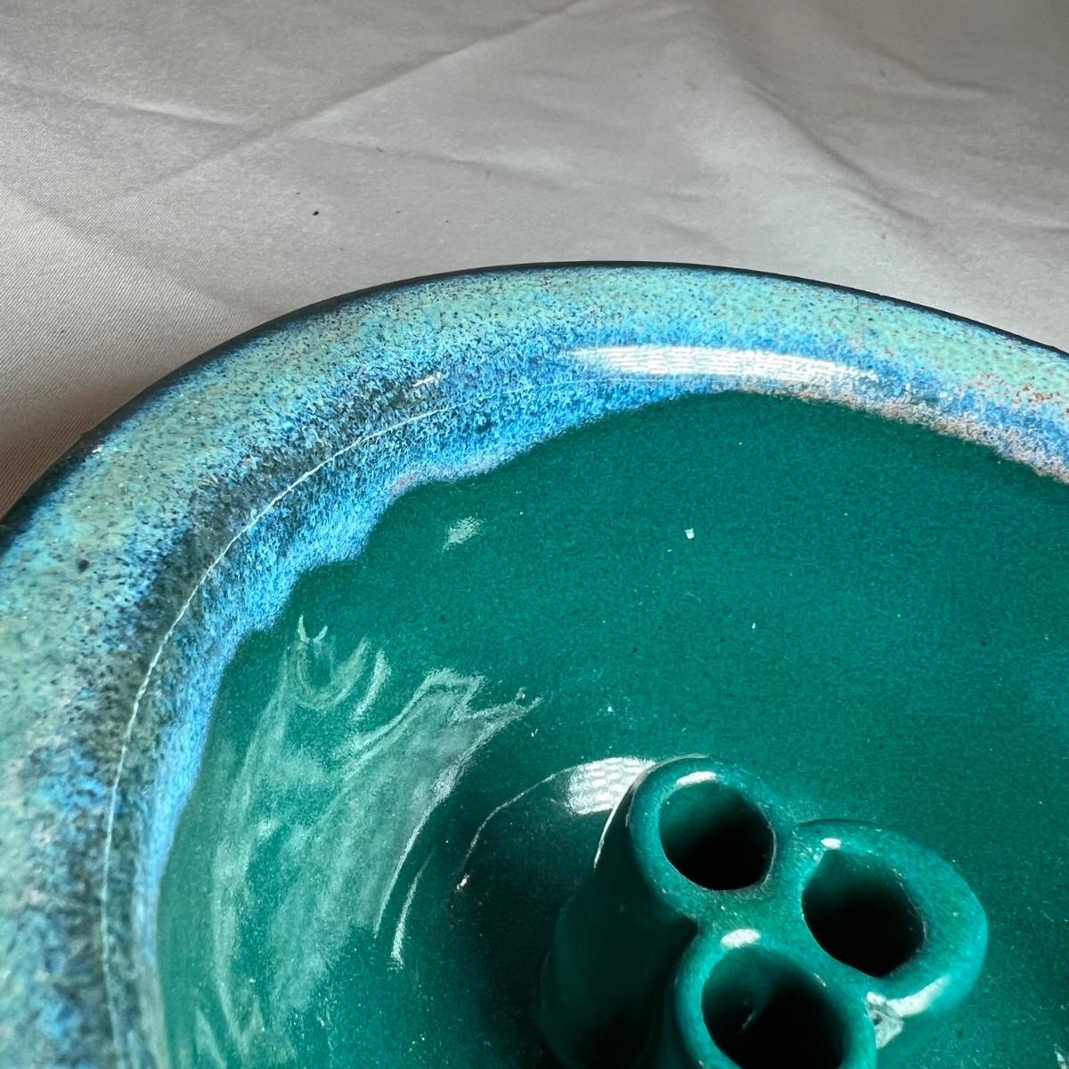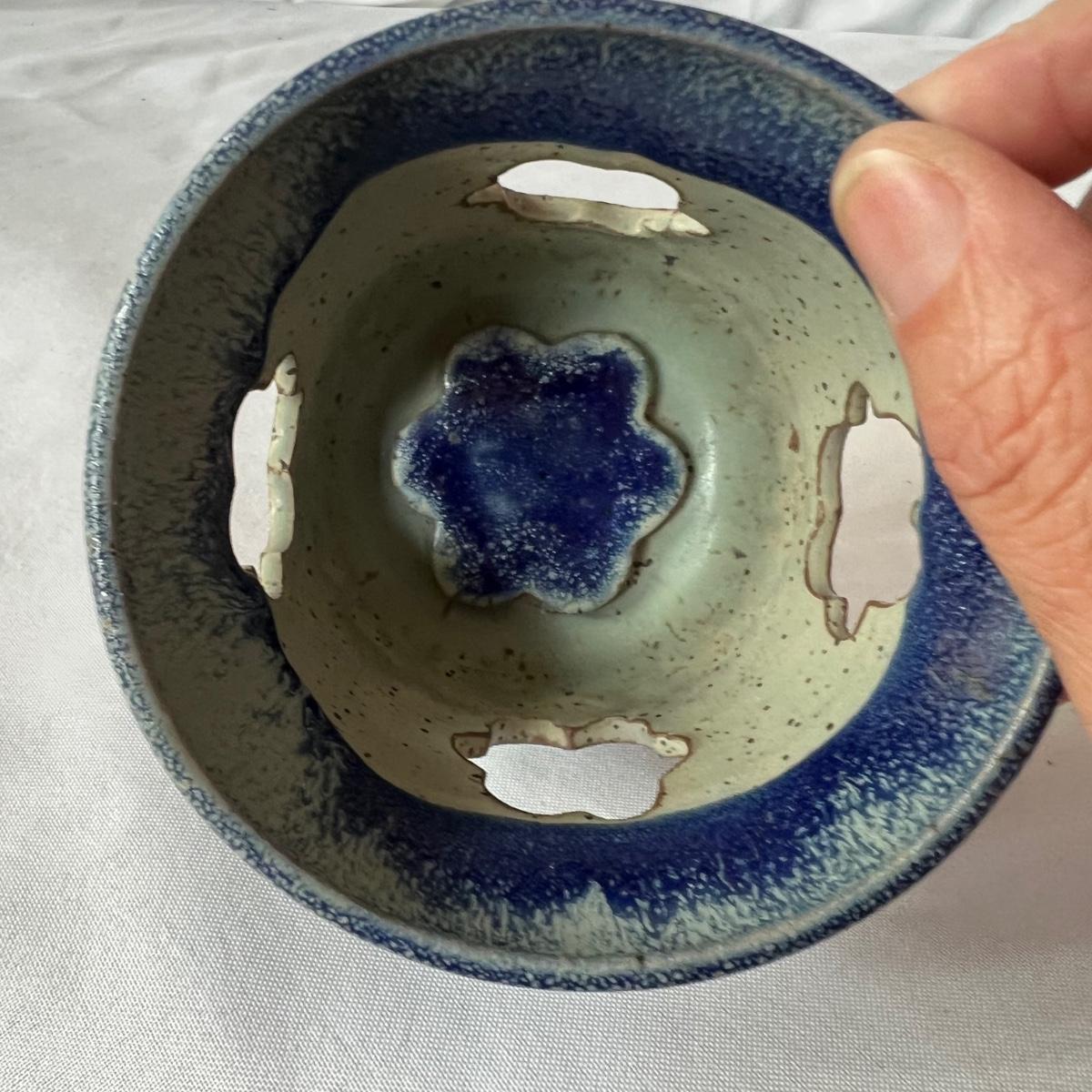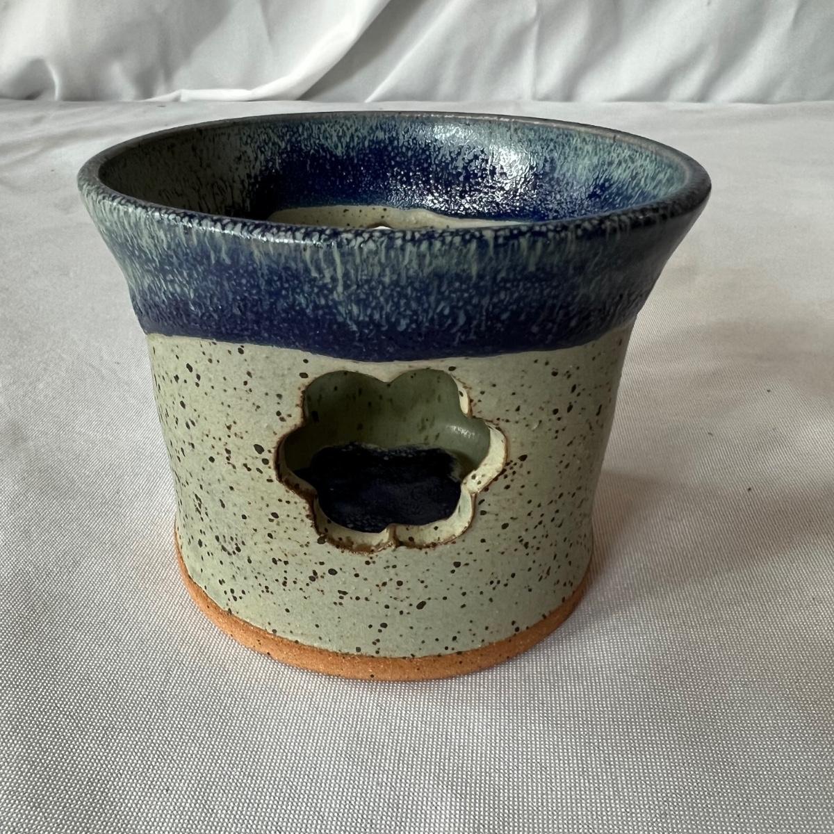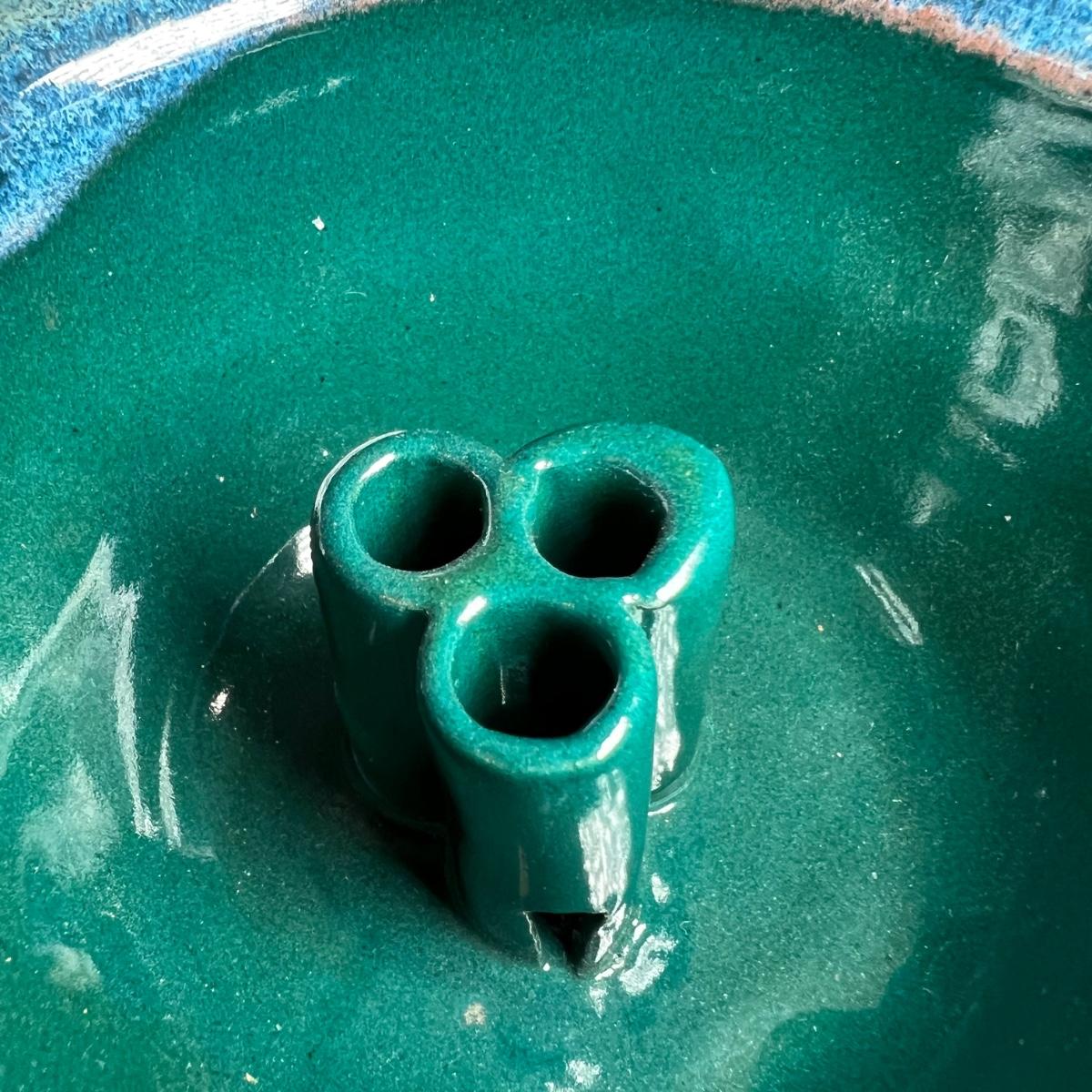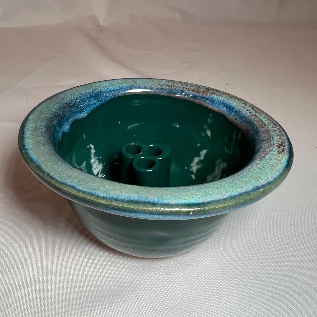 Some beautiful Gatlinburg pottery for you here in this lot that includes a stoneware bowl with three inner tubes most likely for flower stem holding and a stunning purple iris flower candle holder by Judy Jones. Lastly, a Rene marked votive holder. All of these pieces have makers marks, see images.